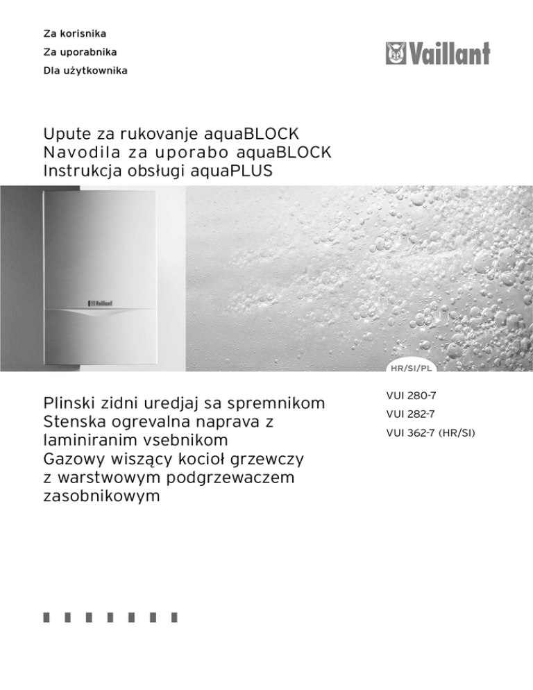 Za korisnika Za uporabnika Dla użytkownika Upute za rukovanje aquaBLOCK Navodila za uporabo aquaBLOCK Instrukcja obsługi aquaPLUS HR/SI/PL Plinski zidni uredjaj sa spremnikom Stenska ogrevalna naprava z laminiranim vsebnikom Gazowy wiszący kocioł grzewczy z warstwowym podgrzewaczem zasobnikowym VUI 280-7 VUI 282-7 VUI 362-7 (HR/SI) SADRŽAJ/VSEBINA Stran Stran Naputci u svezi dokumentacije . . . . . . . . . . . . . . . Uručivanje i čuvanje podloga . . . . . . . . . . . . . . . . . . . . Upotrijebljeni simboli . . . . . . . . . . . . . . . . . . . . . . . . . . 4 4 4 Opombe v zvezi z navodili . . . . . . . . . . . . . . . . . . . Namestitev in hranjenje dokumentacije . . . . . . . . . . . Uporabljeni znaki . . . . . . . . . . . . . . . . . . . . . . . . . . . . . . 5 5 5 1 Općenito . . . . . . . . . . . . . . . . . . . . . . . . . . . . . . . 1.1 Odgovornost . . . . . . . . . . . . . . . . . . . . . . . . . . . . 1.2 Korištenje u skladu s namjenom . . . . . . . . . . . 1.3 Oznaka CE . . . . . . . . . . . . . . . . . . . . . . . . . . . . . 1.4 Uvjeti Jamstva . . . . . . . . . . . . . . . . . . . . . . . . . . 6 6 6 6 6 1 Splošno . . . . . . . . . . . . . . . . . . . . . . . . . . . . . . . . 1.1 Jamstvo . . . . . . . . . . . . . . . . . . . . . . . . . . . . . . . 1.2 Namembna uporaba . . . . . . . . . . . . . . . . . . . . . 1.3 Oznaka CE . . . . . . . . . . . . . . . . . . . . . . . . . . . . . . 1.4 Garancijski pogoji . . . . . . . . . . . . . . . . . . . . . . . . 7 7 7 7 7 2 Sigurnost . . . . . . . . . . . . . . . . . . . . . . . . . . . . . . 2.1 Napomene o sigurnosti . . . . . . . . . . . . . . . . . . . 2.1.1 Postavljanje i podešavanje . . . . . . . . . . . . . . . . 2.1.2 Miris plina . . . . . . . . . . . . . . . . . . . . . . . . . . . . . . 2.1.3 Izmjene na uredjaju i u njegovoj okolini . . . . . 2.1.4 Eksplozivne i lako zapaljive tvari . . . . . . . . . . . 2.1.5 Kontrola . . . . . . . . . . . . . . . . . . . . . . . . . . . . . . . 2.1.6 Oplata u obliku ormarića . . . . . . . . . . . . . . . . . . 2.2 Napomene o mjerama opreza . . . . . . . . . . . . . 2.2.1 Zaštita od korozije . . . . . . . . . . . . . . . . . . . . . . . 2.2.2 Kontrola razine vode . . . . . . . . . . . . . . . . . . . . . 2.2.3 Punjenje sustava centralnog grijanja . . . . . . . . 2.2.4 Agregat za napajanje u slučaju nestanka struje 2.2.5 Slabo brtvljenje odn. propuštanje vode . . . . . . 2.2.6 Priključni tlak vode za piće . . . . . . . . . . . . . . . . 8 8 8 8 8 8 8 8 10 10 10 10 10 10 10 2 Za 2.1 2.1.1 2.1.2 2.1.3 2.1.4 2.1.5 2.1.6 2.2 2.2.1 2.2.2 2.2.3 2.2.4 2.2.5 2.2.6 vašo varnost . . . . . . . . . . . . . . . . . . . . . . . . . Navodila za varno uporabo . . . . . . . . . . . . . . . . Montaža in nastavitev . . . . . . . . . . . . . . . . . . . . Vonj po plinu . . . . . . . . . . . . . . . . . . . . . . . . . . . Spremembe v neposredni bližini naprave . . . . Eksplozivne in lahko vnetljive snovi . . . . . . . . . Pregledovanje . . . . . . . . . . . . . . . . . . . . . . . . . . . Vgradnja naprave v omaro . . . . . . . . . . . . . . . . Nasveti za zanesljivo obratovanje . . . . . . . . . . Zaščita pred korozijo . . . . . . . . . . . . . . . . . . . . . Preverjanje stanja vode . . . . . . . . . . . . . . . . . . . Polnjenje ogrevalnega sistema z vodo . . . . . . Generator . . . . . . . . . . . . . . . . . . . . . . . . . . . . . . Slabo tesnjenje . . . . . . . . . . . . . . . . . . . . . . . . . . Pitna voda-tlak priključka . . . . . . . . . . . . . . . . . 9 9 9 9 9 9 9 9 11 11 11 11 11 11 11 3 Uporaba naprave . . . . . . . . . . . . . . . . . . . . . . . . 3.1 Pregled posluževalnih elementov . . . . . . . . . . . 3.1.1 Posluževalni elementi . . . . . . . . . . . . . . . . . . . . 3.1.2 Prikazovalnik . . . . . . . . . . . . . . . . . . . . . . . . . . . 3.2 Preizkusi pred vklopom . . . . . . . . . . . . . . . . . . . 3.2.1 Odpiranje zapornih naprav . . . . . . . . . . . . . . . . 3.2.2 Preverjanje ravni vode . . . . . . . . . . . . . . . . . . . 3.3 Priprava tople vode . . . . . . . . . . . . . . . . . . . . . . 3.3.1 Vklop in izklop funkcije topli zagon . . . . . . . . . 3.3.2 Topla voda - priključki . . . . . . . . . . . . . . . . . . . . 3.4 Ogrevanje . . . . . . . . . . . . . . . . . . . . . . . . . . . . . . 3.4.1 Nastavitev odhodne temperature . . . . . . . . . . 3.4.2 Nastavitev zunanjega regulatorja . . . . . . . . . . 3.5 Izpis stanj naprave . . . . . . . . . . . . . . . . . . . . . . . 3.6 Odprava motenj . . . . . . . . . . . . . . . . . . . . . . . . . 3.6.1 Motnje pri vžigu . . . . . . . . . . . . . . . . . . . . . . . . . 3.6.2 Motnje pri pripravi tople vode . . . . . . . . . . . . . 3.6.3 Motnje na dovodu svežega zraka/odvodu dimnih plinov VUI 280-7 . . . . . . . . . . . . . . . . . . 3.6.4 Motnje na dovodu svežega zraka/odvodu dimnih plinov VUI 282-7, 362-7 . . . . . . . . . . . . . 3.7 Izklop naprave . . . . . . . . . . . . . . . . . . . . . . . . . . 3.7.1 Izklop ogrevanja (poletni režim) . . . . . . . . . . . . 3.7.2 Popoln izklop . . . . . . . . . . . . . . . . . . . . . . . . . . . 3.8 Vzdrževanje in pregledovanje . . . . . . . . . . . . . . 3.9 Zaščita pred zmrzovanjem . . . . . . . . . . . . . . . . 3.10 Iskanje napak . . . . . . . . . . . . . . . . . . . . . . . . . . . 3.11 Polnjenje naprave in ogrevalnega sistema . . . 3.12 Praznjenje naprave na strani ogrevalnega sistema . . . . . . . . . . . . . . . . . . . . . . . . . . . . . . . . 3.13 Polnjenje naprave na strani sanitarne vode . . 3.14 Praznjenje naprave na strani sanitarne vode . 13 13 13 13 15 15 15 17 17 19 19 19 21 21 23 23 23 3 Rukovanje . . . . . . . . . . . . . . . . . . . . . . . . . . . . . . 12 3.1 Pregled . . . . . . . . . . . . . . . . . . . . . . . . . . . . . . . . 12 3.1.1 Elementi za rukovanje . . . . . . . . . . . . . . . . . . . . 12 3.1.2 Displej . . . . . . . . . . . . . . . . . . . . . . . . . . . . . . . . . 12 3.2 Ispitivanja prije puštanja u pogon . . . . . . . . . .