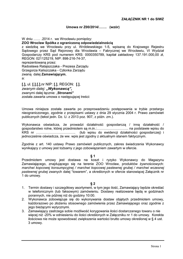ZAŁĄCZNIK NR 1 do SIWZ Umowa nr Z00/2014/……. (wzór) W dniu …… .2014 r. we Wrocławiu pomiędzy: ZOO Wrocław Spółka z ograniczoną odpowiedzialnością z siedzibą we Wrocławiu przy ul. Wróblewskiego 1-5, wpisaną do Krajowego Rejestru Sądowego przez Sąd Rejonowy dla Wrocławia – Fabrycznej we Wrocławiu, VI Wydział Gospodarczy KRS pod numerem KRS: 0000350789, kapitał zakładowy 137.191.000,00 zł, REGON: 021125219, NIP: 898-216-74-37, reprezentowaną przez: Radosława Ratajszczaka - Prezesa Zarządu Grzegorza Kaliszczaka - Członka Zarządu zwaną dalej Zamawiającym, a: [.], ul. [.],[.],nr NIP: [.], REGON: [.], zwanym dalej: „Wykonawcą”, zwanymi dalej łącznie: „Stronami” została zawarta umowa o następującej treści: Umowa niniejsza została zawarta po przeprowadzeniu postępowania w trybie przetargu nieograniczonego, zgodnie z przepisami ustawy z dnia 29 stycznia 2004 r. Prawo zamówień publicznych (tekst jedn. Dz. U. z 2013 poz. 907, z późn. zm.). Wykonawca oświadcza, że prowadzi działalność gospodarczą / inną działalność / gospodarstwo rolne, której przedmiotem są m.in.:………………………. na podstawie wpisu do KRS nr …………………………….. (lub wpisu do ewidencji działalności gospodarczej) i jednocześnie oświadcza, że ww. wpis jest zgodny z aktualnym stanem faktycznym. Zgodnie z art. 140 ustawy Prawo zamówień publicznych, zakres świadczenia Wykonawcy wynikający z umowy jest tożsamy z jego zobowiązaniem zawartym w ofercie. §1 Przedmiotem umowy jest dostawa na koszt i ryzyko Wykonawcy do Magazynu Zamawiającego, znajdującego się na terenie ZOO Wrocław, produktów żywnościowych: marchwi kopcowej konsumpcyjnej / marchwi kopcowej pastewnej grubej / marchwi wczesnej pastewnej grubej zwanych dalej “towarem”, a określonych w ofercie stanowiącej Załącznik nr 1 do umowy. 1. 2. 3. §2 Termin dostawy i szczegółowy asortyment, w tym jego ilość, Zamawiający będzie określać w telefonicznym (lub faksowym) zamówieniu. Dostawy realizowane będą w godzinach porannych, nie później niż do godziny 10:00. Wykonawca zobowiązuje się do wykonywania dostaw objętych przedmiotem umowy, każdorazowo po złożeniu stosownego zamówienia przez Zamawiającego oraz zgodnie z jego bieżącymi wytycznymi. Zamawiający zastrzega sobie możliwość korygowania ilości dostarczanego towaru o nie więcej niż -20% w odniesieniu do ilości określonych w Załączniku nr 1 do umowy. Korekta ilościowa nie może spowodować zwiększenia wartości brutto umowy określonej w § 4 ust. 3 umowy. Strona 1 4. 1. 2. 1. 2. 3. 1. 2. 3. 4. 5. Jeżeli w wyniku korekty zmniejszona zostanie ilość dostarczonego towaru w stosunku do ilości określonej w umowie, cena ulegnie proporcjonalnemu zmniejszeniu. §3 Wykonawca oświadcza, że przedmiot umowy odpowiada następującym wymaganiom: Wszystkie rodzaje marchwi powinny spełniać następujące warunki: a) Nie zawierać środków chemicznych, a maksymalnie do dopuszczalnej ich ilości, zgodnie z Polską Normą i Rozporządzeniem Ministra Zdrowia z dnia 16 kwietnia 2004 r. (Dz.U. Nr 85, poz. 801 z późn. zm.) w sprawie najwyższych dopuszczalnych poziomów pozostałości chemicznych środków ochrony roślin, które mogą znajdować się w środkach spożywczych lub na ich powierzchni, b) Posiadać charakterystyczny kształt, barwę, zapach i smak, c) Być myte, czyste, d) Być workowane. Nie mają znaczenia odmiany marchwi. Strony ustalają, że jakość towaru odpowiadać będzie wymaganiom Polskich Norm i klasyfikacji wydawanych na podstawie ustawy z dnia 29.06.1995 r. o statystyce publicznej. §4 Ceny jednostkowe towaru określa oferta Wykonawcy stanowiąca Załącznik nr 1 do umowy. Ceny nie ulegną zmianie przez okres realizacji umowy. Strony zgodnie postanawiają, że całkowita wartość objętych umową dostaw nie przekroczy kwoty …… brutto (słownie: ……). Z chwilą wyczerpania wskazanej kwoty umowa ulega rozwiązaniu. §5 Strony zobowiązane są, każda w swoim zakresie, do współdziałania przy wykonywaniu niniejszej umowy. §6 Wydanie i odbiór towaru będzie dokonane w siedzibie Zamawiającego na podstawie protokołu zdawczo-odbiorczego, podpisanego przez obie strony. W przypadku stwierdzenia podczas odbioru wad w dostarczonym towarze (towar nie spełniający wymagań z § 3 umowy, towar nieświeży) lub braków w jego ilości Wykonawca zobowiązany będzie do jego wymiany na nowy lub zobowiązany będzie dostarczyć brakujący towar w terminie 1 dnia. W razie stwierdzenia wad jakościowych lub ilościowych po odebraniu towaru, Zamawiający zobowiązuje się zawiadomić Wykonawcę w ciągu 7 dni od daty dostawy. Wykonawca zobowiązuje się rozpatrzyć reklamację i jeżeli wada nie wynika z przyczyn leżących po stronie Zamawiającego, wymienić reklamowany towar na wolny od wad w terminie 3 dni od daty zawiadomienia o wadzie. W dniu odbioru towaru przez Zamawiającego od Wykonawcy na Zamawiającego przechodzi własność towaru. §7 1. Za dostarczony i odebrany każdorazowo towar Zamawiający zapłaci Wykonawcy należność wyliczoną w oparciu o ceny jednostkowe z Załącznika nr 1 do umowy. 2. Należność płatna będzie w terminie 30 dni od daty otrzymania faktury, wystawionej na podstawie protokołu zdawczo-odbiorczego, podpisanego bez zastrzeżeń przez obie strony, przez Zamawiającego przelewem na rachunek Wykonawcy. Nr rachunku: ……………………………………………………………………………… 3. Strony postanawiają, że zapłata należności następuje z chwilą obciążenia rachunku Zamawiającego. 1. §8 Wykonawca zapłaci Zamawiającemu kary umowne z następujących tytułów: Strona 2 1) w przypadku niedostarczenia towaru w terminie albo dostarczenia towaru tylko w części – w wysokości 0,2% wartości brutto towaru, którego opóźnienie dotyczy za każdy dzień opóźnienia, 2) w przypadku dostarczenia towaru