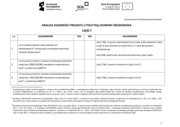 ZAŁĄCZNIK NR 6 DO REGULAMINU KONKURSU ANALIZA ZGODNOŚCI PROJEKTU Z POLITYKĄ OCHRONY ŚRODOWISKA CZĘŚĆ I L.P. ZAGADNIENIE TAK NIE WYJAŚNIENIE JEŻELI TAK, TO NALEŻY ODPOWIEDZIEĆ NA PYTANIA 2–8 W NINIEJSZEJ TABELI CZY W RAMACH PROJEKTU REALIZOWANE JEST 1 1 PRZEDSIĘWZIĘCIE WYMAGAJĄCE STOSOWANIA PRZEPISÓW (CZĘŚĆ I) ORAZ WYPEŁNIĆ W CZĘŚĆ II (PKT 1, 7 ORAZ 8) ZGODNIE Z WYJAŚNIENIAMI. OCHRONY ŚRODOWISKA? JEŻELI NIE, BENEFICJENT NIE WYPEŁNIA POZOSTAŁEJ CZĘŚCI TABELI. CZY REALIZACJA PROJEKTU WYMAGA STOSOWANIA PRZEPISÓW 2 DYREKTYWY 2001/42/WE PARLAMENTU EUROPEJSKIEGO I 2 RADY JEŻELI TAK, TO NALEŻY WYPEŁNIĆ W CZĘŚCI II PKT 2. („DYREKTYWA SOOŚ”)? CZY REALIZACJA PROJEKTU WYMAGA STOSOWANIA PRZEPISÓW 3 2011/92/WE PARLAMENTU EUROPEJSKIEGO I („DYREKTYWA OOŚ”)? DYREKTYWY 3 RADY JEŻELI TAK, TO NALEŻY WYPEŁNIĆ W CZĘŚCI II PKT 3. 1 Przedsięwzięcie należy rozumieć zgodnie z ustawą z dnia 3 października 2008 r. o udostępnianiu informacji o środowisku i jego ochronie, udziale społeczeństwa w ochronie środowiska oraz o ocenach oddziaływania na środowisko (t.j. Dz. U. z 2013 r. poz. 1235, z późn. zm). W przypadku, gdy projekt składa się z więcej niż jednego przedsięwzięcia, dla każdego takiego przedsięwzięcia należy odrębnie wypełnić część II, przy czym pkt 1, 7 oraz 8 w części II mogą być identyczne dla wszystkich przedsięwzięć wchodzących w skład projektu. 2 Dyrektywa 2001/42/WE Parlamentu Europejskiego i Rady z dnia 27 czerwca 2001 r. w sprawie oceny wpływu niektórych planów i programów na środowisko (Dz.U. 197 z 21.7.2001, s. 30). W punkcie tym, należy wskazać, czy projekt jest realizowany w wyniku planu lub programu innego niż Program Operacyjny Inteligentny Rozwój. 3 Dyrektywa Parlamentu Europejskiego i Rady 2011/92/UE z dnia 13 grudnia 2011 r. w sprawie oceny skutków wywieranych przez niektóre przedsięwzięcia publiczne i prywatne na środowisko (Dz.U. L 26 z 28.1.2012, s. 1). Dyrektywa 2011/92/WE została zmieniona dyrektywą 2014/52/UE z dnia 16 kwietnia 2014 r. zmieniająca dyrektywę 2011/92/UE w sprawie oceny skutków wywieranych przez niektóre przedsięwzięcia publiczne i prywatne na środowisko (Dz.U. L 124/1 z 25.4.2014). Termin transpozycji do polskiego porządku prawnego dyrektywy 2014/52/UE mija 17 maja 2017 r. W punkcie należy sprawdzić, czy przedsięwzięcie realizowane w ramach projektu zostało wymienione w załącznikach do dyrektywy OOŚ. 1 L.P. ZAGADNIENIE TAK NIE WYJAŚNIENIE CZY REALIZACJA PROJEKTU WYMAGA STOSOWANIA PRZEPISÓW DYREKTYWY RADY 92/43/EWG W SPRAWIE OCHRONY 4 4 SIEDLISK PRZYRODNICZYCH ORAZ DZIKIEJ FAUNY I FLORY JEŻELI TAK, TO NALEŻY WYPEŁNIĆ W CZĘŚCI II PKT 4. (DYREKTYWA SIEDLISKOWA); OCENA ODDZIAŁYWANIA NA OBSZARY NATURA 2000? CZY REALIZACJA PROJEKTU WYMAGA STOSOWANIA PRZEPISÓW 5 DYREKTYWY 2000/60/WE PARLAMENTU EUROPEJSKIEGO I 5 („RAMOWA DYREKTYWA WODNA”); OCENA ODDZIAŁYWANIA NA JEDNOLITĄ CZĘŚĆ WÓD? RADY JEŻELI TAK, TO NALEŻY WYPEŁNIĆ W CZĘŚCI II PKT 5. CZY REALIZACJA PROJEKTU WYMAGA STOSOWANIA PRZEPISÓW DYREKTYWY 2008/98/WE PARLAMENTU EUROPEJSKIEGO I 6 6 RADY („DYREKTYWA RAMOWA W SPRAWIE ODPADÓW”) – JEŻELI TAK, TO NALEŻY WYPEŁNIĆ W CZĘŚCI II PKT 6.2. PROJEKTY W SEKTORZE GOSPODAROWANIA ODPADAMI ORAZ POD DYREKTYWĘ SKŁADOWISKOWĄ 7 ? 4 Dyrektywa Rady 92/43/EWG z dnia 21 maja 1992 r. w sprawie ochrony siedlisk przyrodniczych oraz dzikiej fauny i flory (Dz.U. L 206 z 22.7.1992, s. 7.). W punkcie tym należy wskazać, czy projekt może samodzielnie lub w połączeniu z innymi projektami w istotny sposób negatywnie wpłynąć na obszary, które są lub mogą być objęte siecią Natura 2000. Oddziaływanie na w/w obszary może mieć projekt realizowany nie tylko w obrębie tego obszaru, ale również poza nim. 5 Dyrektywa 2000/60/WE Parlamentu Europejskiego i Rady z dnia 23 października 2000 r. ustanawiająca ramy wspólnotowego działania w dziedzinie polityki wodnej (Dz.U. L 327 z 22.12.2000, s. 1). Punkt ten należy wypełnić, jeżeli odnosi się do przedsięwzięć, w których doszło do zmiany charakterystyki fizycznej wód powierzchniowych lub zmiany poziomu części wód podziemnych, które pogorszają stan jednolitej części wód lub uniemożliwiają osiągnięcie dobrego stanu wód/potencjału. W punkcie tym należy wskazać, czy doszło do przeprowadzenia oceny wpływu na środowisko wodne przedsięwzięcia pod kątem wymagań Ramowej Dyrektywy Wodnej. 6 Dyrektywa Parlamentu Europejskiego i Rady 2008/98/WE z dnia 19 listopada 2008 r. w sprawie odpadów oraz uchylająca niektóre dyrektywy (Dz.U. L 312 z 22.11.2008, s. 3). Punkt ten należy wypełnić, jeżeli projekt jest realizowany w sektorze gospodarowania odpadami. 7 Dyrektywa Rady 1999/31/WE z dnia 26 kwietnia 1999 r. w sprawie składowania odpadów. Punkt ten należy wypełnić, jeżeli projekt jest realizowany w sektorze gospodarowania odpadami. 2 L.P. ZAGADNIENIE TAK NIE WYJAŚNIENIE CZY REALIZACJA PROJEKTU WYMAGA STOSOWANIA PRZEPISÓW 2010/75/UE PARLAMENTU EUROPEJSKIEGO I („DYREKTYWA W SPRAWIE EMISJI PRZEMYSŁOWYCH”) – DYREKTYWY 7 8 RADY JEŻELI TAK, TO NALEŻY WYPEŁNIĆ W CZĘŚCI II PKT 6.3. PROJEKTY WYMAGAJĄCE UDZIELENIA POZWOLENIA ZGODNIE Z PRZEDMIOTOWĄ DYREKTYWĄ? 8 CZY REALIZACJA PROJEKTU WYMAGA STOSOWANIA PRZEPISÓW 9 ŚRODOWISKOWYCH Z INNYCH DYREKTYW ? JEŻELI TAK, TO NALEŻY WYPEŁNIĆ W CZĘŚCI II PKT 6.4. 8 Dyrektywa Parlamentu Europejskiego i Rady 2010/75/UE z dnia 24 listopada 2010 r. w sprawie emisji przemysłowych (zintegrowane zapobieganie zanieczyszczeniom i ich kontrola) (Dz.U. L 334 z 17.12.2010, s. 17). Punkt ten dotyczy projektów wymagających udzielenia pozwolenia zgodnie z przedmiotową dyrektywą. 9 Należy wypełnić, jeżeli wnioskodawca zobowiązany jest (np. ze względu na branżę, w której prowadzi działalność) do stosowania przepisów środowiskowych określonych w innych niż wyżej wymienione dyrektywach UE. 3 C