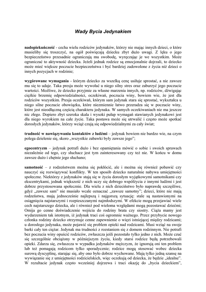 Wady Bycia Jedynakiem nadopiekuńczość - cecha wielu rodziców jedynaków, którzy nie mając innych dzieci, o które musieliby się troszczyć, na ogół poświęcają dziecku zbyt dużo uwagi. Z lęku o jego bezpieczeństwo przesadnie ograniczają mu swobodę, wyręczając je we wszystkim. Może ograniczać to aktywność dziecka. Jeżeli jednak rodzice są emocjonalnie dojrzali, to dziecko może mieć większe poczucie bezpieczeństwa i być bardziej zadowolone z życia niż dzieci o innych pozycjach w rodzinie; wygórowane wymagania - którym dziecko za wszelką cenę usiłuje sprostać, a nie zawsze mu się to udaje. Taka presja może wywołać u niego silny stres oraz zaburzyć jego poczucie wartości. Możliwe, że dziecko przyjmie za własne marzenia innych, np. rodziców, dźwigając ciężkie brzemię odpowiedzialności, oczekiwań, poczucia winy, bowiem wie, że jest dla rodziców wszystkim. Presja oczekiwań, którym sam jedynak stara się sprostać, wykształca u niego silne poczucie obowiązku, które niezmiennie łatwo przeradza się w poczucie winy, które jest nieodłączną częścią charakteru jedynaka. W samych oczekiwaniach nie ma jeszcze nic złego. Dopiero zbyt szeroka skala i wysoki pułap wymagań stawianych jedynakowi jest dla niego wyrokiem na całe życie. Taka postawa może się utrwalić i często może spotkać dorosłych jedynaków, którzy wciąż czują się odpowiedzialnymi za cały świat; trudność w nawiązywaniu kontaktów z ludźmi – jedynak bowiem nie bardzo wie, na czym polega dzielenie się, skoro „wszystkie zabawki były zawsze jego”; egocentryzm – jedynak potrafi dużo i bez opamiętania mówić o sobie i swoich sprawach niezależnie od tego, czy słuchacz jest tym zainteresowany czy też nie. W końcu w domu zawsze dużo i chętnie jego słuchano; samotność – z rodzeństwem można się pokłócić, ale i można się również pobawić czy nauczyć się rozwiązywać konflikty. W ten sposób dziecko naturalnie nabywa umiejętności społeczne. Niektórzy z jedynaków stają się w życiu dorosłym wyjątkowymi samotnikami czy ekscentrykami, jednak większość z nich uczy się dobrego współżycia z innymi ludźmi i jest dobrze przystosowana społecznie. Dla wielu z nich dzieciństwo było naprawdę szczęśliwe, gdyż „zawsze sam” nie musiało wcale oznaczać „zawsze samotny”; dzieci, które nie mają rodzeństwa, mają jednocześnie najlepszą i najgorszą sytuację: stale są nastawionymi na osiągnięcia najstarszymi i rozpieszczanymi najmłodszymi. W efekcie mogą przejawiać wiele cech najstarszego dziecka, ale i również pod wieloma względami mogą pozostawać dziećmi; Omija go cenne doświadczenie wejścia do rodziny brata czy siostry. Ciąża mamy jest wydarzeniem tak istotnym, iż jedynak traci coś ogromnie ważnego. Przez przybycie nowego członka rodziny dziecko otrzymuje cenne zapewnienie o więzi istniejącej między rodzicami; u dorosłego jedynaka, może pojawić się problem opieki nad rodzicami. Musi wziąć na swoje barki cały ten ciężar. Jedynak ma trudności z rozstaniem się z domem rodzinnym. Nie potrafi bez poczucia winy opuścić rodziców, zwłaszcza jeśli pozostało tylko jedno z nich. Może czuć się szczególnie obciążony w późniejszym życiu, kiedy starsi rodzice będą potrzebowali opieki. Zdarza się, zwłaszcza w wypadku jedynaków mężczyzn, że ignorują oni ten problem lub też pomagają rodzicom tylko sporadycznie; rodzice mogą stosować wobec dziecka surową dyscyplinę, starając się, aby ono było dobrze wychowane. Mają tylko jedną szansę na wywiązanie się z umiejętności rodzicielskich, więc oczekują od dziecka, że będzie „idealne”. W rezultacie jedynak często wcześniej dojrzewa i traci okazję do „bycia dzieckiem”, popełniając wiele błędów czy głupstw; zazwyczaj z trudem przyjmują krytykę i unikają robienia czegoś po raz drugi, jeśli usłyszały słowo krytyki już przy pierwszej próbie. Wydaje im się, że rodzice robią wszystko perfekcyjnie, a rzadko widzą, jak inne dzieci wielokrotnie próbują nowych rzeczy, zanim wykonają je właściwie - brak właściwego obrazu siebie, swych możliwości i ograniczeń przy jednoczesnej przesadnej obawie przed krytyką i oceną z zewnątrz; rodzice jedynaka mogą nie akceptować u dziecka potrzeby zabawy i robienia bałaganu. Często nie odstępują swej pociechy ani na chwilę, zbierając za nią zabawki i mówią o zadaniach, jakie muszą jeszcze wykonać. To może doprowadzić do trudności w dorosłym życiu w oddzieleniu pracy od zabawy. Zdarza się, że nie potrafią naprawdę cieszyć się zabawą ani w pełni realizować się w pracy zawodowej; jedynak pragnie sam decydować o kontaktach, ich częstotliwości i charakterze oraz pilnować, by nie stać się ofiarą. W dzieciństwie doświadczał bliskich kontaktów tylko z osobami, od których był w pełni zależny. W dorosłym życiu nie jest pewny, czy odpowiadałby mu związek, w którym byłby stroną niezależną, czy też pozwalający im „udowadniać” swą niezależność. Najczęściej nie uświadamiają sobie, że najlepsze układy partnerskie to te, w których zależność jest zmienna, i gdzie stosownie do sytuacji strony zamieniają się rolami. Polecana literatura: 1. Kümpel M., Jedynak. 2. Pitkeathley J., Emerson D., Jedynacy. 3. Richardson R.W., Richardson L.A., Najstarsze, średnie, najmłodsze. Jak kolejność narodzin wpływa na twój charakter. 4. Śledzianowski J., Jedynak w życiu małżeńskim i w rodzinie. 5. Rembowski J., Jedynactwo dzieci w domu i szkole. 6. Winnicott D. W., Dziecko, jego rodzina i świat. 7. Zborowski J., Uczeń – jedynak. mgr Anita Łukowiak doradca życia rodzinnego