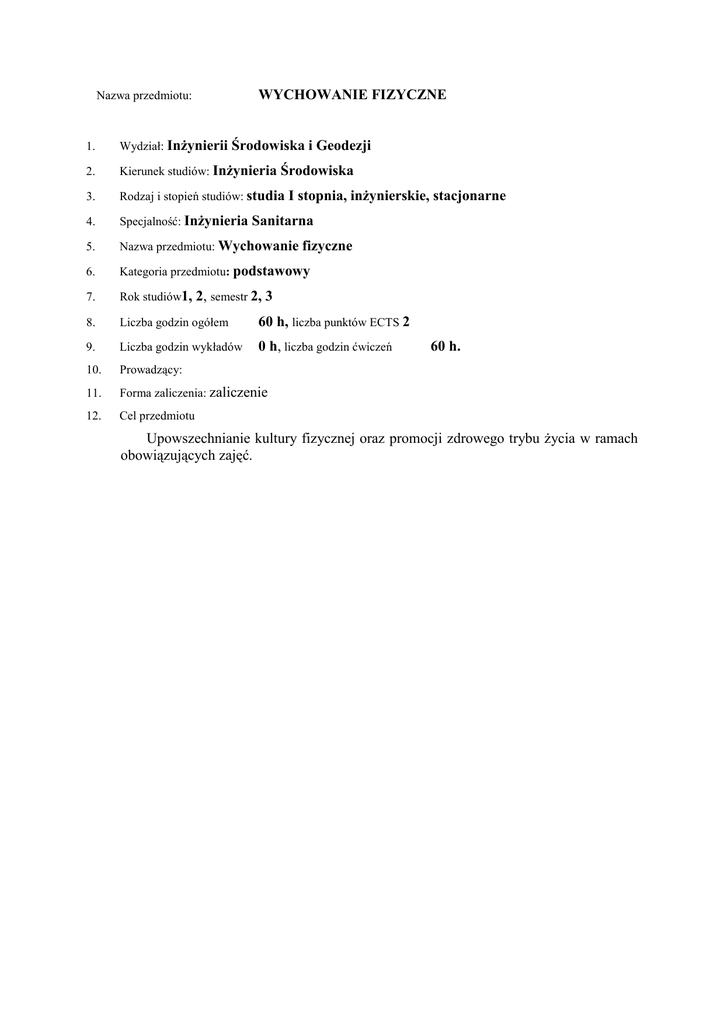 WYCHOWANIE FIZYCZNE Wydział: InŜynierii Środowiska i