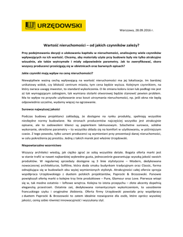 Warszawa, 28.09.2016 r. Wartość nieruchomości – od jakich czynników zależy? Przy podejmowaniu decyzji o ulokowaniu kapitału w nieruchomości, analizujemy wiele czynników wpływających na ich wartość. Chcemy, aby materiały użyte przy budowie były nie tylko atrakcyjne wizualnie, ale także wytrzymałe i miały odpowiednie parametry. Jak to zweryfikować, skoro wszyscy producenci prześcigają się w obietnicach oraz barwnych opisach? Jakie czynniki mają wpływ na cenę nieruchomości? Niewątpliwie ważną cechą wpływającą na wartość nieruchomości ma jej lokalizacja. Im bardziej unikatowy widok, czy bliskość centrum miasta, tym cena będzie wyższa. Kolejnym czynnikiem, na który zwraca uwagę inwestor, to standard wykończenia. O ile zmiana koloru ścian lub podłogi nie jest aż tak wymagającym zabiegiem, tak wymiana stolarki otworowej będzie stanowić pewien problem. Ma to wpływ na przyszłe użytkowanie oraz koszt utrzymania nieruchomości, np. jeśli okna nie będą odpowiednio szczelne, wydamy więcej na ogrzewanie. Surowce najwyższej jakości Podczas budowy projektanci zakładają, że dostępne na rynku produkty, spełniają wszystkie niezbędne normy budowlane. Na stronach producentów najczęściej wszystko jest atrakcyjnie opisane, ale to zadowoleni klienci są papierkiem lakmusowym. Szlachetne surowce, solidne wykonanie, określone parametry – to wszystko składa się na komfort w użytkowaniu, w późniejszym czasie. Z tego powodu, tylko uznani producenci są wymieniani przy prezentacji danej nieruchomości, w celu pokreślenia jej prestiżu. Jedną z takich marek jest właśnie Urzędowski. Niepowtarzalne wzornictwo Wszyscy architekci wiedzą, jak ciężko zgrać ze sobą wszystkie detale. Bogata oferta marki jest w stanie trafić w nawet najbardziej wybredne gusta, jednocześnie gwarantując wysoką jakość swoich produktów. W regularnej sprzedaży dostępne są 3 linie stylistyczne – Modern, dedykowana nowoczesnej architekturze, Softline, która doda smaku budynkom tradycyjnym oraz Classic, forma odnajdująca się w budowlach obu wyżej wymienionych stylistyk. Atrakcyjności całej ofercie sprzyja współpraca Urzędowskiego z duetem polskich projektantów, Paprocki & Brzozowski. Panowie powiększyli ofertę marki o kolejne trzy linie produktowe – Pure, Glamour oraz Love. Pierwsza wtopi się w, tak modne ostatnio – loftowe wnętrza. Kolejna to istota przepychu – złote akcenty dopełnią elegancką przestrzeń. Ostatnia zaś, dedykowana romantycznym wykończeniom, to uosobienie francuskiego szyku i oryginalne żłobienia. Oferta firmy Urzędowski powstała przy współpracy z duetem Paprocki & Brzozowski to zatem idealnie rozwiązanie dla osób, które oprócz wysokiej jakości, cenią sobie również innowacyjność i wyszukany styl. Jakość idąca w parze z dobrym wzornictwem – Tym, co wyróżnia nas na tle innych producentów, to nie tylko innowacyjne rozwiązania, ale także przywiązywanie dużej wagi do design’u oferowanych przez nas produktów. Usytuowanie wyglądu na równi z ich odpowiednimi parametrami sprawia, iż jesteśmy w stanie sprostać nawet największym wymaganiom konsumenckim – wyjaśnia Jarosław Issel, Prezes Zarządu BMK Europe S.A., do której należy marka Urzędowski. Wysoki standard w połączeniu z wyjątkowym podejściem do design’u stanowi także niepodważalny argument wobec wzrostu wartości nieruchomości. – Oferowane przez naszą firmę okna i drzwi to bez wątpienia znakomita inwestycja – dodaje Jarosław Issel. Warto zatem podczas wyboru nieruchomości kierować się również czynnikami, które w przyszłości będą stanowić dla nas czystą korzyść. *** Marka Urzędowski jest obecna na rynku od ponad 25 lat. Przez ćwierć wieku istnienia, za priorytet uznawała jakość i innowacyjność. Strategia marki zawsze opierała się na wykorzystaniu nowych technologii i rozwiązań, oddziałując tym samym na rozwój całej branży. W przemyślany sposób dobierając wyselekcjonowane partie drewna i komponentów, Urzędowski od lat nadaje pomieszczeniom wyjątkowy charakter, będąc synonimem wysokiej jakości stolarki. Kontakt dla mediów: Aneta Sierocińska PR Specialist e-mail: [email protected] Tel.: 22 544-05-13 Magdalena Mikołajczak Account Manager e-mail: [email protected] Tel.: 668 132 417