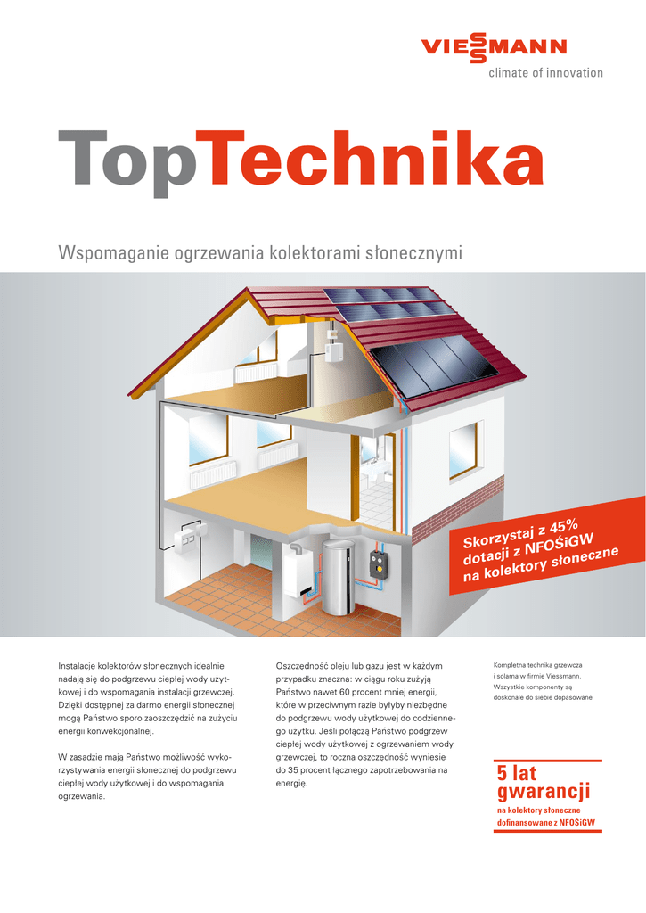 TopTechnika Wspomaganie ogrzewania kolektorami słonecznymi 5% taj z 4 s y z r W o Sk FOŚiG zne N z i j dotac tory słonec ek na kol Instalacje kolektorów słonecznych idealnie nadają się do podgrzewu ciepłej wody użytkowej i do wspomagania instalacji grzewczej. Dzięki dostępnej za darmo energii słonecznej mogą Państwo sporo zaoszczędzić na zużyciu energii konwekcjonalnej. W zasadzie mają Państwo możliwość wykorzystywania energii słonecznej do podgrzewu ciepłej wody użytkowej i do wspomagania ogrzewania. Oszczędność oleju lub gazu jest w każdym przypadku znaczna: w ciągu roku zużyją Państwo nawet 60 procent mniej energii, które w przeciwnym razie byłyby niezbędne do podgrzewu wody użytkowej do codziennego użytku. Jeśli połączą Państwo podgrzew ciepłej wody użytkowej z ogrzewaniem wody grzewczej, to roczna oszczędność wyniesie do 35 procent łącznego zapotrzebowania na energię. Kompletna technika grzewcza i solarna w firmie Viessmann. Wszystkie komponenty są doskonale do siebie dopasowane 5 lat gwarancji na kolektory słoneczne dofinansowane z NFOŚiGW TopTechnika Wspomaganie ogrzewania kolektorami słonecznymi Il. 1 Zapotrzebowanie na ciepło i uzysk ciepła z instalacji kolektorów słonecznych 100 A zapotrzebowanie na ciepło do ogrzewania domu (rok budowy mniej więcej od 1984 r.) B zapotrzebowanie na ciepło do ogrzewania domu niskoenergetycznego C zapotrzebowanie na ciepło do podgrzewu wody użytkowej D uzysk ciepła z instalacji solarnej przy 5 m2 powierzchni absorbera (kolektor płaski) E uzysk ciepła z instalacji solarnej przy 15 m2 powierzchni absorbera (kolektor płaski) 75 50 E B 25 ilość wykorzystanego ciepła D C Lis Gru Paź Wrz Lip Sie Cze Maj Kwi Lut Mar 0 Sty Zapotrzebowanie na ciepło [%] A Dlaczego powinno się wprowadzać wspomaganie ogrzewania kolektorami słonecznymi? Podczas rozmowy z konsultantem każdy zainteresowany instalacją solarną zadaje sobie pytanie, czy trafną decyzją będzie zainwestowanie w „małą” instalację do podgrzewu wody, czy też w „dużą” instalację łączoną (kombi). Decyzja jest podejmowana szybko na rzecz drugiego rozwiązania, gdyż pozwala ono na absolutnie największe zaoszczędzenie energii, dzięki zasobnikowi multiwalentnemu lub zasobnikowi buforowemu wody grzewczej można włączyć do instalacji również inne nośniki energii, np. kocioł na drewno. Wskazówka Stosunek powierzchni kolektora do pojemności zasobnika wody w przypadku solarnego podgrzewu ciepłej wody użytkowej i w przypadku solarnego wspomagania ogrzewania jest taki sam: powinno przypadać co najmniej 50 litrów na metr kwadratowy. Wyższa suma inwestycji jest przy tym często sprawą drugorzędną, dobrze poinformowany inwestor postępuje zgodnie z dewizą: „jak coś robić, to dobrze”. Uwaga: doświadczenie pokazuje, że osoby zainteresowane często przeceniają możliwości instalacji służącej do wspomagania ogrzewania w budynku. Dlatego właśnie na etapie konsultacji należy jak najwcześniej korygować błędne oceny i przedstawiać realistyczne oczekiwania związane z solarnym wspomaganiem ogrzewania. Wymiarowanie Przy solarnym podgrzewie ciepłej wody użytkowej, solarne wytwarzanie ciepła, które jest sezonowo bardzo zróżnicowane, znajduje się w bardzo sensownej relacji do możliwie jak najbardziej zrównoważonego zapotrzebowania na ciepło w ciągu roku, co sprawia, że z reguły instalacja solarna pokrywa ok. 60 procent zapotrzebowania. Przy wspomaganiu ogrzewania kolektorami słonecznymi, podaż i popyt na ciepło zachowują się przeciwstawnie. Ilustracja 1 pokazuje, że instalacja solarna nie zastępuje konwencjonalnego źródła ciepła, którego wydajność nie może również zostać zredukowana. Instalację z kolektorami słonecznymi należy więc traktować jako część składową ogólnego systemu, w którym chodzi o uzyskanie najwyższej efektywności – w tym zwłaszcza konwencjonalnego źródła ciepła. Integracja energii odnawialnych zwiększa wydajność ogólnych systemów, nie może ich jednak zastąpić. Jak duża powinna być instalacja solarna w ogólnym systemie grzewczym? Jeśli będzie zbyt mała, nie będzie można tu raczej mówić o solarnym wspomaganiu ogrzewania, jeśli zaś będzie zbyt duża, wówczas nadwyżki w sezonie letnim będą prowadzić do bardzo długich okresów stagnacji i tym samym do coraz gorszego wykorzystywania instalacji oraz dużego obciążenia cieplnego wszystkich komponentów instalacji. W celu szybkiego doboru odpowiedniej wielkości, oferenci wspomaganych solarnie systemów grzewczych uzgodnili obowiązywanie następującej ogólnej reguły praktycznej. Podstawą wymiarowania wspomagania ogrzewania kolektorami słonecznymi jest przede wszystkim zawsze zapotrzebowanie na ciepło w okresie letnim. Składa się ono z zapotrzebowania na ciepło do podgrzewu ciepłej wody użytkowej oraz dla potrzeb innych, znajdujących się w obiekcie urządzeń odbiorczych, które również mogą być zaopatrywane przez tę instalację, na przykład może to być zapotrzebowanie na ciepło dla uniknięcia kondensacji pary wodnej w pomieszczeniach piwnicznych lub ogrzewany latem basen. Dla takiego zużycia w okresie letnim projektuje się odpowiednią powierzchnię 2/3 k olektora. Określoną w ten sposób powierzchnię kolektora należy teraz przemnożyć przez współczynnik 2 i współczynnik 2,5 – uzyskane wyniki przedstawiają zakres, w jakim powinna się mieścić powierzchnia kolektora do solarnego wspomagania ogrzewania. Il. 2 Wydajność wytwarzania pary przez kolektory płaski kolektor ze swobodnym wypływem pary płaski kolektor z ograniczonym wypływem pary max 60 W/m2 max 100 W/m2 Na jeden m2 powierzchni kolektora należy uwzględnić w projekcie co najmniej 50 litrów pojemności zbiornika. Wybór kolektora W zasadzie w instalacjach wspomagających ogrzewanie można stosować zarówno kolektory płaskie jak i rurowe kolektory 