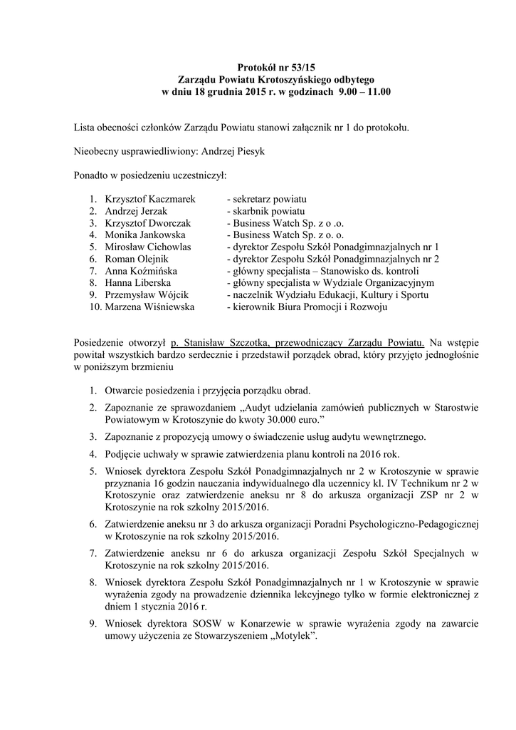 Protokół nr 53/15 Zarządu Powiatu Krotoszyńskiego odbytego w dniu 18 grudnia 2015 r. w godzinach 9.00 – 11.00 Lista obecności członków Zarządu Powiatu stanowi załącznik nr 1 do protokołu. Nieobecny usprawiedliwiony: Andrzej Piesyk Ponadto w posiedzeniu uczestniczył: 1. Krzysztof Kaczmarek 2. Andrzej Jerzak 3. Krzysztof Dworczak 4. Monika Jankowska 5. Mirosław Cichowlas 6. Roman Olejnik 7. Anna Koźmińska 8. Hanna Liberska 9. Przemysław Wójcik 10. Marzena Wiśniewska - sekretarz powiatu - skarbnik powiatu - Business Watch Sp. z o .o. - Business Watch Sp. z o. o. - dyrektor Zespołu Szkół Ponadgimnazjalnych nr 1 - dyrektor Zespołu Szkół Ponadgimnazjalnych nr 2 - główny specjalista – Stanowisko ds. kontroli - główny specjalista w Wydziale Organizacyjnym - naczelnik Wydziału Edukacji, Kultury i Sportu - kierownik Biura Promocji i Rozwoju Posiedzenie otworzył p. Stanisław Szczotka, przewodniczący Zarządu Powiatu. Na wstępie powitał wszystkich bardzo serdecznie i przedstawił porządek obrad, który przyjęto jednogłośnie w poniższym brzmieniu 1. Otwarcie posiedzenia i przyjęcia porządku obrad. 2. Zapoznanie ze sprawozdaniem „Audyt udzielania zamówień publicznych w Starostwie Powiatowym w Krotoszynie do kwoty 30.000 euro.” 3. Zapoznanie z propozycją umowy o świadczenie usług audytu wewnętrznego. 4. Podjęcie uchwały w sprawie zatwierdzenia planu kontroli na 2016 rok. 5. Wniosek dyrektora Zespołu Szkół Ponadgimnazjalnych nr 2 w Krotoszynie w sprawie przyznania 16 godzin nauczania indywidualnego dla uczennicy kl. IV Technikum nr 2 w Krotoszynie oraz zatwierdzenie aneksu nr 8 do arkusza organizacji ZSP nr 2 w Krotoszynie na rok szkolny 2015/2016. 6. Zatwierdzenie aneksu nr 3 do arkusza organizacji Poradni Psychologiczno-Pedagogicznej w Krotoszynie na rok szkolny 2015/2016. 7. Zatwierdzenie aneksu nr 6 do arkusza organizacji Zespołu Szkół Specjalnych w Krotoszynie na rok szkolny 2015/2016. 8. Wniosek dyrektora Zespołu Szkół Ponadgimnazjalnych nr 1 w Krotoszynie w sprawie wyrażenia zgody na prowadzenie dziennika lekcyjnego tylko w formie elektronicznej z dniem 1 stycznia 2016 r. 9. Wniosek dyrektora SOSW w Konarzewie w sprawie wyrażenia zgody na zawarcie umowy użyczenia ze Stowarzyszeniem „Motylek”. 10. Wniosek PUP w Krotoszynie w sprawie wyrażenia zgody na bezpłatne przekazanie składników majątku ruchomego. 11. Wniosek Starostwa Powiatowego w sprawie wyrażenia zgody na bezpłatne przekazanie składników majątku ruchomego. 12. Wniosek Teczka Firm Krzysztof Jabłoński w sprawie wyrażenia zgody na wykorzystanie herbu Powiatu Krotoszyńskiego. 13. Zapytania i wolne głosy. Punkt 2 Pan Krzysztof Dworczak – zgodnie z planem na 2015 r. przeprowadzony został audyt udzielania zamówień publicznych w Starostwie Powiatowym w Krotoszynie do kwoty 30.000 euro. Przeprowadzając zadanie audytowe w głównej mierze bazowano na procedurze wewnętrznej Starostwa oraz sprawdzano, czy pracownicy postępują zgodnie z procedurą i oceniono zapisy procedury wewnętrznej pod kątem dobrych praktyk. Próbie poddano wszystkie zamówienia, które zostały udzielone w badanym okresie tj. 1 stycznia – 31 sierpnia 2015 r. Pan Dworczak podkreślił, że w zakresie zamówień publicznych od 14.000 do 30.000 euro pozytywnie oceniono fakt, że wybór dostawcy i wykonawcy przebiegał zgodnie z procedurą. Nie było żadnych odstępstw. Podjęto wszystkie kroki, które należało wykonać w procesie wyboru dostawcy. Cały proces był udokumentowany w sposób zgodny z załącznikami do procedury wewnętrznej. Tylko w jednym przypadku na etapie szacowania wartości zamówienia kwota, która była wyszacowana nie zgadzała się z kwotą podaną we wniosku. Pan Dworczak podkreślił, że pewne rozbieżności w ocenie pojawiły się w przypadku wyboru dostawcy materiałów biurowych. Ofertę złożyło dwóch wykonawców i jedna z nich została odrzucona, ponieważ nie była zgodna z przedmiotem zamówienia. Następnie zamawiający skierował pismo do wykonawcy z prośbą o udzielenie wyjaśnień co do marki segregatora. Dostawa wyjaśnił w piśmie, że podana nazwa była pomyłką i zaznaczył, że powyższe nie zmienia przedmiotu zamówienia i ceny. Cena oferty odrzuconej była niższa od oferty ostatecznie przyjętej. Pomimo udzielonego wyjaśnienia dostawcy Komisja odrzuciła ofertę i nie potraktowała błędu w ofercie jako omyłki. W ocenie pana Dworczaka była to pomyłka, ponieważ skoro na rynku nie był odstępny segregator wskazanej firmy, to oznacza, że produkt nie istnieje, czyli jest to pomyłka. Postępowanie dotyczące dostawy materiałów biurowych jest zamówieniem wyjętym spod rygoru, poza tym i przede wszystkim cena oferty odrzuconej była niższa. Komisja po otrzymaniu wyjaśnień od dostawcy powinna była przyjąć ofertę tańszą. Pani Monika Jankowska – proces udzielania zamówień do 14.000 euro regulowany jest w obowiązującej procedurze udzielania zamówień publicznych Starostwa Powiatowego. Audyt w tym zakresie opierał się w znacznej części na dobrych praktykach, ponieważ obowiązująca procedura jest w niektórych częściach nieprecyzyjna. Pani Jankowska podkreśliła, że wyniki analizy badanego obszaru wskazują na skutki braku precyzji w formułowaniu zapisów. Podsumowując badany obszar można stwierdzić, że postępowania przeprowadzone były zgodnie z procedurą, co nie oznacza, że optymalnie dobrze. Proces udzielania zamówień do 14.000 euro realizowany jest na stanowiskach kierowników komórek organizacyjnych, którym przekazano kompetencje do udzielania takich zamówień. Zbadano 18 przypadków dokonania wyboru dostawy i w 7 przypadkach nie przeprowadzono rozeznania rynku. W 13 na 18 postepowań nie 2 zgromadzono ofert w przypadku kiedy procedura wskazuje, że należy sporządzić notatkę bądź załączyć oferty. Na tą okoliczność przedłożono różne wyjaśnienia np. rozeznanie cen drogą 
