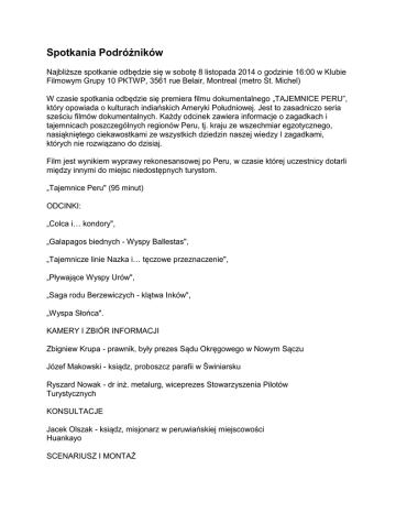 Spotkania Podróżników Najbliższe spotkanie odbędzie się w sobotę 8 listopada 2014 o godzinie 16:00 w Klubie Filmowym Grupy 10 PKTWP, 3561 rue Belair, Montreal (metro St. Michel) W czasie spotkania odbędzie się premiera filmu dokumentalnego „TAJEMNICE PERU”, który opowiada o kulturach indiańskich Ameryki Południowej. Jest to zasadniczo seria sześciu filmów dokumentalnych. Każdy odcinek zawiera informacje o zagadkach i tajemnicach poszczególnych regionów Peru, tj. kraju ze wszechmiar egzotycznego, nasiąkniętego ciekawostkami ze wszystkich dziedzin naszej wiedzy I zagadkami, których nie rozwiązano do dzisiaj. Film jest wynikiem wyprawy rekonesansowej po Peru, w czasie której uczestnicy dotarli między innymi do miejsc niedostępnych turystom. „Tajemnice Peru" (95 minut) ODCINKI: „Colca i… kondory", „Galapagos biednych - Wyspy Ballestas", „Tajemnicze linie Nazka i… tęczowe przeznaczenie", „Pływające Wyspy Urów", „Saga rodu Berzewiczych - klątwa Inków", „Wyspa Słońca". KAMERY I ZBIÓR INFORMACJI Zbigniew Krupa - prawnik, były prezes Sądu Okręgowego w Nowym Sączu Józef Makowski - ksiądz, proboszcz parafii w Świniarsku Ryszard Nowak - dr inż. metalurg, wiceprezes Stowarzyszenia Pilotów Turystycznych KONSULTACJE Jacek Olszak - ksiądz, misjonarz w peruwiańskiej miejscowości Huankayo SCENARIUSZ I MONTAŻ Zenon Kuczera - dziennikarz, trener, programista, były korespondent zagraniczny krakowskiego „Dziennika Polskiego" Zapraszamy! Opracowywane są dalsze odcinki: zagadek Machu Picchu, akweduktów nazkańskich, kolonialnej architektury sakralnej, ośrodków byłego niewolnictwa, mumii itp. Andrzej Szelerski Gdzie mieści się nasz klub: Sala PKTWP (Polsko-Kanadyjskie Towarzystwo Wzajemnej Pomocy) Grupy 10, jest przy ulicy Belair Nr 3561 w Montrealu. Ulica Belair łączy Blvd Saint Michel i Pie IX. Jest równoległa do Jean-Talon i Belanger i między nimi. Budynek jest na rogu Belair i 15 Av. Sala mieści się w basemencie pod agencją podróży. W załączeniu link do mapy w Google'ach. Klikając na banner i obracając obraz można dojść do widoku budynku w którym mieści się nasz klub. Wejście do klubu - schodkami w dół, pod agencja podróży Baltique. http://maps.google.ca/maps?rls=com.microsoft:en-CA:IESearchBox&oe=&redir_esc=&um=1&ie=UTF8&q=Baltique+Montreal&fb=1&gl=ca&hq=Baltique&hnear=Montreal,+QC&cid=0,0,5871 446069155444604&ei=JHVATJzLJ8P78Ab6_uDhDw&sa=X&oi=local_result&ct=image &resnum=1&ved=0CBYQnwIwAA