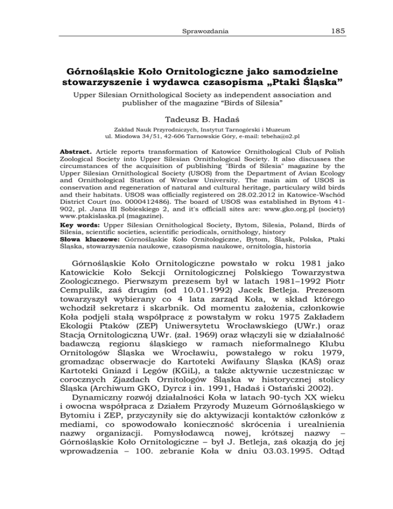 Sprawozdania 185 Górnośląskie Koło Ornitologiczne jako samodzielne stowarzyszenie i wydawca czasopisma „Ptaki Śląska” Upper Silesian Ornithological Society as independent association and publisher of the magazine “Birds of Silesia” Tadeusz B. Hadaś Zakład Nauk Przyrodniczych, Instytut Tarnogórski i Muzeum ul. Miodowa 34/51, 42-606 Tarnowskie Góry, e-mail: [email protected] Abstract. Article reports transformation of Katowice Ornithological Club of Polish Zoological Society into Upper Silesian Ornithological Society. It also discusses the circumstances of the acquisition of publishing "Birds of Silesia" magazine by the Upper Silesian Ornithological Society (USOS) from the Department of Avian Ecology and Ornithological Station of Wrocław University. The main aim of USOS is conservation and regeneration of natural and cultural heritage, particulary wild birds and their habitats. USOS was officially registered on 28.02.2012 in Katowice-Wschód District Court (no. 0000412486). The board of USOS was established in Bytom 41902, pl. Jana III Sobieskiego 2, and it's officiall sites are: www.gko.org.pl (society) www.ptakislaska.pl (magazine). Key words: Upper Silesian Ornithological Society, Bytom, Silesia, Poland, Birds of Silesia, scientific societies, scientific periodicals, ornithology, history Słowa kluczowe: Górnośląskie Koło Ornitologiczne, Bytom, Śląsk, Polska, Ptaki Śląska, stowarzyszenia naukowe, czasopisma naukowe, ornitologia, historia Górnośląskie Koło Ornitologiczne powstało w roku 1981 jako Katowickie Koło Sekcji Ornitologicznej Polskiego Towarzystwa Zoologicznego. Pierwszym prezesem był w latach 1981–1992 Piotr Cempulik, zaś drugim (od 10.01.1992) Jacek Betleja. Prezesom towarzyszył wybierany co 4 lata zarząd Koła, w skład którego wchodził sekretarz i skarbnik. Od momentu założenia, członkowie Koła podjęli stałą współpracę z powstałym w roku 1975 Zakładem Ekologii Ptaków (ZEP) Uniwersytetu Wrocławskiego (UWr.) oraz Stacją Ornitologiczną UWr. (zał. 1969) oraz włączyli się w działalność badawczą regionu śląskiego w ramach nieformalnego Klubu Ornitologów Śląska we Wrocławiu, powstałego w roku 1979, gromadząc obserwacje do Kartoteki Awifauny Śląska (KAŚ) oraz Kartoteki Gniazd i Lęgów (KGiL), a także aktywnie uczestnicząc w corocznych Zjazdach Ornitologów Śląska w historycznej stolicy Śląska (Archiwum GKO, Dyrcz i in. 1991, Hadaś i Ostański 2002). Dynamiczny rozwój działalności Koła w latach 90-tych XX wieku i owocna współpraca z Działem Przyrody Muzeum Górnośląskiego w Bytomiu i ZEP, przyczyniły się do aktywizacji kontaktów członków z mediami, co spowodowało konieczność skrócenia i urealnienia nazwy organizacji. Pomysłodawcą nowej, krótszej nazwy – Górnośląskie Koło Ornitologiczne – był J. Betleja, zaś okazją do jej wprowadzenia – 100. zebranie Koła w dniu 03.03.1995. Odtąd 186 Sprawozdania używane były obie nazwy, lecz adekwatność nowej i wygoda jej używania przyczyniły się do ostatecznego zastąpienia na przełomie XX i XX wieku niewygodnej formy KKSOPTZool. przez GKO (Archiwum GKO). Istotnym powodem skłaniającym górnośląskich ornitologów do formalnego usamodzielnienia się było powolne wyczerpywanie się formuły organizacyjnej Polskiego Towarzystwa Zoologicznego, które m.in. w 2010 roku zaprzestało wydawania swego głównego czasopisma „Przegląd Zoologiczny”, a jedynym elementem jeszcze aktywnie działającą pozostała część Sekcji Ornitologicznej, mianowicie Komisja Faunistyczna i kwartalnik „Ornis Polonica”, sprawnie prowadzone przez prof. dr hab. Tadeusza Stawarczyka. Dyskusja o celowości usamodzielnienia się GKO rozpoczęła się wiosną 2011, po XXXII Zjeździe Ornitologów Śląska (12.03.2011), w trakcie którego nie podjęto oficjalnej dyskusji o przyszłości Klubu Ornitologów Śląska i KAŚ. Ostatecznie ustalenie kierunku działań nastąpiło w trakcie bardzo owocnych obchodów jubileuszu 30-lecia GKO w dniach 24–25.09.2011 w Jaszowcu (gm. Ustroń). Wkrótce rozpoczęto realizację planu, którego celem było przeorganizowanie i unowocześnienie GKO oraz przejęcie od ZEP UWr. wydawania „Ptaków Śląska” (Archiwum GKO, Dyrcz 2011, Ostański 2011). Pierwsze zebranie założycielskie Zebranie założycielskie (214. zebranie w historii Koła) zwołano na godz. 16.00 w piątek, 04.11.2011 do sali dydaktycznej (świetlicy) Muzeum Górnośląskiego w Bytomiu, przy pl. Jana III Sobieskiego 2. Celem zebrania było powołanie samodzielnego stowarzyszenia, będącego bezpośrednim następcą i kontynuatorem działalności Katowickiego Koła Sekcji Ornitologicznej Polskiego Towarzystwa Zoologicznego, założonego w 1981 roku. W zebraniu udział wzięło 44 osoby, spośród których 39 zdecydowało się zostać członkami założycielami. Obrady otworzył dr Jacek Betleja, proponując porządek zebrania. Przewodniczącym – Seniorem zebrania został wybrany Józef Kotecki, zaś protokolantem dr Mariusz Ostański. Przed podjęciem uchwały o założeniu stowarzyszenia rozgorzała dyskusja nad jego przyszłą nazwą. Zaproponowano pozostawienie dotychczasowej nieoficjalnej nazwy „Górnośląskie Koło Ornitologiczne” (dr J. Betleja) oraz nowe warianty: „Górnośląskie Towarzystwo Ornitologiczne” (Zbigniew Chrul) i „Stowarzyszenie Górnośląskie Koło Ornitologiczne” (dr Jerzy Parusel). Stosunkiem głosów 26 (za GKO): 13 (za GTO): 0 (za SGKO) uchwalono tradycyjną nazwę „Górnośląskie Koło Ornitologiczne”. Po przyjęciu nazwy, założyciele jednogłośnie podjęli uchwałę o powołaniu stowarzyszenia "Górnośląskie Koło Ornitologiczne", którego siedziba będzie się mieściła w Bytomiu, przy pl. Jana III Sobieskiego 2., by następnie zapoznać się z wstępnym projektem statutu, przygotowanym przez Sprawozdania 187 dr J. Betleję i mgr Tadeusza Hadasia. Do projektu założyciele zaproponowali