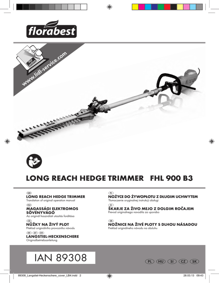 ® LONG REACH HEDGE TRIMMER FHL 900 B3 LONG REACH HEDGE TRIMMER NOŻYCE DO ŻYWOPŁOTU Z DŁUGIM UCHWYTEM MAGASSÁGI ELEKTROMOS SÖVÉNYVÁGÓ Prevod originalnega navodila za uporabo NŮŽKY NA ŽIVÝ PLOT NOŽNICE NA ŽIVÉ PLOTY S DLHOU NÁSADOU Translation of original operation manual Tłumaczenie oryginalnej instrukcji obsługi ŠKARJE ZA ŽIVO MEJO Z DOLGIM ROČAJEM Az originál használati utasítás fordítása Překlad originálního provozního návodu Preklad originálneho návodu na obsluhu LANGSTIEL-HECKENSCHERE Originalbetriebsanleitung IAN 89308 89308_Langstiel-Heckenschere_cover_LB4.indd 2 28.03.13 09:43 Before reading, unfold the page containing the illustrations and familiarise yourself with all functions of the device. Przed przeczytaniem proszę rozłożyć stronę z ilustracjami, a następnie proszę zapoznać się z wszystkimi funkcjami urządzenia. Olvasás előtt kattintson az ábrát tartalmazó oldalra és végezetül ismerje meg a készülék mindegyik funkcióját. Pred branjem odprite stran s slikami in se nato seznanite z vsemi funkcijami naprave. Před čtením si otevřete stranu s obrázky a potom se seznamte se všemi funkcemi přístroje. Pred čítaním si odklopte stranu s obrázkami a potom sa oboznámte so všetkými funkciami prístroja. Klappen Sie vor dem Lesen die Seite mit den Abbildungen aus und machen Sie sich anschließend mit allen Funktionen des Gerätes vertraut. GB PL HU SI CZ SK DE / AT / CH Translation of original operation manual Tłumaczenie oryginalnej instrukcji obsługi Az originál használati utasítás fordítása Prevod originalnega navodila za uporabo Překlad originálního provozního návodu Preklad originálneho návodu na obsluhu Originalbetriebsanleitung 89308_Langstiel-Heckenschere_cover_LB4.indd 3 Page Strona Oldal Stran Strana Strana Seite 5 18 32 45 57 70 83 28.03.13 09:43 A B 1 19 2 1 7 4 5a 5b 6 2 7 7 8 4 5a 5b 8 ◄ 9 ► 6 7 10 18 9 17 11 12 16 15 13 14 3 4 GB Contents Introduction .................................5 Intended use ................................5 General description ......................6 Extent of the delivery ........................6 Overview ........................................6 Function description .........................6 Technical data ..............................6 Notes on Safety ........................... 7 Symbols in the manual ...................... 7 Symbols on the Equipment ................ 7 General Notes on Safety................... 8 General safety instructions for power tools ..................................... 8 Hedge trimmer safety warnings.......... 10 Assembling the Long-Handled Hedge Trimmer ... 11 Operating the Hedge Trimmer ... 11 Swivelling Out the Blade Beam ........ 11 Attach the shoulder strap ................ 12 Switching On and Off .................... 12 Working with the Electric Hedge Trimmer .............................. 12 Swivelling the Arm ......................... 12 Cutting Techniques ......................... 13 Cutting Times ................................. 13 Working Safely .......................... 14 Maintenance/Cleaning ............... 14 Storage ...................................... 14 Spare Parts ................................ 14 Trouble Shooting ........................ 15 Waste Disposal and Environmental Protection .................................. 15 Guarantee ................................. 16 Repair Service ............................ 17 Service-Center ............................ 17 Service Branch ........................... 17 Translation of the original EC declaration of conformity ...... 97 Exploded Drawing ................... 101 Introduction Congratulations on the purchase of your new device. With it, you have chosen a high quality product. The operating instructions constitute part of this product. They contain important information on safety, use and disposal. Before using the product, familiarise yourself with all of the operating and safety instructions. Use the product only as described and for the applications specified. Keep this manual safely and in the event that the product is passed on, hand over all documents to the third party. Intended Use The equipment is specified for use only for the cutting and trimming of hedges, bushes and ornamental shrubs in the domestic environment. Any other use that is not explicitly approved in these instructions may result in damage to the equipment and represent a serious danger to the user. The equipment is designed for use by adults. Adolescents over the age of 16 may use the device only under supervision. Do not use the hedge trimmer in the rain or on wet hedges. The operator or user is responsible for accidents or damage to other people or their property. The manufacturer is not liable for damages caused by unspecified use or incorrect operation. Before use, check that the blades are sharp. Ensure that the blades are sharpened whenever blunt, in order to avoid overstressing of the machine. Damages caused by cutting with blunt blades are not covered by the guarantee. 5 GB General Description Extent of delivery - Long-handled hedge trimmer (two-part) Blade protection Leg protection Shoulder strap Round handle Allen wrench Instruction Manual See the front fold-out page for illustrations. Overview A 1 2 4 5a 5b 6 7 8 9 10 11 12 13 14 15 16 17 18 19 C 6 Safety blade Gearbox Stop lever fixing Stop lever Safety lever Handle for adjusting the blade beam Front arm Safety button Pivotal centre Round handle Safety slide Deadman switch On/off switch Strain relief Mains cable Shoulder strap Eye (for shoulder strap) Leg protection Blade protection 20 Square nuts 21 Screws 22 Assembly block Function Description The electric hedge trimmer is driven by an electronic motor. The equipment is doubleinsulated for safety and does not require earthing. The hedge trimmer is equipped with a double-sided safety cutter bar. When cutting, the blades move backwards and forwards in linear motion. The 