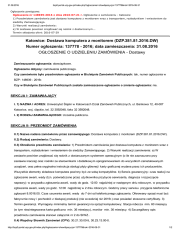 31.08.2016 bzp0.portal.uzp.gov.pl/index.php?ogloszenie=show&pozycja=137778&rok=20160831 Ogłoszenie powiązane: Ogłoszenie nr 1489392016 z dnia 20160721 r. Ogłoszenie o zamówieniu Katowice 1) Przedmiotem zamówienia jest dostawa komputera z monitorem wraz z transportem, rozładunkiem i wniesieniem do siedziby Zamawiającego. 2) Warunki realizacji zamówienia: a) W zestawie powinien znajdować się nośnik z dostarczanym... Termin składania ofert: 20160729 Katowice: Dostawa komputera z monitorem (DZP.381.81.2016.DW) Numer ogłoszenia: 137778 2016; data zamieszczenia: 31.08.2016 OGŁOSZENIE O UDZIELENIU ZAMÓWIENIA Dostawy Zamieszczanie ogłoszenia: obowiązkowe. Ogłoszenie dotyczy: zamówienia publicznego. Czy zamówienie było przedmiotem ogłoszenia w Biuletynie Zamówień Publicznych: tak, numer ogłoszenia w BZP: 148939 2016r. Czy w Biuletynie Zamówień Publicznych zostało zamieszczone ogłoszenie o zmianie ogłoszenia: nie. SEKCJA I: ZAMAWIAJĄCY I. 1) NAZWA I ADRES: Uniwersytet Śląski w Katowicach Dział Zamówień Publicznych, ul. Bankowa 12, 40007 Katowice, woj. śląskie, tel. 32 3592048, faks 32 3592048. I. 2) RODZAJ ZAMAWIAJĄCEGO: Uczelnia publiczna. SEKCJA II: PRZEDMIOT ZAMÓWIENIA II.1) Nazwa nadana zamówieniu przez zamawiającego: Dostawa komputera z monitorem (DZP.381.81.2016.DW). II.2) Rodzaj zamówienia: Dostawy. II.3) Określenie przedmiotu zamówienia: 1) Przedmiotem zamówienia jest dostawa komputera z monitorem wraz z transportem, rozładunkiem i wniesieniem do siedziby Zamawiającego. 2) Warunki realizacji zamówienia: a) W zestawie powinien znajdować się nośnik z dostarczanym systemem operacyjnym (o ile nie zaznaczono przy zestawie inaczej) oraz nośniki ze sterownikami i dodatkowym oprogramowaniem do wszystkich zainstalowanych urządzeń, oraz pełna oryginalna instrukcja obsługi płyty głównej i karty graficznej wydana przez ich producentów. Wszystkie elementy składowe komputera powinny być ze sobą kompatybilne. b) Serwis gwarancyjny: czas reakcji na zgłoszenie awarii, wady (tzn. poświadczone przez użytkownika przybycie serwisanta, diagnoza i rozpoczęcie naprawy): w przypadku zgłoszenia awarii, wady do godz. 12:00 najpóźniej w następnym dniu roboczym, w przypadku zgłoszenia awarii, wady po godz. 12:00 najpóźniej w 2 dniu roboczym. Godziny pracy serwisu przyjęcia telefoniczne zgłoszeń 8.00 16.00. Czas usuwania awarii, wady do 7 dni od telefonicznego zgłoszenia. Oferowany sprzęt musi być fabrycznie nowy i pochodzić z bieżącej produkcji (nie wcześniej niż 2015r.) oraz posiadać stosowne certyfikaty. 3) Termin gwarancji. Wymagany minimalny termin gwarancji na sprzęt komputerowy: Stacja robocza min. 60 miesięcy (w tym niezintegrowana karta graficzna min. 36 miesięcy), monitor min. 36 miesięcy. 4) Szczegółowy opis przedmiotu zamówienia stanowi załącznik nr 2 do SIWZ.. II.4) Wspólny Słownik Zamówień (CPV): 30.21.30.005, 30.23.13.000. http://bzp0.portal.uzp.gov.pl/index.php?ogloszenie=show&pozycja=137778&rok=20160831 1/2 31.08.2016 bzp0.portal.uzp.gov.pl/index.php?ogloszenie=show&pozycja=137778&rok=20160831 SEKCJA III: PROCEDURA III.1) TRYB UDZIELENIA ZAMÓWIENIA: Przetarg nieograniczony III.2) INFORMACJE ADMINISTRACYJNE Zamówienie dotyczy projektu/programu finansowanego ze środków Unii Europejskiej: nie SEKCJA IV: UDZIELENIE ZAMÓWIENIA Część NR: 1 Nazwa: IV.1) DATA UDZIELENIA ZAMÓWIENIA: 25.08.2016. IV.2) LICZBA OTRZYMANYCH OFERT: 2. IV.3) LICZBA ODRZUCONYCH OFERT: 1. IV.4) NAZWA I ADRES WYKONAWCY, KTÓREMU UDZIELONO ZAMÓWIENIA: Zakład Systemów Komputerowych ZSK Sp. z o.o., ul. Wadowicka 12, 30415 Kraków, kraj/woj. małopolskie. IV.5) Szacunkowa wartość zamówienia (bez VAT): 11723,65 PLN. IV.6) INFORMACJA O CENIE WYBRANEJ OFERTY ORAZ O OFERTACH Z NAJNIŻSZĄ I NAJWYŻSZĄ CENĄ Cena wybranej oferty: 14440,20 Oferta z najniższą ceną: 11970,36 / Oferta z najwyższą ceną: 14440,20 Waluta: PLN . http://bzp0.portal.uzp.gov.pl/index.php?ogloszenie=show&pozycja=137778&rok=20160831 2/2