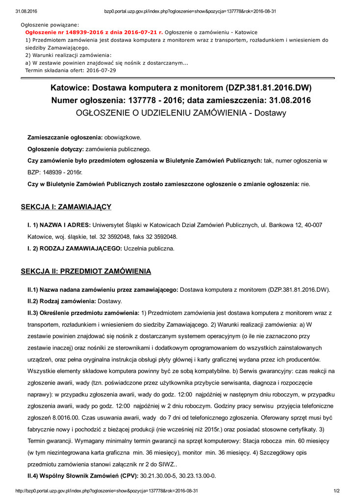 Katowice: Dostawa komputera z monitorem (DZP.381.81.2016.DW