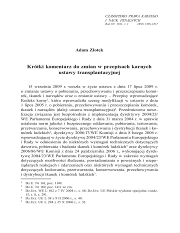 czasopismo Prawa karnego i nauk penalnych Rok XV: 2011, z. 1 ISSN 1506-1817 Adam Złotek Krótki komentarz do zmian w przepisach karnych ustawy transplantacyjnej 15 września 2009 r. weszła w życie ustawa z dnia 17 lipca 2009 r. o zmianie ustawy o pobieraniu, przechowywaniu i przeszczepianiu komórek, tkanek i narządów oraz o zmianie ustawy – Przepisy wprowadzające Kodeks karny1, która wprowadziła szereg modyfikacji w ustawie z dnia 1 lipca 2005 r. o pobieraniu, przechowywaniu i przeszczepianiu komórek, tkanek i narządów (dalej: ustawa transplantacyjna)2. Przedmiotowa nowelizacja związana jest bezpośrednio z implementacją dyrektywy 2004/23/ WE Parlamentu Europejskiego i Rady z dnia 31 marca 2004 r. w sprawie ustalenia norm jakości i bezpiecznego oddawania, pobierania, testowania, przetwarzania, konserwowania, przechowywania i dystrybucji tkanek i komórek ludzkich3, dyrektywy 2006/17/WE Komisji z dnia 8 lutego 2006 r. wprowadzającej w życie dyrektywę 2004/23/WE Parlamentu Europejskiego i Rady w odniesieniu do niektórych wymagań technicznych dotyczących dawstwa, pobierania i badania tkanek i komórek ludzkich4 oraz dyrektywy 2006/86/WE Komisji z dnia 24 października 2006 r., wykonującej dyrektywę 2004/23/WE Parlamentu Europejskiego i Rady w zakresie wymagań dotyczących możliwości śledzenia, powiadamiania o poważnych i niepożądanych reakcjach i zdarzeniach oraz niektórych wymagań technicznych dotyczących kodowania, przetwarzania, konserwowania, przechowywania i dystrybucji tkanek i komórek ludzkich5. 1 Dz.U. Nr 141, poz. 1149. Dz.U. Nr 169, poz. 1411 ze zm. 3 Dz.Urz. WE L 102 z 7 IV 2004 r., s. 48; Dz.Urz. UE Polskie wydanie specjalne, rozdz. 15, t. 8, s. 291. 4 Dz.Urz. UE L 38 z 9 II 2006 r., s. 40. 5 Dz.Urz. UE L 294 z 25 X 2006 r., s. 32. 2 26 Adam Złotek W zakresie przepisów karnych nowelizacja istotnie modyfikuje dotychczasowy art. 44 ustawy transplantacyjnej oraz wprowadza dwa zupełnie nowe typy czynów zabronionych określone w art. 46a i 46b ustawy transplantacyjnej. Zgodnie z art. 46a: „Kto bez wymaganej zgody wywozi z terytorium Rzeczypospolitej lub wwozi na to terytorium komórkę, tkankę lub narząd, podlega grzywnie, karze ograniczenia wolności albo pozbawienia wolności do lat 3”. Z kolei według art. 46b: „Kto nie zgłasza biorców narządów lub szpiku lub komórek krwiotwórczych krwi obwodowej lub pępowinowej do listy albo dokonanych przeszczepień komórek, tkanek lub narządów do rejestru przeszczepień albo pozyskanych potencjalnych dawców szpiku lub komórek krwiotwórczych krwi obwodowej do rejestru szpiku i krwi pępowinowej, podlega grzywnie albo karze ograniczenia wolności”. Interpretacja obu przepisów nie budzi większych wątpliwości. Artykuł 46a jest bezpośrednio związany z regulacjami zawartymi w art. 37a ustawy transplantacyjnej. Zgodnie z tym przepisem, podmiotami uprawnionymi do wywozu lub przywozu komórek, tkanek i narządów, w zależności od ich rodzaju oraz pochodzenia (od żywego dawcy lub ze zwłok ludzkich), są zakłady opieki zdrowotnej lub banki tkanek i komórek. Transport do kraju i za granicę może zostać dokonany tylko za zgodą odpowiednio: dyrektora Centrum Organizacyjno-Koordynacyjnego do Spraw Transplantacji „Poltransplant” lub dyrektora Krajowego Centrum Bankowania Tkanek i Komórek. Organem odwoławczym od decyzji obu dyrektorów jest minister właściwy do spraw zdrowia. Odpowiedzialność karna z art. 46a ustawy transplantacyjnej wchodzi w grę w sytuacji, gdy wywozu oraz przywozu komórek, tkanek i narządów dokonuje podmiot w ogóle nie uprawniony do tego typu czynności, albo gdy co prawda jest on uprawniony, ale nie posiada odpowiedniej zgody na transport. Artykuł 46b wymienia trzy alternatywne formy popełnienia czynu zabronionego, przejawiające się jako: a) brak zgłoszenia biorców narządów lub szpiku, lub komórek krwiotwórczych krwi obwodowej lub pępowinowej do listy, b) brak zgłoszenia dokonanych przeszczepów do rejestru przeszczepień, c) brak zgłoszenia potencjalnych dawców szpiku lub komórek krwiotwórczych krwi obwodowej do rejestru szpiku i krwi pępowinowej. W pkt a chodzi o listę, o której mowa w art. 17 ustawy transplantacyjnej. Jest to lista zawierająca spis osób oczekujących na przeszczep szpiku, komórek lub narządów. Podmiotem prowadzącym listę jest, zgodnie z art. 17 Krótki komentarz do zmian w przepisach karnych ustawy transplantacyjnej 27 ust. 7, Centrum Organizacyjno-Koordynacyjne do Spraw Transplantacji „Poltransplant”. Osobą odpowiedzialną za zgłoszenie biorcy na listę jest lekarz kierujący zespołem lekarskim działającym w ramach tzw. ośrodka kwalifikującego (zob. art. 17a ust. 1 w zw. z art. 17a ust. 4 w zw. z art. 17 ust. 2 ustawy transplantacyjnej). Tego typu ośrodki działają wyłącznie przy zakładach opieki zdrowotnej dokonujących przeszczepów. Rejestr przeszczepień (pkt b) zawiera dane na temat przebiegu dokonanego już przeszczepu oraz dane personalne biorcy. Służy do celów monitorowania dokonanych transplantacji (zob. art. 18 ustawy transplantacyjnej). Podmiotem zobligowanym do przekazania odpowiednich informacji jest zakład opieki zdrowotnej, który sprawuje aktualnie opiekę nad biorcą przeszczepu. Rejestr szpiku i krwi pępowinowej (pkt c) jest bazą danych na temat potencjalnych dawców allogenicznego szpiku, komórek krwiotwórczych krwi obwodowej i pępowinowej (zob. art. 16 ust. 1a ustawy transplantacyjnej). Obowiązek przekazywania danych do powyższego rejestru spoczywa na zakładach opieki zdrowotnej oraz na fundacjach, które uzyskały pozwolenia ministra właściwego do spraw zdrowia, aby prowadzić czynności polegające na pozyskiwaniu potencjalnych dawców. Podmioty uprawnione do tego typu działalności zostały określone w ustawie jako „ośrodki dawców szpiku” (zob. art. 16a ust. 1 ustawy transplantacyjnej). Typ czynu zabronionego określony w art. 46b ustawy jest