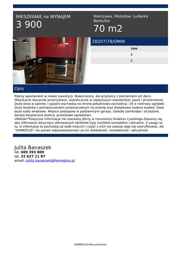 Warszawa, Mokotów, Ludwika Narbutta MIESZKANIE na WYNAJEM 3 900 70 m2 28207/78/OMW 2006 5 2 Opis Piękny apartament w nowej inwestycji. Nowoczesny, ale przytulny z elementami art deco. Mieszkanie starannie przemyślane, wykończenie w najwyższym standardzie, jasne i przestrzenne. Duże okna w salonie i sypialni wychodzą na stronę południowo-zachodnią i 35-o metrowy ogródek. Duża łazienka z pomieszczeniem przeznaczonym na pralnię oraz dodatkowo osobna toaleta. Dwie duże szafy wnękowe. Miejsce postojowe w podziemnym garażu. Osiedle zamknięte i strzeżone, bardzo bezpieczna okolica, prestiżowe sąsiedztwo. UWAGA!*Powyższe informacje nie stanowią oferty w rozumieniu Kodeksu Cywilnego.Staramy się, aby informacje dotyczące oferowanych obiektów były możliwie kompletne i aktualne. Z uwagi na to, iż informacje te pochodzą od osób trzecich i część z nich nie zawsze daje się zweryfikować, AG "HOMEPLUS" nie ponosi odpowiedzialności za ich dokładność, kompletność i aktualność Julita Banaszek tel. 600 393 800 tel. 22 627 11 87 email: [email protected] HOMEPLUS Nieruchomości Powered by TCPDF (www.tcpdf.org)
