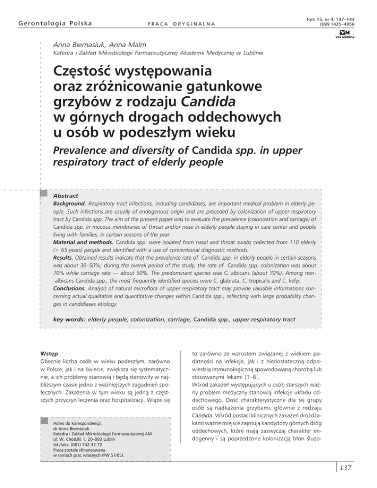 Gerontologia Polska PRACA ORYGINALNA tom 15, nr 4, 137–143 ISSN 1425–4956 Anna Biernasiuk, Anna Malm Katedra i Zakład Mikrobiologii Farmaceutycznej Akademii Medycznej w Lublinie Częstość występowania oraz zróżnicowanie gatunkowe grzybów z rodzaju Candida w górnych drogach oddechowych u osób w podeszłym wieku Prevalence and diversity of Candida spp. in upper respiratory tract of elderly people Abstract Background. Respiratory tract infections, including candidiases, are important medical problem in elderly people. Such infections are usually of endogenous origin and are preceded by colonization of upper respiratory tract by Candida spp. The aim of the present paper was to evaluate the prevalence (colonization and carriage) of Candida spp. in mucous membranes of throat and/or nose in elderly people staying in care center and people living with families, in certain seasons of the year. Material and methods. Candida spp. were isolated from nasal and throat swabs collected from 110 elderly (> 65 years) people and identified with a use of conventional diagnostic methods. Results. Obtained results indicate that the prevalence rate of Candida spp. in elderly people in certain seasons was about 30–50%; during the overall period of the study, the rate of Candida spp. colonization was about 70% while carriage rate — about 50%. The predominant species was C. albicans (about 70%). Among non-albicans Candida spp., the most frequently identified species were C. glabrata, C. tropicalis and C. kefyr. Conclusions. Analysis of natural microflora of upper respiratory tract may provide valuable informations concerning actual qualitative and quantitative changes within Candida spp., reflecting with large probability changes in candidiases etiology. key words: elderly people, colonization, carriage, Candida spp., upper respiratory tract Wstęp Obecnie liczba osób w wieku podeszłym, zarówno w Polsce, jak i na świecie, zwiększa się systematycznie, a ich problemy stanowią i będą stanowiły w najbliższym czasie jedno z ważniejszych zagadnień społecznych. Zakażenia w tym wieku są jedną z częstszych przyczyn leczenia oraz hospitalizacji. Wiąże się Adres do korespondencji: dr Anna Biernasiuk Katedra i Zakład Mikrobiologii Farmaceutycznej AM ul. W. Chodźki 1, 20–093 Lublin tel./faks: (081) 742 37 72 Praca została sfinansowana w ramach prac własnych (PW 57/05). to zarówno ze wzrostem związanej z wiekiem podatności na infekcje, jak i z niedostateczną odpowiedzią immunologiczną spowodowaną chorobą lub stosowanymi lekami [1–6]. Wśród zakażeń występujących u osób starszych ważny problem medyczny stanowią infekcje układu oddechowego. Dość charakterystyczne dla tej grupy osób są nadkażenia grzybami, głównie z rodzaju Candida. Wśród postaci klinicznych zakażeń drożdżakami ważne miejsce zajmują kandydozy górnych dróg oddechowych, które mają zazwyczaj charakter endogenny i są poprzedzone kolonizacją błon śluzo- 137 Gerontologia Polska 2007, tom 15, nr 4 wych gardła i/lub nosa przez grzyby z tego rodzaju [7, 8]. Celem niniejszej pracy była ocena dynamiki występowania (kolonizacji i/lub nosicielstwa) Candida spp. w obrębie błon śluzowych górnych dróg oddechowych u osób starszych z domu opieki społecznej oraz osób spoza zakładu opiekuńczego w 4 kolejnych badaniach przeprowadzonych w poszczególnych porach roku. — badanie III — listopad/grudzień 2002 r.; — badanie IV — marzec/kwiecień 2003 r. Do izolacji grzybów z rodzaju Candida zastosowano wybiórczo namnażające podłoże Sabourauda z chloramfenikolem (bioMerieux, Francja). Identyfikację wyodrębnionych szczepów prowadzono, charakteryzując wygląd morfologiczny kolonii, preparat mikroskopowy wybarwiony metodą Grama oraz wykorzystując mikrotesty ID 32 C i API 20 C AUX. Materiał i metody Przebadano wymazy z gardła i nosa pobrane od 110 osób w wieku powyżej 65 lat, spośród których 51 osób stanowili mieszkańcy jednego z lubelskich domów opieki społecznej (grupa I), a pozostałe 59 osób przebywało poza zakładem opiekuńczym (grupa II). Badania te prowadzono w następujących okresach: — badanie I — maj/czerwiec 2002 r.; — badanie II — sierpień/wrzesień 2002 r.; Wyniki Częstość występowania Candida spp. w obrębie górnych dróg oddechowych w obydwu grupach była zbliżona we wszystkich badaniach (ryc. 1 i 2). W grupie I wynosiła ogółem (ryc. 1A) od 39,22% (badanie I) do 52,94% (badanie III), zaś w grupie II (ryc. 2A) — odpowiednio 32,20–50,85%. Drożdżaki zasiedlały głównie błonę śluzową gardła: 39,22– 52,94% i 30,51–50,85% odpowiednio w grupie A B C Rycina 1. Dynamika występowania Candida spp. w górnych drogach oddechowych u osób w wieku podeszłym z grupy I w poszczególnych badaniach A. Candida spp. B. C. albicans C. nie-albicans Candida spp.; *liczba osób, u których grzyby z rodzaju Candida występowały równocześnie w obrębie gardła i nosa Figure 1. Prevalence of Candida spp. in upper respiratory tract of elderly people from group I in certain investigations A. Candida spp. B. C. albicans C. non-albicans Candida spp.; *number of people with concurrent ocurrence of Candida spp. in mucous membranes of throat and nose 138 www.gp.viamedica.pl Anna Biernasiuk, Anna Malm, Candida spp. u osób w podeszłym wieku A B C Rycina 2. Dynamika występowania Candida spp. w górnych drogach oddechowych u osób w wieku podeszłym z grupy II w poszczególnych badaniach; A. Candida spp. B. C. albicans C. nie-albicans Candida spp. *liczba osób, u których grzyby z rodzaju Candida występowały równocześnie w obrębie gardła i nosa Figure 2. Prevalence of Candida spp. in upper respiratory tract of elderly people from group II in certain investigations; A. Candida spp. B. C. albicans C. non-albicans Candida spp. *number of people with concurrent ocurrence of Candida spp. in mucous membranes of throat and nose I i II. Znaczn