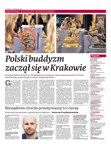 14 | Kraków | 14 października 2011 r. FOT.G.GRĄDALSKI FESTIWAL KULTURY BUDDYJSKIEJ Polskibuddyzm zacząłsięwKrakowie Podczas Festiwalu Kultury Buddyjskiej przeżyjemy fascynującą podróż do świata Nauk Buddy, posłuchamy muzyki i obejrzymy filmy dy w 1976 roku pierwszy zachodni uczeńnajwiększego mistrza buddyzmu tybetańskiego XX wieku – 16 Karmapy – Lama Ole Nydahl wraz ze swoją żoną HannahprzyjechalidoKrakowa, nikt nie spodziewał się, co przyniesie z sobą ta wizyta. To właśniestądideebuddyzmutybetańskiego zaczęły promieniować na całą centralną i wschodnią Europę, zaczynając oczywiście odPolski. Po35latachwnaszym kraju jest już ponad 60 ośrodków medytacyjnych, w których tysiące ludzi uczestniczą w kursachimedytacjach. G Buddyzm nie jest religią wiary opartą na kulcie jakiegoś boga, lecz systemem, którego celemjestszczęściejaknajwiększej ilości istot. Nie jest też wyłącznie intelektualną teorią, ale przede wszystkim zbiorem praktycznych wskazówek do pracy z własnym umysłem. Te podstawowe założenia sprawiają, że buddyzm tak łatwo znajduje dla siebie miejsce we współczesnymświeckimspołeczeństwie, przestając być wschodnią egzotyką i stając się naturalnym elementem zachodniego sposobu życia. Zanimbuddyzmdotarłnazachód, „wędrował” po kolejnych krajach Azji, w których zawsze przynosiłpożyteklokalnymspołeczeństwom (Chiny, Japonia, Korea itd.). Zpewnościąjegogłębokiuniwersalizmpozwolinato równieżnaZachodzie. Dzięki Festiwalowi Kultury Buddyjskiej„PrzestrzeńUmysłu” będziemożna zapoznaćsięz35letnią historią buddyzmu Diamentowej Drogi w Polsce. Jest to historiawypracowaniaprzejrzystej, zrozumiałej dla współczesnego Europejczyka formy buddyjskiej praktyki pozwalającej na przeżywanie pełnego potencjału tkwiącego w umyśle każdegoczłowieka. Filmyi wystawy zabiorą nas w podróż do mi- stycznychmiejscniedostępnych dla większości (np. klasztory Bhutanu, Tybetu), gdzie poznamy wyjątkowych mistrzów medytacji (np. Lama Tsechu Rinpocze). Nie można przeoczyć wykładówzpograniczapsychologii,filozofii,medytacjiizachodniejhistorii, prowadzonych przez polskichizagranicznychnauczycieli buddyzmu Diamentowej Drogi oraz dnia otwartego w ośrodku medytacyjnym. Dzięki tym wszystkimwydarzeniombędzie się można przekonać, z jaką łatwością ponadczasowe nauki Buddy asymilują się w nowoczesnymspołeczeństwie. Kolejną atrakcją będą spotkania z autorami filmów, prezentacja niezwykłego projektu filmowego „Lama 24h” – dokumentującego ogólnoświatową aktywność Lamy Ole Nydahla, od kilkudziesięciu lat rozpowszechniającego nauki buddyzmu tybetańskiego na Zachodzie. Zapraszamy również na koncerty muzyków związanych z buddyzmem oraz imprezę z okazji 35-lecia buddyzmu wPolsce.Wstępnafilmykosztuje 12zł(podBaranami)i5zł(Sfinks) za seans, koncert w Alchemii – 10 zł. Wstęp na pozostałe wydarzeniajestbezpłatny. Szczęśliwe chwile przeżywamy tu i teraz Rozmowa z teoretykiem i praktykiem buddyzmu – Arturem Przybysławskim mierze na koncentracji, służy temu, by po prostu lepiej żyć. Zasady buddyzmu weryfikuje się bowiem zawsze w codziennym życiu. Sprawdzamy, ile mamy dystansu do świata i ile potrafimy czerpać z niego radości. Każdą, nawet banalną, sytuację próbujemy przekształcić w krok na drodze rozwoju. Co może dać nam dziś buddyzm? Czy rozwój ten możemy osiągnąć dzięki praktyce medytacji? Tak. Ta precyzyjna metoda, która stanowi niejako trening umysłu, polegający w dużej FOT. ANDRZEJSZOPA Jeśli przyjmiemy, że buddyzm jest badawczym spojrzeniem w głąb naszego wewnętrznego świata, możemy odkryć, jak funkcjonuje nasz umysł i nauczyć się rozwijać nasze naturalne skłonności, takie jak otwartość na innych, współczucie, a nawet mądrość i nieustraszoność. Czy o medytacji usłyszymy także podczas wykładów, które odbędą się w ramach Festialu Kultury Buddyjskiej? Medytacji będą poświęcone specjalne warsztaty, a pod- czas wykładów usłyszymy przede wszystkim o europejskim obliczu buddyzmu i historii tej religii w Polsce. Ja sam wygłoszę wykład o buddyjskiej psychologii z przymrużeniem oka. Czy w Festiwalu Kultury Buddyjskiej mogą wziąć udział wyznawcy innych niż buddyzm religii? A dlaczego z przymrużeniem oka? Jaka buddyjska zasada towarzyszy Ci w życiu? Ponieważ buddyzm to inteligentne, ale i radosne przeżywanie świata, którego wcale nie trzeba traktować aż tak poważnie, jak to zwykliśmy robić. A jedyną świętością dla buddyzmu jest szczęście drugiego człowieka i jego podstawowe prawo do wolności. Bliskie mi są nauki o tym, jak przeżywać szczęście już tu i teraz, bez oglądania się na przeszłość i przyszłość. Gdyż, jak powiedział Budda, „Nie istnieje droga do szczęścia – to samo szczęście jest drogą”. Oczywiście. Mam nadzieję, że wezmą w nim udział osoby o różnych światopoglądach. Rozmawiała Urszula Wolak Program 17 PAŹDZIERNIKA Godz. 18.00 Kino Agrafka Wykład: „Jak mądrość Wschodu dotarła na Zachód” – Marek Witek 18 PAŹDZIERNIKA Godz. 18.15 Kino Pod Baranami „Nauka o stanie umysłu” Godz. 19.15 „Buddyzm we współczesnym świecie” 19 PAŹDZIERNIKA Godz. 19 Collegium Medicum, Aula C Wykład: „Świat jest tylko umysłem, czyli psychologia buddyjska z przymrużeniem oka” – Artur Przybysławski 20 PAŹDZIERNIKA Godz. 18 Kino Agrafka Wykład: „Buddyjski pogląd w codziennym życiu człowieka Zachodu”, Marcin Barański 21 PAŹDZIERNIKA Godz. 18 Kino Agrafka Wykład: „Pustka jako pełnia, czyli filozofia buddyjska z przymrużeniem oka” – Artur Przybysławski 22 PAŹDZIERNIKA Buddyjskim Ośrodku Medytacyjnym Warsztaty medytacyjne 23 PAŹDZIERNIKA Godz. 19 Klub Alchemia Koncert „Przestrzeń umysłu” – Makaruk & Rajski 24 PAŹDZIERNIKA Godz. 19 Piwnica Pod Baranami Prezentacja filmu „Lama 24h”, spotkanie z ekipą