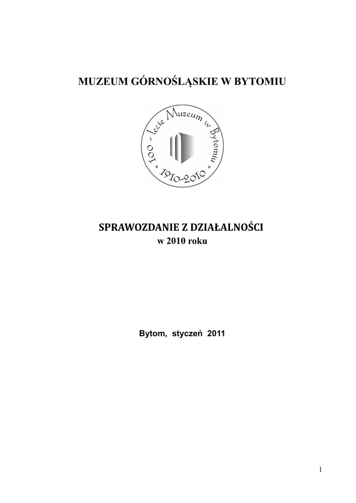 MUZEUM GÓRNOŚLĄSKIE W BYTOMIU SPRAWOZDANIE Z DZIAŁALNOŚCI w 2010 roku Bytom, styczeń 2011 1 DANE STATYSTYCZNE Frekwencja w 2010 r. - wystawy1 Gmach główny – Bytom, Plac Jana III Sobieskiego 2 − zwiedzających indywidualnie: 4 384 osoby − zwiedzających w grupach wycieczkowych: 4 747 osób − razem: 9 131 osób Pałac – Bytom, ul. W. Korfantego 34 − zwiedzających indywidualnie: 3 966 osób − zwiedzających w grupach wycieczkowych: 1 901 osób − razem: 5 867 osób Zwiedzających wystawy łącznie (frekwencja na wystawach łącznie): − indywidualnie: 8 350 osób − w grupach wycieczkowych: 6 648 osób − razem: 14 998 osób Wystawy Stałe – gmach główny (Plac Jana III Sobieskiego 2) 1. Przyroda Górnego Śląska („Lasy”; „Wody i mokradła”) - przyrodnicza 2. Galeria malarstwa polskiego – sztuka2 3. Z życia ludu śląskiego XIX-XX w. – etnografia Czasowe Własne (ze zbiorów własnych lub niemal własnych) 1. Obszar warowny „Śląsk” 1936-1939 – historyczna (pałac; 2009-do 12 lipca 2010) 3. 2. Militaria w obrazach. Międzynarodowa wystawa grafiki komputerowej o tematyce militarnej – historyczna (pałac; 2009 do 14 kwietnia). 3. Bizantyjskie oblicze Śląska. Ikony - sztuka (pałac; 2009-3 stycznia 2010). 4. Galeria sztuki współczesnej. Pokaz4 – sztuka (gmach główny i pałac; 2009-20 czerwca 2010. 5. Tajemnice placu Grunwaldzkiego z cyklu wystaw „Bytom znany i nieznany – wielodyscyplinarna (archeologia, historia); pałac; 28 kwietnia-12 lipca 2010. 6. Święci – atrybuty i symbole- etnograficzna (gmachu głównym; 16 grudnia 2010 – 27 luty 2011). Użyczone z innych placówek/instytucji (w tym odpłatnie) 1 2 3 Okresowo część wystaw była zamknięta: w gmachu głównym z powodu przeciekania dachu i doraźnych prac remontowych, natomiast w pałacu – z powodu remontu co, malowania pomieszczeń (lipiecgrudzień 2010) itd. Od 1 czerwca do 31 lipca 2010 r. wystawa była nieczynna z powodu przeciekania dachu budynku. Od lipca do praktycznie końca grudnia w pałacu przy ul. W. Korfantego 34 trwał remont związany z wymianą co oraz pracami towarzyszącymi. 1. Podróże w czasie. Dawne widoki Śląska na grafikach z kolekcji Haselbacha; zorganizowana przez Niemieckie Forum Kultury Środkowej i Wschodniej w Poczdamie – gmach główny (2009-24 stycznia 2010) 2. Bernhard Grzimek. Z Nysy do Serengeti; przygotowana przez Oberschlesisches Landesmuseum w Ratingen (gmach główny; 12 luty-30 kwietnia 2010). 3. Diorama Tadeusza Popiela i Zygmunta Rozwadowskiego „Bitwa pod Grunwaldem 1410” - pałac; 7 do 27 kwietnia 2010. 4. Portret ojca - wystawa pokonkursowa prac dziecięcych zorg. przez Urząd Miejski w Bytomiu w ramach III Metropolitarnego Święta Rodziny (24 maja-do 4 czerwca 2010). 5. Fotografia dzikiej przyrody – przyrodnicza (firma Zegarliński, Bydgoszcz; 7 do 30 maja 2010).. 6. Ptaki polskie - zorganizowana przez Polskie Stowarzyszenie Fotograficzne Nikona; gmach główny (3 czerwca do 20 września 2010 r. 7. Portret ze świata - fotografie Edwarda Grzegorza Funke (gmach główny; 23 września -31 października 2010 r. 8. Isia, Krysia, Krystyna - fotografie tragicznie zmarłej senator RP Krystyny Bochenek. Ekspozycja przeniesiona z Radia Katowice, zmodyfikowania, przygotowana przez T. Raczyńskiego (16 października - 6 listopada 2010). Frekwencja w 2010 r. – działalność edukacyjna Zajęcia w świetlicy Muzeum Górnośląskiego (pl. Jana III Sobieskiego 2) L.p. 1 2 3 4 5 6 7 8 9 10 11 Rodzaj działań Ilość zajęć Frekwencja Adresatem dzieci i młodzież Lekcje muzealne - Spotkania z wiedzą 12 464 Zajęcia edukacyjne (org. własna) - Mozaiki 9 43 Zajęcia edukacyjne Malowanie piaskowych 9 143 krajobrazów (org. własna) Festyn z okazji Dnia Dziecka (org. własna) 1 700 Konkursy (różne; organizacja własna i przez 10 280 osoby zaproszone) Koncerty (osób/zespołów zaproszonych) 7 683 Odbiorcy indywidualni korzystający z 75 zabawek edukacyjnych (soboty – wstęp wolny; org. własna) Adresatem ogół odbiorców Wykłady (różne, głównie osób 10 473 zaproszonych) Cykl Skarby Muzeum Górnośląskiego (org. 3 70 własna) Wystawy (org. własna lub pozyskane) 3 272 Inni adresaci (specjaliści, również ogół odbiorców) Spotkania naukowe (entomologiczne, 11 363 ornitologiczne, archeologiczne, sesje naukowe, itd.) Ogółem 75 spotkań 3 566 osób Lekcje muzealne – sobotnie Spotkania z wiedzą 3 1. Sobotnie spotkanie ze sztuką Kolory kosmosu (A.Rak; 16.01. 2010) 2. Sobotnie spotkanie z wiedzą Historia ubioru (I. Mohl; 23.01. 2010) 3. Sobotnie spotkanie z archeologią Egipt cz. III (D.Podyma; 6.02. 2010) 4. Sobotnie spotkanie z etnografią Zwyczaje wielkanocne (M. Kuczyńska; 27.03. 2010) 5. Gady świata – spotkanie przyrodnicze (A.Pająk; 9.10.2010) 6. Spotkanie z archeologią – „Życie codzienne w starożytnym Egipcie” (D.Kupras, D.Podyma; 16.10.2010) 7. Sobotnie spotkanie z archeologią - „Życie pozagrobowe w starożytnym Egipcie” (D. Kupras, D. Podyma; 20.11.2010) 8. Sobotnie spotkanie ze sztuką – „Strój i biżuteria w starożytnym Egipcie” (I.Mohl, A.Rak; 27.11.2010) 9. Sobotnie spotkanie z archeologią „Życie społeczne w starożytnym Egipcie” (D.Kupras; 11.12.2010). Lekcje muzealne oraz zajęcia dla grup przedszkolnych (projekt „Dzieci w muzeum”) Temat Ilość lekcji Prowadzący Opis obrazu z ćwiczeniami literackimi 23 A. Rak Kosmos 6 A.Rak Portret 2 A.Rak Jak stać się artystą? 3 A.Rak M. Ryś Smok Wawelski – inscenizacja do obrazu „Widok Wawelu” 12 A.Rak M. Ryś Jabłuszko 11 A.Rak M. Ryś Emocje zamknięte w obrazie 6 A.Rak Neoklasycyzm 3 A.Rak Historia koloru 1 A.Rak Dziadek mi opowiedział 2 Podolecka Kiedy nasi dziadowie byli dziećmi 4 Podolecka Kto mieszka pod paprotką? 12 A. Larysz Co widzę i słyszę idąc polną ścieżką? 2 A. Larysz Lasy, łąki i mokradła 4 A. Larysz Ptaki ich głosy i zwyczaje 3 A. Larysz Gliniane skarby 2 M. Brudek Z życia 