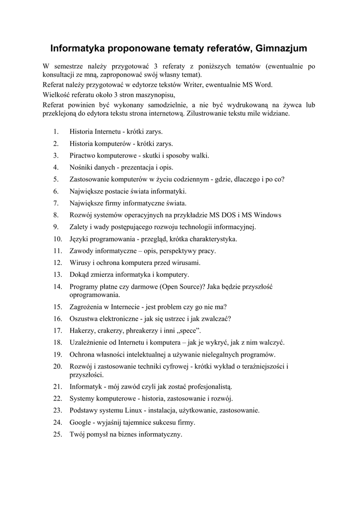 Informatyka proponowane tematy referatów, Gimnazjum W semestrze należy przygotować 3 referaty z poniższych tematów (ewentualnie po konsultacji ze mną, zaproponować swój własny temat). Referat należy przygotować w edytorze tekstów Writer, ewentualnie MS Word. Wielkość referatu około 3 stron maszynopisu, Referat powinien być wykonany samodzielnie, a nie być wydrukowaną na żywca lub przeklejoną do edytora tekstu strona internetową. Zilustrowanie tekstu mile widziane. 1. Historia Internetu - krótki zarys. 2. Historia komputerów - krótki zarys. 3. Piractwo komputerowe - skutki i sposoby walki. 4. Nośniki danych - prezentacja i opis. 5. Zastosowanie komputerów w życiu codziennym - gdzie, dlaczego i po co? 6. Największe postacie świata informatyki. 7. Największe firmy informatyczne świata. 8. Rozwój systemów operacyjnych na przykładzie MS DOS i MS Windows 9. Zalety i wady postępującego rozwoju technologii informacyjnej. 10. Języki programowania - przegląd, krótka charakterystyka. 11. Zawody informatyczne – opis, perspektywy pracy. 12. Wirusy i ochrona komputera przed wirusami. 13. Dokąd zmierza informatyka i komputery. 14. Programy płatne czy darmowe (Open Source)? Jaka będzie przyszłość oprogramowania. 15. Zagrożenia w Internecie - jest problem czy go nie ma? 16. Oszustwa elektroniczne - jak się ustrzec i jak zwalczać? 17. Hakerzy, crakerzy, phreakerzy i inni „spece”. 18. Uzależnienie od Internetu i komputera – jak je wykryć, jak z nim walczyć. 19. Ochrona własności intelektualnej a używanie nielegalnych programów. 20. Rozwój i zastosowanie techniki cyfrowej - krótki wykład o teraźniejszości i przyszłości. 21. Informatyk - mój zawód czyli jak zostać profesjonalistą. 22. Systemy komputerowe - historia, zastosowanie i rozwój. 23. Podstawy systemu Linux - instalacja, użytkowanie, zastosowanie. 24. Google - wyjaśnij tajemnice sukcesu firmy. 25. Twój pomysł na biznes informatyczny.