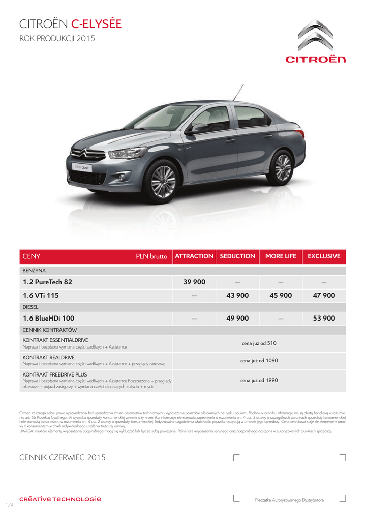 CITROËN C-ELYSÉE ROK PRODUKCJI 2015 CENY PLN brutto ATTRACTION SEDUCTION MORE LIFE EXCLUSIVE bENzYNA 1.2 PureTech 82 1.6 VTi 115 39 900 — — — — 43 900 45 900 47 900 — 49 900 — 53 900 DIESEL 1.6 BlueHDi 100 CENNIK KONTRAKTÓW KONTRAKT ESSENTIALDRIVE Naprawa i bezpłatna wymiana części wadliwych + Assistance KONTRAKT REALDRIVE Naprawa i bezpłatna wymiana części wadliwych + Assistance + przeglądy okresowe cena już od 510 cena już od 1090 KONTRAKT FREEDRIVE PLUS Naprawa i bezpłatna wymiana części wadliwych + Assistance Rozszerzone + przeglądy okresowe + pojazd zastępczy + wymiana części ulegających zużyciu + mycie cena już od 1990 Citroën zastrzega sobie prawo wprowadzania bez uprzedzenia zmian parametrów technicznych i wyposażenia pojazdów oferowanych na rynku polskim. Podane w cenniku informacje nie są ofertą handlową w rozumieniu art. 66 Kodeksu Cywilnego. W wypadku sprzedaży konsumenckiej zawarte w tym cenniku informacje nie stanowią zapewnienia w rozumieniu art. 4 ust. 3 ustawy o szczególnych warunkach sprzedaży konsumenckiej i nie stanowią opisu towaru w rozumieniu art. 4 ust. 2 ustawy o sprzedaży konsumenckiej. Indywidualne uzgodnienia właściwości pojazdu następują w umowie jego sprzedaży. Cena cennikowa staje się elementem umowy z konsumentem w chwili indywidualnego ustalania treści tej umowy. UWAGA: niektóre elementy wyposażenia opcjonalnego mogą się wykluczać lub być ze sobą powiązane. Pełna lista wyposażenia seryjnego oraz opcjonalnego dostępna w autoryzowanych punktach sprzedaży. CENNIK CZERWIEC 2015 Pieczątka Autoryzowanego Dystrybutora 1/4 CITROËN C-ELYSÉE WAŻNIEJSzE ELEMENTY WYPOSAŻENIA KOD OPCJE ATTRACTION SEDUCTION MORE LIFE EXCLUSIVE AB11 Alarm — — — 1000 NA01 Fotele przednie podgrzewane (Opcja dostępna tylko z tapicerką 8JFX) — — — 700 RE01 Klimatyzacja manualna — S — — RE02 Klimatyzacja manualna z wyświetlaczem cyfrowym — 400 S S UB01 Wspomaganie parkowania - czujnik tył + WLA0 — 2000 S — UB01 Wspomaganie parkowania - czujnik tył — — — S PR01 Reektory przeciwmgłowe — S S S LT02 Szyby przednie sterowane elektrycznie S S S S LE03 Szyby tylne sterowane elektrycznie — 400 S S — 800 S S Pakiet zimowy: podgrzewane fotele przednie + ogrzewana dolna część szyby przedniej. Opcja dostępna tylko dla tapicerek […FX] — 1000 — 1000 AbS S S S S Automatyczna blokada zamków po ruszeniu S S S S Automatyczne włączanie świateł awaryjnych w przypadku nagłego hamowania S S S S ESP S S S S Fotel kierowcy regulowany na wysokość S S S S Kanapa tylna dzielona dzielona 2/3 - 1/3 — S S S Kanapa tylna niedzielona ze zintegrowanymi zagłówkami S — — — Kierownica i gałka dźwigni zmiany biegów pokryte skórą — — — S Kieszenie w oparciach foteli przednich S S S S Klamki wewnętrzne drzwi w kolorze chromu — S S S Klamki zewnętrzne drzwi i obudowy lusterek bocznych w kolorze czarnym S — — — Klamki zewnętrzne drzwi lakierowane — S S S Kluczyk z oddzielnym otwieraniem klapy bagażnika — S S S Kolumna kierownicy regulowana na wysokość S S S S Lakierowane osłony lusterek bocznych — S S S Lakierowane zderzaki z przodu i z tyłu S S S S Lampka sutowa tylna — — — S Lusterka podgrzewane — S S S Lusterka boczne sterowane elektrycznie — S S S Mocowania Isox na tylnych siedzeniach S S S S Obrotomierz S S S S Podłokietnik środkowy przedni ze zintegrowanym schowkiem — — — S Poduszka powietrzna kierowcy S S S S Poduszka powietrzna pasażera S S S S Poduszki powietrzne boczne S S S S Reektory ze światłami do jazdy dziennej S S S S Regulator prędkości z ogranicznikiem — S S S Schowek po stronie pasażera zamykany S S S S Włącznik zamka centralnego na desce rozdzielczej S S S S Wskaźnik optymalnego przełożenia biegów S S S S GV04 WF04 2/4 PLN brutto Pakiet Look: chromowane wstawki na zderzaku przednim + Listwy chromowane przy szybach bocznych Wspomaganie kierownicy elektryczne S S S S Wstawka dekoracyjna na boczkach drzwi w kolorze Sun Silver — — — S Wykończenie deski rozdzielczej czarne matowe S — — — Wykończenie deski rozdzielczej i konsoli centralnej w kolorze Tungstène — S S — Wykończenie deski rozdzielczej i konsoli centralnej w kolorze beżowym Sunsilver — — — S zagłówki przednie regulowane na wysokość S S S S zamek centralny sterowany pilotem S S S S S - Standard — - Nie występuje 200 - Cena opcji (S) - Standard uzależniony od zamówionych opcji CITROËN C-ELYSÉE WAŻNIEJSzE ELEMENTY WYPOSAŻENIA KOD SYSTEMY AUDIO I TELEMATYCzNE PLN brutto ATTRACTION SEDUCTION MORE LIFE EXCLUSIVE WLQD Radio CD MP3 ze integrowanym wyświetlaczem + 2 głośniki — S — — WLA0 Radio CD MP3 ze zintegrowanym wyświetlaczem + 4 głośniki + zestaw głośnomówiący bluetooth + port USb (zawiera RE01) — — — — WLA0 Radio CD MP3 ze zintegrowanym wyświetlaczem + 4 głośniki + zestaw głośnomówiący bluetooth + port USb (Zawiera sterowanie w kierownicy) — 1000 S S Instalacja do montażu radia + antena (okablowanie do radia i dwóch głośników) S — — — Komputer pokładowy S S S S zestaw głośnomówiący bluetooth + port USb — — — S Obręcze stalowe z oponami 185/65 15" z kołpakami Whaletail + koło zapasowe S — — — Obręcze stalowe z oponami 185/65 15" z kołpakami Asterodea + koło zapasowe — S S — ZH75 Obręcze kół ze stopów lekkich 15" Tuorla + koło zapasowe 15" — 1600 1600 S ZH1L Obręcze kół ze stopów lekkich 16" boston + koło zapasowe 15" — — — S Czujnik ciśnienia w ogumieniu (pośredni) S S S S KOŁA TAPICERKI 8GFX Tapicerka materiałowa Cubisa ciemna S — — — 27FX Tapicerka materiałowa birdy ciemna — S S — 27FZ Tapicerka materiałowa birdy jasna — S S — 8JFX Tapicerka materiałowa Waxe ciemna — — — S 8JFZ Tapicerka materiałowa Waxe jasna — — — S LAKIERY 3/4 P0WP blanc banquise S S S S M0T6 bleu Kyanos 1800 1800 1800 1800 