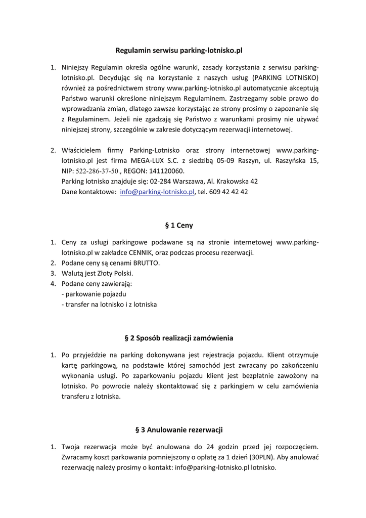 § 4 Reklamacje 1. Reklamacje dotyczące niewykonania lub nieprawidłowego wykonania usługi parkingowej muszą, pod rygorem nieważnosci, zostać zgłoszone firmie MEGA-LUX S.C. w formie pisemnej w ciągu 24 godzin od wjazdu na adres [email protected]. § 5 Ochrona danych osobowych 1. MEGA-LUX S.C. zobowiązuje się do poszanowania Państwa prywatności w internecie oraz dołoży wszelkich starań w zakresie właściwego zabezpieczenia wszelkich powierzonych nam danych ("Dane osobowe"). 2. Dane osobowe to dane, używane do zidentyfikowania konkretnej osoby, obejmujące: imię i nazwisko, adres domowy lub inny adres korespondencyjny, adres poczty elektronicznej lub inne informacje umożliwiające skontaktowanie się z daną osobą. Nadmieniamy jednocześnie, że strony internetowe Parking Lotnisko można przeglądać bez podawania swoich personaliów. 3. W przypadku, w którym zdecydują się Państwo udostępnić nam swoje dane osobowe, mogą być one wykorzystywane wyłącznie w obrębie firmy MEGA-LUX S.C. lub prezentowane naszym Partnerom, Klientom oraz Dostawcom - bez możliwości ich przetwarzania oraz udostępniania osobom i podmiotom trzecim. 4. Dane Osobowe są przetwarzane zgodnie z ustawą z dnia 29 sierpnia 1997 r. o ochronie danych osobowych "każdej osobie przysługuje prawo do kontroli przetwarzania danych, które jej dotyczą". 5. W celu realizowania płatności internetowych dane będą udostępniane PayU SA, która jest również Administratorem Danych Osobowych. "Cookies" 1. Serwis internetowy Parking Lotnisko korzysta z tzw. "cookies" oraz innych technologii identyfikacji. "Cookie" to niewielki plik tekstowy, służący na przykład do gromadzenia informacji o aktywności na danej stronie internetowej. Niektóre "cookies" i inne technologie śledzenia wykorzystuje się do wywoływania danych osobowych podanych wcześniej przez użytkownika strony internetowej. Większość przeglądarek umożliwia sterowanie obsługą "cookies", obejmujące ustalenie, czy mają one być odbierane lub nie, jak również sposób ich usuwania. Większość przeglądarek można ustawić tak, by informowały o nadejściu pliku "cookie" można też wybrać opcję blokowania "cookies". 2. Technologie śledzenia mogą zapisywać takie informacje jak: nazwa domeny internetowej lub hosta, adres IP, typ przeglądarki i systemu operacyjnego, sekwencje klawiszy oraz datę i porę (czas) odwiedzin naszej strony. Zastosowanie plików "cookie" oraz innych technologii śledzenia umożliwia nam dokonywanie poprawek i ulepszeń na naszych stronach, co pozytywnie wpływa na ich odbiór. Daje to nam również możliwość analizowania informacji nie zawierających danych osobowych dla celów statystycznych oraz ustalania zainteresowania poszczególnymi częściami witryny internetowej. " Bezpieczeństwo" 1. Niezależnie od tego, gdzie są przechowywane dane osobowe (w firmie MEGA-LUX S.C. lub przez inne podmioty działające w jej imieniu), zobowiązujemy się podjąć odpowiednie działania mające na celu ich ochronę przed nieupoważnionym dostępem lub ujawnieniem osobom trzecim. " Zasady prywatności dotyczące dzieci" 1. Witryna nie jest przeznaczona dla dzieci. W związku z tym nie zamierzamy zbierać danych osobowych od osób poniżej 16 roku życia. " Wyrażenie zgody" 1. Korzystanie z niniejszej witryny internetowej jest równoznaczne z wyrażeniem zgody na warunki przedstawione powyżej. W przypadku pytań związanych z innymi aspektami prywatności - związanych z użytkowaniem serwisu prosimy kierować je na adres e-mail: [email protected] § 6 Formy płatności 1. Płatność za parkowanie dokonywana jest poprzez system płatności internetowych Pay U S.A. lub gotówką w dniu wjazdu na parking. 2. Opłata parkingowa liczona jest za każde kolejne rozpoczęte 24 godziny postoju pojazdu. Ponieważ wysokość opłaty w procesie rezerwacji miejsca parkingowego jest obliczana na podstawie danych, które wprowadzasz do formularza rezerwacji, może być ona wyższa – zależnie od rzeczywistej długości parkowania. 3. Nie zwracamy opłaty za parkowanie niewykorzystane lub krótsze od zarezerwowanego.