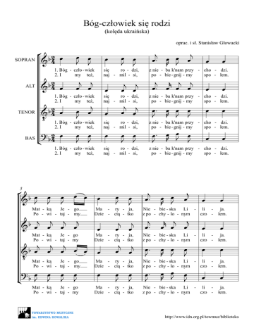 Bóg-człowiek się rodzi (kolęda ukraińska) SOPRAN oprac. i sł. Stanisław Głowacki ° 2 œ & b4 œ œ J J 2 & b4 œ j j œ œ 1. Bóg - czło - wiek 2. I my też, ALT się ro - dzi, naj - mil - si, 1. Bóg - czło - wiek 2. I my też, TENOR BAS ? 2 œ ¢ b4 my 5 œ J œ J œ œ J J œ œ Mat - ką Je - go Po - wi - taj - my j j j j &b œ œ œ œ Mat - ką Je - go Po - wi - taj - my j j j b œ œ œ œ œ & ‹ Mat - ką Je - go Po - wi - taj - my ? œ ¢ bJ œ J œ J œ J Mat - ką Je - go Po - wi - taj - my œ j j œ œ œ œ œ J J się ro - dzi, naj - mil - si, też, 1. Bóg - czło - wiek 2. I my też, ° œ &b J œ j j œ œ się ro - dzi, naj - mil - si, j 2 b œ œ œ & 4 J ‹ 1. Bóg - czło - wiek 2. I œ œ J J œ się ro - dzi, naj - mil - si, œ œ J œ J Ma - ry - ja, Dzie - cią - tko œ j j œ œ œ j j œ œ œ œ J Ma - ry - ja, Dzie - cią - tko Ma - ry - ja, Dzie - cią - tko œ J Ma - ry - ja, Dzie - cią - tko j œ™ j œ œ œ R J œ œ j œ™ r j j œ œ œ œ œ œ™ J œ œ œ R J J œ œ œ œ œ R J J œ z nie - ba k'nam przy - cho - dzi. po - bie - gnij - my spo - łem. z nie - ba k'nam przy - cho - dzi. po - bie - gnij - my spo - łem. z nie - ba k'nam przy - cho - dzi. po - bie - gnij - my spo - łem. œ™ J œ z nie - ba k'nam przy - cho - dzi. po - bie - gnij - my spo - łem. j œ™ œ œ R J j œ œ Nie - bie - ska Li - li z po - chy - lo - nym czo - j œ™ r j j œ œ œ œ œ™ J œ œ R J œ J œ œ œ R J œ J œ œ ja. łem. œ Nie - bie - ska Li - li z po - chy - lo - nym czo - ja. łem. Nie - bie - ska Li - li z po - chy - lo - nym czo - ja. łem. œ™ J Nie - bie - ska Li - li z po - chy - lo - nym czo - œ œ ja. łem. http://www.idn.org.pl/towmuz/biblioteka ° j j j j b & œ œ œ œ 2 9 Brzmi a - niel - skich j j j j &b œ œ œ œ Brzmi a - niel - skich & b œJ œJ œJ œJ ‹ Brzmi a - niel - skich ? œ ¢ b J Brzmi œ œ J J œ J a - niel - skich ° j j j j &b œ œ œ œ 13 ra - dość gło - si j j j j &b œ œ œ œ ra - dość gło - si & b œJ œJ œJ œJ ‹ ra - dość gło - si ? œ ¢ bJ œ J ra - dość œ J œ J gło - si œ J œ œ J œ j j œ œ œ œ gło - sów gło - sów chór, chór, œ J œ œ J œ J œ œ J œ J œ J ca - ły œ chór, œ świat, œ J œ œ J œ J ca - ły zie - mia swój j j œ œ œ do - da - je œ J œ J œ J œ œ J œ J œ J œ œ J œ œ J J œ œ świat, do - da - je j j j j œ œ œ œ na - ro - dzo - ny œ J œ J œ J j j œJ œ œ œ J na - ro - dzo - ny œ na - ro - dzo - ny œ J œ wtór, wtór, wtór, do - da - je j j j j œ œ œ œ œ J œ œ J do - da - je na - ro - dzo - ny świat, œ j j œJ œ œ zie - mia swój świat, ca - ły ca - ły j j j j œ œ œ œ zie - mia swój j j œ œ œ œ J œ J zie - mia swój gło - sów chór, gło - sów j j j j œ œ œ œ œ wtór, œ J œ j œ œJ œ œ J œ J œ œ J œ J œ Bóg, nasz brat. Bóg, nasz brat. Bóg, nasz brat. Bóg, nasz brat. http://www.idn.org.pl/towmuz/biblioteka ° j ™ b & ™ œ™ œ œ œJ R J œ™ j & b ™™ œ™ r j œ œ œ J œ™ 17 Śpie - szą doń Śpie - szą też Śpie - szą doń Śpie - szą też & b ™™ ‹ ? ™™ ¢ b ° &b ˙ 21 - rze - wie, &b ˙ - rze - wie, œ™ &b ‹ bie ™ ? œœ ™ ¢ b pa - ste kró - lo - pa - ste kró - lo ∑ ∑ œ œ œ J rze, wie, j œ - j œ™ rze, wie, œ œ œJ R J j œ™ 3 œ œ œJ R J œ™ r j œ œ œ J œ™ każ - dy, co ma, wiel - cy mo - nar - j œ™ œ™ każ - dy co ma, wiel - cy mo - nar - œ J bie cho bie cho j œ™ œ J - - - - j œ œ œ œJ R J Śpie - szą doń Śpie - szą też pa - ste kró - lo œ ™™ œ - rze, wie, każ - dy co ma, wiel - cy mo - nar - Śpie - szą doń Śpie - szą też pa - ste kró - lo - rze, wie, każ - dy, co ma, wiel - cy mo - nar - œ™ J œ œ œJ R J œ œ dla Je - zu - sa nio - są da - ry œ œ œ œ œ œ œ J œ œ œ œ œ J œ dla Je - zu - sa nio - są da - ry - rze dla Je - zu - sa cho - wie, nio - są da - ry œ bie - rze dla Je - zu - sa cho - wie, nio - są da - ry œ J œ™ J œ œ œJ R J œ œ œ œ ˙ J J J J ™™ œ œ œ œJ ˙ J J J j j j œ œ œj œ ˙ ™™ j j j œ ˙ œ œ œ J j j œ œ œ œJ ˙ J ™™ œj œ œj œ ˙ J J j j j j œ œ œ œ ˙ ™™ œj œj œj œj ˙ 1. na - ro - dzo - ne - go, na - ro - dzo - ne - mu, na - ro - dzo - ne - go, na - ro - dzo - ne - mu, na - ro - dzo - ne - go. na - ro - dzo - ne - mu. na - ro - dzo - ne - go, na - ro - dzo - ne - mu, 2. na - ro - dzo - ne - go. na - ro - dzo - ne - mu. na - ro - dzo - ne - go. na - ro - dzo - ne - mu. na - ro - dzo - ne - go. Na - ro - dzo - ne - mu. na - ro - dzo - ne - go. na - ro - dzo - ne - mu. http://www.idn.org.pl/towmuz/biblioteka