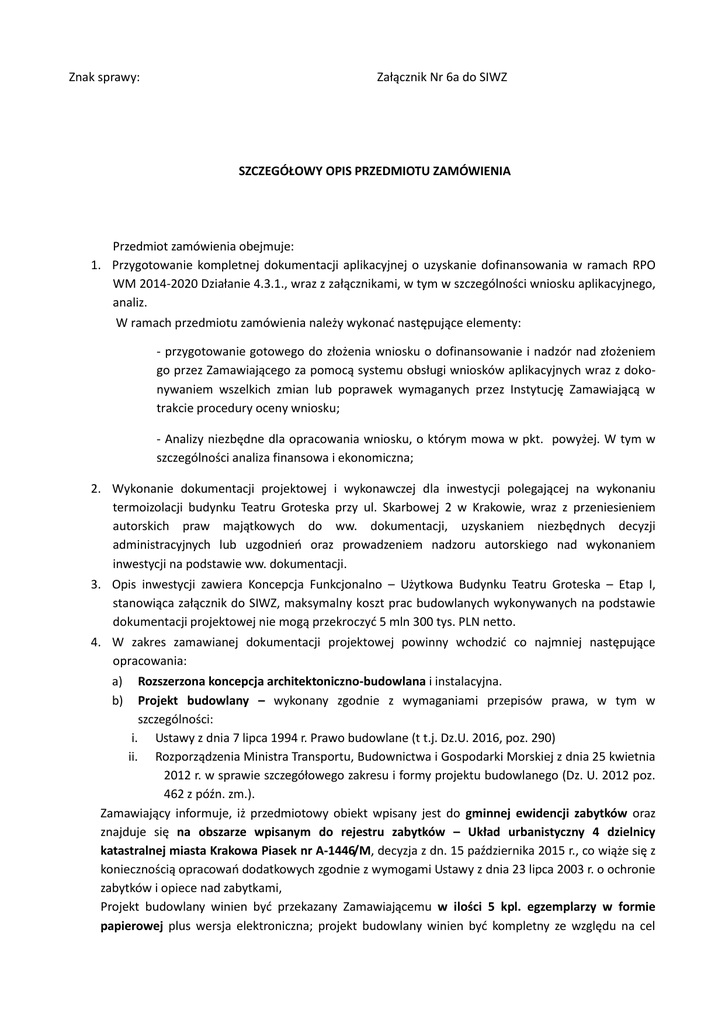 Znak sprawy: Załącznik Nr 6a do SIWZ SZCZEGÓŁOWY OPIS PRZEDMIOTU ZAMÓWIENIA Przedmiot zamówienia obejmuje: 1. Przygotowanie kompletnej dokumentacji aplikacyjnej o uzyskanie dofinansowania w ramach RPO WM 2014-2020 Działanie 4.3.1., wraz z załącznikami, w tym w szczególności wniosku aplikacyjnego, analiz. W ramach przedmiotu zamówienia należy wykonać następujące elementy: - przygotowanie gotowego do złożenia wniosku o dofinansowanie i nadzór nad złożeniem go przez Zamawiającego za pomocą systemu obsługi wniosków aplikacyjnych wraz z dokonywaniem wszelkich zmian lub poprawek wymaganych przez Instytucję Zamawiającą w trakcie procedury oceny wniosku; - Analizy niezbędne dla opracowania wniosku, o którym mowa w pkt. powyżej. W tym w szczególności analiza finansowa i ekonomiczna; 2. Wykonanie dokumentacji projektowej i wykonawczej dla inwestycji polegającej na wykonaniu termoizolacji budynku Teatru Groteska przy ul. Skarbowej 2 w Krakowie, wraz z przeniesieniem autorskich praw majątkowych do ww. dokumentacji, uzyskaniem niezbędnych decyzji administracyjnych lub uzgodnień oraz prowadzeniem nadzoru autorskiego nad wykonaniem inwestycji na podstawie ww. dokumentacji. 3. Opis inwestycji zawiera Koncepcja Funkcjonalno – Użytkowa Budynku Teatru Groteska – Etap I, stanowiąca załącznik do SIWZ, maksymalny koszt prac budowlanych wykonywanych na podstawie dokumentacji projektowej nie mogą przekroczyć 5 mln 300 tys. PLN netto. 4. W zakres zamawianej dokumentacji projektowej powinny wchodzić co najmniej następujące opracowania: a) b) Rozszerzona koncepcja architektoniczno-budowlana i instalacyjna. Projekt budowlany – wykonany zgodnie z wymaganiami przepisów prawa, w tym w szczególności: i. Ustawy z dnia 7 lipca 1994 r. Prawo budowlane (t t.j. Dz.U. 2016, poz. 290) ii. Rozporządzenia Ministra Transportu, Budownictwa i Gospodarki Morskiej z dnia 25 kwietnia 2012 r. w sprawie szczegółowego zakresu i formy projektu budowlanego (Dz. U. 2012 poz. 462 z późn. zm.). Zamawiający informuje, iż przedmiotowy obiekt wpisany jest do gminnej ewidencji zabytków oraz znajduje się na obszarze wpisanym do rejestru zabytków – Układ urbanistyczny 4 dzielnicy katastralnej miasta Krakowa Piasek nr A-1446/M, decyzja z dn. 15 października 2015 r., co wiąże się z koniecznością opracowań dodatkowych zgodnie z wymogami Ustawy z dnia 23 lipca 2003 r. o ochronie zabytków i opiece nad zabytkami, Projekt budowlany winien być przekazany Zamawiającemu w ilości 5 kpl. egzemplarzy w formie papierowej plus wersja elektroniczna; projekt budowlany winien być kompletny ze względu na cel jakiemu ma służyć oraz być wykonany w sposób umożliwiający uzyskanie na jego podstawie pozwolenia na budowę; 5. Zakres opracowania, o którym mowa w pkt. 4. to: a) Projekt budowlany architektury w zakresie: 1) projekt budowlany renowacji i remontu elewacji zewnętrznej (od strony ulic) oraz termoizolacji elewacji od podwórka wraz z renowacją rynien, gzymsów - zgodnie z wytycznymi zawartymi w załączniku 6c. 2) projekt budowlany wymiany okien i drzwi zewnętrznych o poziomie szczegółowości projektu wykonawczego co umożliwi przeprowadzenie przetargu na wykonanie w/w elementów – zgodnie z wytycznymi zawartymi w załączniku 6c. 3) projekt budowlany ocieplenia stropu kopuły, ocieplenia ścian zewnętrznych kopuły - zgodnie z wytycznymi zawartymi w załączniku 6c. 4) projekt budowlany architektury w zakresie przebudowy wnętrza wynikający z realizacji wewnętrznych instalacji w zakresie Sali Kopułowej i Teatralnej wraz z remontem w/w salach polegającym na przywróceniu stanu pierwotnego. 5) projekt budowlany konstrukcji w zakresie wynikającym z wprowadzonych zmian poprzez nowo projektowane instalacje wewnętrzne w zakresie Sali Kopułowej i Teatralnej, wraz z projektem przejść, przebić wynikających z w/w wewnętrznych instalacji oraz odbudowy i przywrócenia funkcji użytkowych amfiteatru i widowni Sali Kopułowej i Teatralnej 6) projekt budowlany wewnętrznej instalacji wentylacji mechanicznej nawiewno-wywiewnej z odzyskiem ciepła dla Sali Kopułowej i Sali Teatralnej (przy możliwości niezależnego użytkowania) w zakresie przestrzennym i powierzchniowym zależnym od przyjętych rozwiązań projektowych (proponowana wg koncepcji funkcjonalno -użytkowej lokalizacja central wentylacyjnych na dachu budynku), przejścia kanałów nawiewno-wywiewnych w zależności od przyjętych rozwiązań, projekt budowlany wewnętrznej instalacji chłodniczej zasilającej centrale wentylacyjne Sali Kopułowej i Sali Teatralnej. - zgodnie z wytycznymi zawartymi w załączniku 6b. 7) projekt budowlany instalacji C.O. umożliwiający: opomiarowanie zużycia ciepła w całym obiekcie w zakresie Sali Kopułowej i Teatralnej, wymianę istniejącego ogrzewania grzejnikami CO na ogrzewanie powietrzem z central wentylacyjnych zasilanie w ciepło central wentylacyjnych w oparciu o ciepło wodę grzewczą wg rozwiązań przyjętych w projekcie budowlanym projekt budowlany wewnętrznej instalacji chłodniczej zasilającej centrale wentylacyjne Sali Kopułowej i Sali Teatralnej - zgodnie z wytycznymi zawartymi w załączniku 6b. 8) projekt budowlany wewnętrznej instalacji elektrycznej: w zakresie Sali Kopułowej i Sali Teatralnej (rozbudowy, przebudowy spowodowanej przez wprowadzone zmiany) oraz w zakresie przestrzeni i powierzchni niezbędnych do osiągnięcia zamierzonego celu w koncepcji funkcjonalno-użytkowej a doprecyzowanych w rozszerzonej koncepcji architektoniczno-budowlanej tj. między innymi: zasilanie central wentylacyjnych od źródła pozwalającego na ich zasilanie, lub przebudowy wewnętrznej instalacji elektrycznej spowodowanej montażem wentylacji mechanicznej wraz z zakresem wymiany oświetlenia oraz projekt budowlany iluminacji świetlnej w zakresie elewacji, 9) wykonanie wszystkich niezbędnych opracowań dodatkowych koniecznych do uzyskania pozwolenia na budow