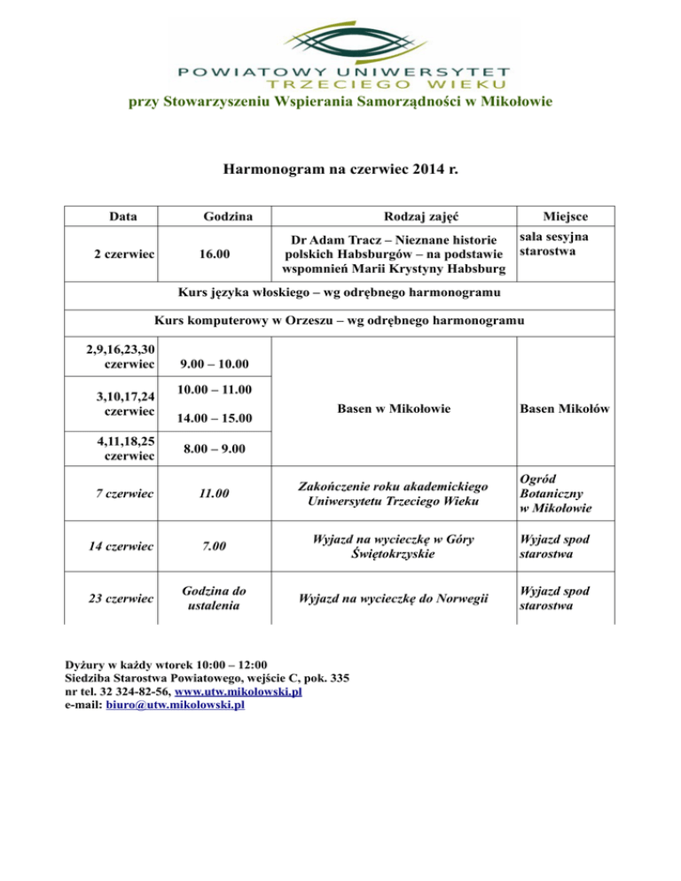 przy Stowarzyszeniu Wspierania Samorządności w Mikołowie Harmonogram na czerwiec 2014 r. Data Godzina 2 czerwiec 16.00 Rodzaj zajęć Dr Adam Tracz – Nieznane historie polskich Habsburgów – na podstawie wspomnień Marii Krystyny Habsburg Miejsce sala sesyjna starostwa Kurs języka włoskiego – wg odrębnego harmonogramu Kurs komputerowy w Orzeszu – wg odrębnego harmonogramu 2,9,16,23,30 czerwiec 3,10,17,24 czerwiec 4,11,18,25 czerwiec 9.00 – 10.00 10.00 – 11.00 14.00 – 15.00 Basen w Mikołowie Basen Mikołów 8.00 – 9.00 Ogród Botaniczny w Mikołowie 7 czerwiec 11.00 Zakończenie roku akademickiego Uniwersytetu Trzeciego Wieku 14 czerwiec 7.00 Wyjazd na wycieczkę w Góry Świętokrzyskie Wyjazd spod starostwa 23 czerwiec Godzina do ustalenia Wyjazd na wycieczkę do Norwegii Wyjazd spod starostwa Dyżury w każdy wtorek 10:00 – 12:00 Siedziba Starostwa Powiatowego, wejście C, pok. 335 nr tel. 32 324-82-56, www.utw.mikolowski.pl e-mail: [email protected]