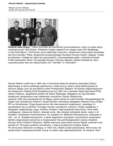 Henryk Sławik – zapomniany bohater Wpisany przez redakcja wtorek, 25 czerwca 2013 22:50 Historia mało znana * Oskar Schindler był niemieckim przemysłowcem, który w czasie wojny uratował ponad 1000 Żydów. Światowy rozgłos zapewnił mu swego czasu film Spielberga („Lista Schindlera”). Pod koniec życia należnego szacunku i stosownych zaszczytów doczekała się Irena Sendler, Polka, działaczka konspiracyjnego Komitetu Pomocy Żydom „Żegota”. Dzięki jej odwadze i inteligencji udało się wyprowadzić z warszawskiego getta i uratować przeszło 2.500 żydowskich dzieci. Kto pamięta dzisiaj o Henryku Sławiku, polskim bohaterze, który uratował prawie dwa raz więcej Żydów niż I. Sendler i O. Schindler? Henryk Sławik urodził się w 1894 roku w Szerokiej (obecnie dzielnica Jastrzębia Zdroju). Wychowany w duchu polskiego patriotyzmu, wziął czynny udział w akcji plebiscytowej na Górnym Śląsku oraz we wszystkich trzech Powstaniach Śląskich. W okresie międzywojennym był działaczem Polskiej Partii Socjalistycznej (od 1934 roku członkiem Rady Naczelnej PPS), radnym Katowic, długoletnim posłem do Sejmu Śląskiego, delegatem do Ligi Narodów, działaczem związkowym oraz redaktorem naczelnym Gazety Robotniczej. Jesienią 1939 roku przedostał się na Węgry, gdzie stanął na czele Komitetu Obywatelskiego ds. Opieki nad Uchodźcami Polskimi. Został również mianowany delegatem Ministra Pracy Rządu RP na Uchodźstwie. Organizował pomoc dla internowanych wojskowych, ułatwiając im przedostanie się na Zachód. Pomagał również uchodźcom cywilnym. Dzięki współpracy z delegatem węgierskiego rządu Józefem Antallem mógł wystawiać dokumenty, które wielu uciekającym, zwłaszcza Żydom, ratowały życie. Aby ratować żydowskie dzieci, razem z dr. Antallem, Zdzisławem Antoniewiczem, ks. prałatem dr. Miklósem Beresztóczym, biskupem w Vác – ks. dr. ÁrpádemHanauerem, a także węgierskim prymasem Jusztiniánem kardynałem Serédi zorganizował sierociniec w miejscowości Vác pod Budapesztem (zwany oficjalnie Domem Sierot Polskich Oficerów). Wedle obecnych szacunków Henryk Sławik uratował w ten sposób ok. 30 tysięcy polskich uchodźców, z tego przynajmniej 5 tysięcy Żydów. Po wkroczeniu Niemców na Węgry, w 1944 roku, Sławik został aresztowany. Mimo tortur nie wydał swoich współpracowników, biorąc na siebie całą odpowiedzialność. 24 sierpnia 1944 1/2 Henryk Sławik – zapomniany bohater Wpisany przez redakcja wtorek, 25 czerwca 2013 22:50 roku Henryk Sławik został zamordowany w niemieckim obozie koncentracyjnym Mauthausen-Gusen. Według świadków przed śmiercią krzyknął "Jeszcze Polska!". Niemcy aresztowali również żonę Henryka, Jadwigę. Osadzona w obozie Ravensbrück, przeżyła wojnę. Uratowała się również ich córka, Krystyna, którą ukryła rodzina Antallów. Piotr Pacak 2/2