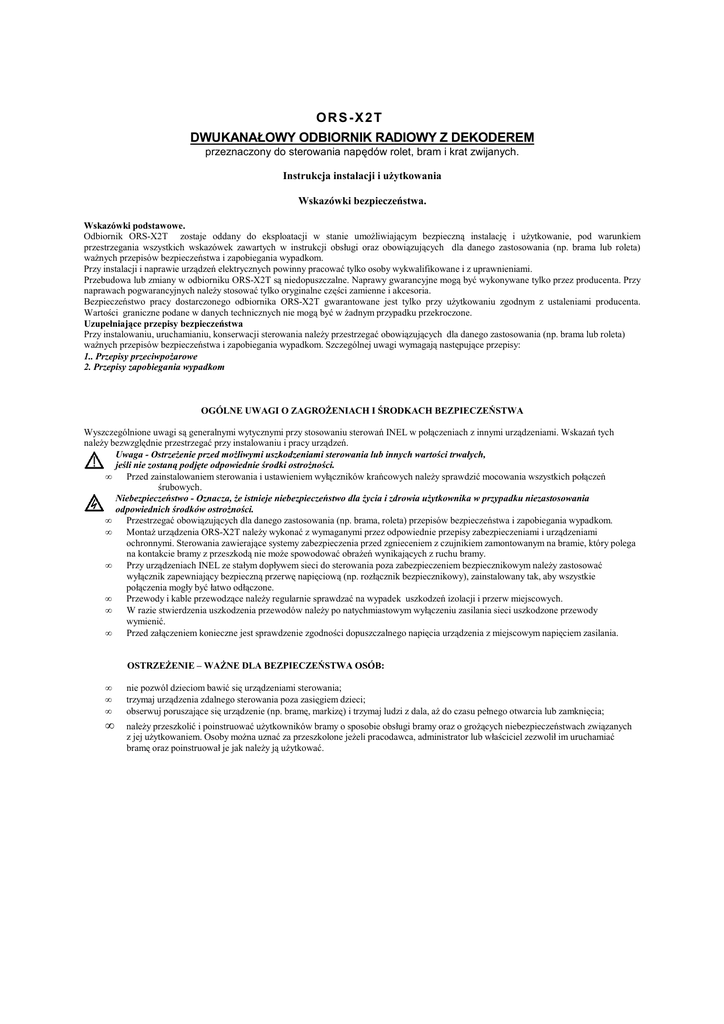 ORS-X2T DWUKANAŁOWY ODBIORNIK RADIOWY Z DEKODEREM przeznaczony do sterowania napędów rolet, bram i krat zwijanych. Instrukcja instalacji i uŜytkowania Wskazówki bezpieczeństwa. Wskazówki podstawowe. Odbiornik ORS-X2T zostaje oddany do eksploatacji w stanie umoŜliwiającym bezpieczną instalację i uŜytkowanie, pod warunkiem przestrzegania wszystkich wskazówek zawartych w instrukcji obsługi oraz obowiązujących dla danego zastosowania (np. brama lub roleta) waŜnych przepisów bezpieczeństwa i zapobiegania wypadkom. Przy instalacji i naprawie urządzeń elektrycznych powinny pracować tylko osoby wykwalifikowane i z uprawnieniami. Przebudowa lub zmiany w odbiorniku ORS-X2T są niedopuszczalne. Naprawy gwarancyjne mogą być wykonywane tylko przez producenta. Przy naprawach pogwarancyjnych naleŜy stosować tylko oryginalne części zamienne i akcesoria. Bezpieczeństwo pracy dostarczonego odbiornika ORS-X2T gwarantowane jest tylko przy uŜytkowaniu zgodnym z ustaleniami producenta. Wartości graniczne podane w danych technicznych nie mogą być w Ŝadnym przypadku przekroczone. Uzupełniające przepisy bezpieczeństwa Przy instalowaniu, uruchamianiu, konserwacji sterowania naleŜy przestrzegać obowiązujących dla danego zastosowania (np. brama lub roleta) waŜnych przepisów bezpieczeństwa i zapobiegania wypadkom. Szczególnej uwagi wymagają następujące przepisy: 1.. Przepisy przeciwpoŜarowe 2. Przepisy zapobiegania wypadkom OGÓLNE UWAGI O ZAGROśENIACH I ŚRODKACH BEZPIECZEŃSTWA Wyszczególnione uwagi są generalnymi wytycznymi przy stosowaniu sterowań INEL w połączeniach z innymi urządzeniami. Wskazań tych naleŜy bezwzględnie przestrzegać przy instalowaniu i pracy urządzeń. Uwaga - OstrzeŜenie przed moŜliwymi uszkodzeniami sterowania lub innych wartości trwałych, jeśli nie zostaną podjęte odpowiednie środki ostroŜności. • Przed zainstalowaniem sterowania i ustawieniem wyłączników krańcowych naleŜy sprawdzić mocowania wszystkich połączeń śrubowych. Niebezpieczeństwo - Oznacza, Ŝe istnieje niebezpieczeństwo dla Ŝycia i zdrowia uŜytkownika w przypadku niezastosowania odpowiednich środków ostroŜności. Przestrzegać obowiązujących dla danego zastosowania (np. brama, roleta) przepisów bezpieczeństwa i zapobiegania wypadkom. • • MontaŜ urządzenia ORS-X2T naleŜy wykonać z wymaganymi przez odpowiednie przepisy zabezpieczeniami i urządzeniami ochronnymi. Sterowania zawierające systemy zabezpieczenia przed zgnieceniem z czujnikiem zamontowanym na bramie, który polega na kontakcie bramy z przeszkodą nie moŜe spowodować obraŜeń wynikających z ruchu bramy. • Przy urządzeniach INEL ze stałym dopływem sieci do sterowania poza zabezpieczeniem bezpiecznikowym naleŜy zastosować wyłącznik zapewniający bezpieczną przerwę napięciową (np. rozłącznik bezpiecznikowy), zainstalowany tak, aby wszystkie połączenia mogły być łatwo odłączone. • Przewody i kable przewodzące naleŜy regularnie sprawdzać na wypadek uszkodzeń izolacji i przerw miejscowych. • W razie stwierdzenia uszkodzenia przewodów naleŜy po natychmiastowym wyłączeniu zasilania sieci uszkodzone przewody wymienić. Przed załączeniem konieczne jest sprawdzenie zgodności dopuszczalnego napięcia urządzenia z miejscowym napięciem zasilania. • OSTRZEśENIE – WAśNE DLA BEZPIECZEŃSTWA OSÓB: • • • • nie pozwól dzieciom bawić się urządzeniami sterowania; trzymaj urządzenia zdalnego sterowania poza zasięgiem dzieci; obserwuj poruszające się urządzenie (np. bramę, markizę) i trzymaj ludzi z dala, aŜ do czasu pełnego otwarcia lub zamknięcia; naleŜy przeszkolić i poinstruować uŜytkowników bramy o sposobie obsługi bramy oraz o groŜących niebezpieczeństwach związanych z jej uŜytkowaniem. Osoby moŜna uznać za przeszkolone jeŜeli pracodawca, administrator lub właściciel zezwolił im uruchamiać bramę oraz poinstruował je jak naleŜy ją uŜytkować. Instrukcja montaŜu i specyfikacja techniczna G1 D4 PR3, PR4 1, 2 24V DC 12V DC SW1 SW2 - gniazdo radioodbiornika, - dioda świecąca, - przekaźniki kanału 1 i 2 - zaciski przekaźników kanałów 1 i 2, - zasilanie 24VDC/AC niestabilizowane, - zasilanie 12VDC stabilizowane, - przycisk uczenia kodów - przycisk kasowania wyuczonych kodów, DANE TECHNICZNE DEKODERA ORS-X2T Napięcie zasilania 24V/DC/AC lub 12VDC, Pobór prądu 10mA (stand-by), Częstotliwość pracy 435MHz, Impedancja wejścia antenowego 50Ω, Liczba kanałów 2 Zasięg·· >>100m OPIS DZIAŁANIA DEKODERA Dekoder zdalnego sterowania ORS-X2T z dołączonym odbiornikiem radiowym pozwala na sterowanie dwóch niezaleŜnych urządzeń. Wyjścia dekodera stanowią dwie pary zacisków dołączonych do styków niezaleŜnych przekaźników. Dekoder moŜe współpracować z pilotami dwu i cztero kanałowymi. Po naciśnięciu klawisza na pilocie styki odpowiedniego przekaźnika zostaną zwarte na czas tym dłuŜszy, im dłuŜej będziemy trzymać naciśnięty klawisz pilota. Styki ulegną rozłączeniu ok. 1 sekundę po zwolnieniu klawisza na pilocie. Jednoczesne naciśnięcie obu klawiszy pilota nie powoduje zadziałania dekodera. W przypadku uŜycia pilota czterokanałowego klawisze Kan1. i Kan.2 normalnie sterują pracą przekaźników PR3 i PR4. PrzełoŜenie zwór I i II powoduje, Ŝe przekaźniki sterowane są klawiszami Kan3. i Kan4. Daje to moŜliwość obsługiwania jednym pilotem dwóch dekoderów, czyli do czterech niezaleŜnych urządzeń. ZASILANIE DEKODERA Dekoder moŜe być zasilany stałym lub zmiennym niestabilizowanym lub stabilizowanym napięciem 24V lub stałym 12VDC. REJESTRACJA (UCZENIE) PILOTÓW Dekoder ma moŜliwość nauczenia się i zapamiętania do 255 (dwustu pięćdziesięciu pięciu) róŜnych pilotów. W celu nauczenia dekodera nowego pilota naleŜy nacisnąć i przytrzymać przycisk uczenia SW1(uczenie 1-2). Dekoder odpowie zaświeceniem diody L5 na ok. 1 sekundę. Na