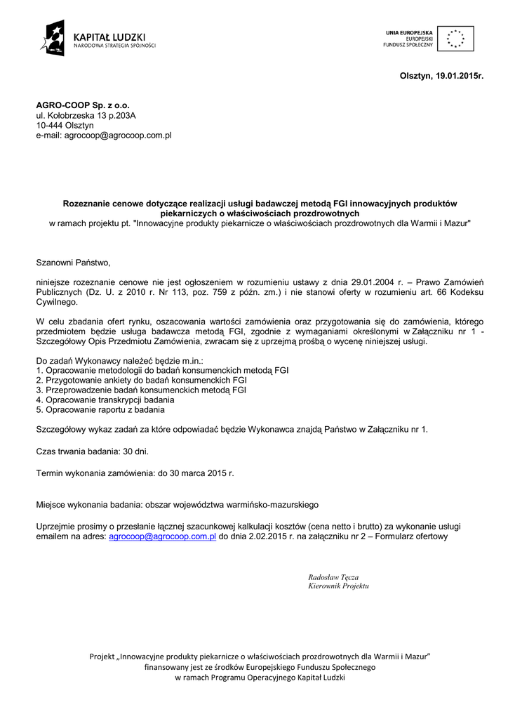 Olsztyn, 19.01.2015r. AGRO-COOP Sp. z o.o. ul. Kołobrzeska 13 p.203A 10-444 Olsztyn e-mail: [email protected] Rozeznanie cenowe dotyczące realizacji usługi badawczej metodą FGI innowacyjnych produktów piekarniczych o właściwościach prozdrowotnych w ramach projektu pt. "Innowacyjne produkty piekarnicze o właściwościach prozdrowotnych dla Warmii i Mazur" Szanowni Państwo, niniejsze rozeznanie cenowe nie jest ogłoszeniem w rozumieniu ustawy z dnia 29.01.2004 r. – Prawo Zamówień Publicznych (Dz. U. z 2010 r. Nr 113, poz. 759 z późn. zm.) i nie stanowi oferty w rozumieniu art. 66 Kodeksu Cywilnego. W celu zbadania ofert rynku, oszacowania wartości zamówienia oraz przygotowania się do zamówienia, którego przedmiotem będzie usługa badawcza metodą FGI, zgodnie z wymaganiami określonymi w Załączniku nr 1 Szczegółowy Opis Przedmiotu Zamówienia, zwracam się z uprzejmą prośbą o wycenę niniejszej usługi. Do zadań Wykonawcy należeć będzie m.in.: 1. Opracowanie metodologii do badań konsumenckich metodą FGI 2. Przygotowanie ankiety do badań konsumenckich FGI 3. Przeprowadzenie badań konsumenckich metodą FGI 4. Opracowanie transkrypcji badania 5. Opracowanie raportu z badania Szczegółowy wykaz zadań za które odpowiadać będzie Wykonawca znajdą Państwo w Załączniku nr 1. Czas trwania badania: 30 dni. Termin wykonania zamówienia: do 30 marca 2015 r. Miejsce wykonania badania: obszar województwa warmińsko-mazurskiego Uprzejmie prosimy o przesłanie łącznej szacunkowej kalkulacji kosztów (cena netto i brutto) za wykonanie usługi emailem na adres: [email protected] do dnia 2.02.2015 r. na załączniku nr 2 – Formularz ofertowy Radosław Tęcza Kierownik Projektu Projekt „Innowacyjne produkty piekarnicze o właściwościach prozdrowotnych dla Warmii i Mazur” finansowany jest ze środków Europejskiego Funduszu Społecznego w ramach Programu Operacyjnego Kapitał Ludzki