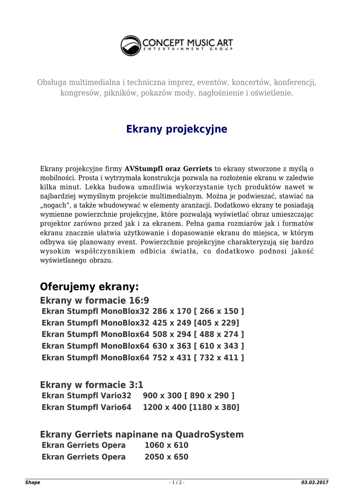 Obsługa multimedialna i techniczna imprez, eventów, koncertów, konferencji, kongresów, pikników, pokazów mody, nagłośnienie i oświetlenie. Ekrany projekcyjne Ekrany projekcyjne firmy AVStumpfl oraz Gerriets to ekrany stworzone z myślą o mobilności. Prosta i wytrzymała konstrukcja pozwala na rozłożenie ekranu w zaledwie kilka minut. Lekka budowa umożliwia wykorzystanie tych produktów nawet w najbardziej wymyślnym projekcie multimedialnym. Można je podwieszać, stawiać na „nogach”, a także wbudowywać w elementy aranżacji. Dodatkowo ekrany te posiadają wymienne powierzchnie projekcyjne, które pozwalają wyświetlać obraz umieszczając projektor zarówno przed jak i za ekranem. Pełna gama rozmiarów jak i formatów ekranu znacznie ułatwia użytkowanie i dopasowanie ekranu do miejsca, w którym odbywa się planowany event. Powierzchnie projekcyjne charakteryzują się bardzo wysokim współczynnikiem odbicia światła, co dodatkowo podnosi jakość wyświetlanego obrazu. Oferujemy ekrany: Ekrany w formacie 16:9 Ekran Ekran Ekran Ekran Ekran Stumpfl Stumpfl Stumpfl Stumpfl Stumpfl MonoBlox32 MonoBlox32 MonoBlox64 MonoBlox64 MonoBlox64 286 425 508 630 752 x x x x x 170 249 294 363 431 [ 266 x 150 ] [405 x 229] [ 488 x 274 ] [ 610 x 343 ] [ 732 x 411 ] Ekrany w formacie 3:1 Ekran Stumpfl Vario32 Ekran Stumpfl Vario64 900 x 300 [ 890 x 290 ] 1200 x 400 [1180 x 380] Ekrany Gerriets napinane na QuadroSystem Ekran Gerriets Opera Ekran Gerriets Opera Shape 1060 x 610 2050 x 650 -1/2- 03.03.2017 Specyfikacja techniczna Shape -2/2- 03.03.2017