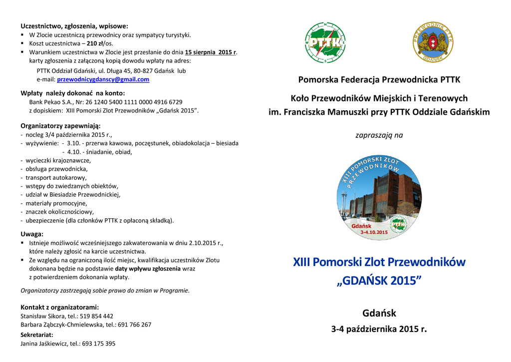 Uczestnictwo, zgłoszenia, wpisowe: W Zlocie uczestniczą przewodnicy oraz sympatycy turystyki. Koszt uczestnictwa – 210 zł/os. Warunkiem uczestnictwa w Zlocie jest przesłanie do dnia 15 sierpnia 2015 r. karty zgłoszenia z załączoną kopią dowodu wpłaty na adres: PTTK Oddział Gdański, ul. Długa 45, 80-827 Gdańsk lub e-mail: [email protected] Wpłaty należy dokonać na konto: Bank Pekao S.A., Nr: 26 1240 5400 1111 0000 4916 6729 z dopiskiem: XIII Pomorski Zlot Przewodników „Gdańsk 2015”. Pomorska Federacja Przewodnicka PTTK Koło Przewodników Miejskich i Terenowych im. Franciszka Mamuszki przy PTTK Oddziale Gdańskim Organizatorzy zapewniają: - nocleg 3/4 października 2015 r., - wyżywienie: - 3.10. - przerwa kawowa, poczęstunek, obiadokolacja – biesiada - 4.10. - śniadanie, obiad, - wycieczki krajoznawcze, - obsługa przewodnicka, - transport autokarowy, - wstępy do zwiedzanych obiektów, - udział w Biesiadzie Przewodnickiej, - materiały promocyjne, - znaczek okolicznościowy, - ubezpieczenie (dla członków PTTK z opłaconą składką). zapraszają na Uwaga: Istnieje możliwość wcześniejszego zakwaterowania w dniu 2.10.2015 r., które należy zgłosić na karcie uczestnictwa. Ze względu na ograniczoną ilość miejsc, kwalifikacja uczestników Zlotu dokonana będzie na podstawie daty wpływu zgłoszenia wraz z potwierdzeniem dokonania wpłaty. Organizatorzy zastrzegają sobie prawo do zmian w Programie. Kontakt z organizatorami: Stanisław Sikora, tel.: 519 854 442 Barbara Ząbczyk-Chmielewska, tel.: 691 766 267 Sekretariat: Janina Jaśkiewicz, tel.: 693 175 395 XIII Pomorski Zlot Przewodników „GDAŃSK 2015” Gdańsk 3-4 października 2015 r. Organizatorzy: Program XIII Pomorskiego Zlotu Przewodników „Współczesne inwestycje Gdańska” Pomorska Federacja Przewodnicka PTTK Koło Przewodników Miejskich i Terenowych im. Franciszka Mamuszki przy PTTK Oddziale Gdańskim 3.10.2015 – sobota: Patronat Honorowy: 8.00 - 9.00 Przyjmowanie i zakwaterowanie uczestników Zlotu w Hotelu „GRYF”. Marszałek Województwa Pomorskiego Prezydent Miasta Gdańska 10.15 - 11.45 SESJA PRZEWODNICKA – Ratusz Głównego Miasta, Wielka Sala Wety: Uroczyste powitanie uczestników Zlotu, Część oficjalna, Wystąpienie tematyczne: „Współczesne inwestycje Gdańska na tle walorów kulturowych” – Tomasz Błyskosz, Narodowy Instytut Dziedzictwa - Kierownik Oddziału Terenowego w Gdańsku, „Zdjęcie rodzinne” Braci Przewodnickiej. 12.00 - 14.45 WYCIECZKA /do wyboru/: 1. „Gdańsk przemysłowy” – Rafineria Gdańska, Terminal Kontenerowy DCT, 2. „Współczesność zabytkowych obiektów” – Gdański Teatr Szekspirowski, Centrum św. Jana. 15.00 - 18.00 Zwiedzanie i posiłek w Twierdzy Wisłoujście /z niespodzianką/. 20.00 - 2.00 BIESIADA PRZEWODNICKA w Hotelu „GRYF”. Partnerzy: PTTK Oddział Gdański Muzeum Historyczne Miasta Gdańska Gdański Teatr Szekspirowski Nadbałtyckie Centrum Kultury Europejskie Centrum Solidarności Grupa LOTOS S.A. Hotel „GRYF” Piekarnia - Cukiernia „PELLOWSKI” 4.10.2014 – niedziela: 8.00 - 9.00 Śniadanie. 9.00 - 9.25 Wykwaterowanie /zabieramy bagaże/. 9.30 - 13.00 ZWIEDZANIE: - Kościół św. Brygidy - Pomnik Poległych Stoczniowców, - Sala BHP, - Europejskie Centrum Solidarności. 13.30 - 14.00 Obiad. Zamknięcie XIII Pomorskiego Zlotu Przewodników. Patronat Medialny: Dziennik Bałtycki Magazyn Gdański Radio Gdańsk