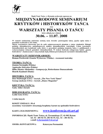 ____________________________________________________________________________ Śląski Teatr Tańca w Bytomiu serdecznie zaprasza na MIĘDZYNARODOWE SEMINARIUM KRYTYKÓW i HISTORYKÓW TAŃCA oraz WARSZTATY PISANIA O TAŃCU które odbędą się w dniach 30.06. – 11.07. 2008 W ramach seminarium omówione zostaną m.in. kwestie: postrzegania tańca, języka opisu tańca i przemian wyobraźni w XX wieku. Oferta warsztatowa kierowana jest do osób zainteresowanych pisaniem o tańcu (studentów filologii polskiej, dziennikarstwa, podyplomowych studiów dziennikarskich, teatrologii). Celem warsztatów dziennikarskich jest kształcenie osób, które w przyszłości podejmą tematykę tańca w publikacjach z wykorzystaniem róŜnych gatunków dziennikarskich. W trakcie festiwalu redagowana będzie „gazeta festiwalowa”. Zamieszczane w niej artykuły będą efektem prowadzonych warsztatów dziennikarskich. WARSZTATY DZIENNIKARSKIE: Roman Pawłowski (Gazeta Wyborcza / Polska) - recenzent teatralny TEORIA TAŃCA: Joanna Szymajda (Polska) Agnieszka Jelewska (Polska) Hilke Diemer (Holandia) – kompozycja, Rotterdamse Dansacademie Henrik Kaalund (Dania) HISTORIA TAŃCA Don McDonagh (USA) – krytyk „The New York Times” George Jackson (USA) – krytyk „Dance Magazine” KRYTYKA TAŃCA: Gaby Aldor (Izrael) BIBLIOGRAFIA TAŃCA: Leslie Getz (USA) i wielu innych KOSZT UDZIAŁU: 50 zł uczestnicy warsztatów otrzymują bezpłatny karnet na spektakle festiwalowe KARTA ZGŁOSZENIOWA: www.konferencja.stt.art.pl INFORMACJE: Śląski Teatr Tańca, ul. śeromskiego 27, 41-902 Bytom tel. 32 - 281 82 53, 281 82 55, fax. 32 – 281 82 52, e.mail: [email protected] OSOBA KONTAKTOWA: Katarzyna Furmaniuk