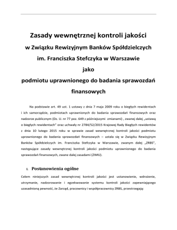 Zasady wewnętrznej kontroli jakości w Związku Rewizyjnym Banków Spółdzielczych im. Franciszka Stefczyka w Warszawie jako podmiotu uprawnionego do badania sprawozdań finansowych Na podstawie art. 49 ust. 1 ustawy z dnia 7 maja 2009 roku o biegłych rewidentach i ich samorządzie, podmiotach uprawnionych do badania sprawozdań finansowych oraz nadzorze publicznym (Dz. U. nr 77 poz. 649 z późniejszymi zmianami) , zwanej dalej „ustawą o biegłych rewidentach” oraz uchwały nr 2784/52/2015 Krajowej Rady Biegłych rewidentów z dnia 10 lutego 2015 roku w sprawie zasad wewnętrznej kontroli jakości podmiotu uprawnionego do badania sprawozdań finansowych – ustala się w Związku Rewizyjnym Banków Spółdzielczych im. Franciszka Stefczyka w Warszawie, zwanym dalej „ZRBS”, następujące zasady wewnętrznej kontroli jakości podmiotu uprawnionego do badania sprawozdań finansowych, zwane dalej zasadami (ZWKJ). I. Postanowienia ogólne Celem niniejszych zasad wewnętrznej kontroli jakości jest ustanowienie, wdrożenie, utrzymanie, nadzorowanie i egzekwowanie systemu kontroli jakości zapewniającego uzasadnioną pewność, że Zarząd, pracownicy i współpracownicy ZRBS, przestrzegają: Zasad wewnętrznej kontroli jakości określonych Uchwałą nr 2784/52/2015 Krajowej Rady Biegłych rewidentów z dnia 10 lutego 2015 roku w sprawie zasad wewnętrznej kontroli jakości podmiotu uprawnionego do badania sprawozdań finansowych, Międzynarodowego Standardu Kontroli Jakości (MSKJ lub IAASB) 1 „Kontrola jakości dla firm przeprowadzających badania i przeglądy sprawozdań finansowych oraz wykonujących inne usługi atestacyjne i pokrewne”, Międzynarodowego Standardu Rewizji Finansowej 220 Kontrola jakości badania sprawozdań finansowych Kodeksu etyki zawodowych księgowych Międzynarodowej Federacji Księgowych (IFAC) jako zasad etyki zawodowej biegłych rewidentów, a sprawozdania (opinia i raport) z wykonania zlecenia wydane przez ZRBS spełniają wymagania określone w art. 65 ust. 1-4 ustawy o rachunkowości oraz rozdziału IX i - XI Krajowego Standardu Rewizji Finansowej nr 1, stanowiącego załącznik do uchwały Nr 1608/38/2010 Krajowej Rady Biegłych Rewidentów z dnia 16 lutego 2010r. w sprawie krajowych standardów rewizji finansowej. Przez system wewnętrznej kontroli jakości rozumie się procesy zapewniające wykonywanie przez ZRBS jako podmiot uprawniony do badania sprawozdań finansowych czynności rewizji finansowej zgodnie z obowiązującymi: zasadami etyki zawodowej biegłych rewidentów, zwane dalej „zasadami etyki”, krajowymi standardami rewizji finansowej, zwanymi dalej „krajowymi standardami”, zasadami wewnętrznej kontroli jakości obowiązującymi w ZRBS, zwanymi dalej ZWKJ. II. System wewnętrznej kontroli jakości Związek Rewizyjny Banków Spółdzielczych im. Franciszka Stefczyka w Warszawie jako podmiot uprawniony do badania sprawozdań finansowych zapewnia, że czynności rewizji finansowej w jego imieniu dokonują: biegli rewidenci zatrudnieni w ZRBS na podstawie umowy o pracę, lustratorzy, będący asystentami biegłych rewidentów, również zatrudnieni w ZRBS na podstawie umowy o pracę, lustratorzy, będący asystentami biegłych rewidentów, również zatrudnieni w ZRBS na podstawie umowy cywilnoprawnej, biegli rewidenci uprawnieni do badania sprawozdań finansowych zatrudnieni w ZRBS na podstawie umowy cywilnoprawnej. Każdy pracownik oraz współpracownik ZRBS wykonujący czynności rewizji finansowej jest odpowiedzialny za wdrożenie i przestrzeganie wewnętrznych zasad kontroli jakości. III. Elementy 1. systemu wewnętrznej kontroli jakości Odpowiedzialność za jakość System wewnętrznej kontroli jakości w zakresie czynności rewizji finansowej obejmuje czynności sprawowane przez: Zarząd ZRBS, ze szczególnym uwzględnieniem odpowiedzialności za zarządzanie i promowanie kultury kontroli, ustanowienie i wprowadzenie wewnętrznych zasad kontroli jakości oraz wszystkich innych niezbędnych wskazówek podnoszących jakość wykonywanych zleceń, Dyrektorów delegatur w ramach przypisanych im obowiązków z zakresu organizacji pracy, w tym szczególnie nadzorowanie efektywności i jakości pracy wykonywanej przez podległych im pracowników, Kluczowych biegłych rewidentów i biegłych rewidentów wykonujących czynności rewizji finansowej, w zakresie przestrzegania ustanowionych przez Zarząd zasad i procedur wewnętrznych kontroli jakości, Weryfikatorów (osoby dokonujące kontroli jakości zlecenia), mające na celu przeprowadzenie obiektywnej oceny istotnych osądów i wniosków wyciągniętych przez zespół realizujący zlecenie, ocenę końcowych wniosków z badania sprawozdania finansowego oraz ocenę prawidłowości proponowanej opinii i raportu. Ostateczną odpowiedzialność za system kontroli jakości w ZRBS ponosi zgodnie z ustawą z dnia 29 września 1994 roku o rachunkowości (tekst jednolity Dz. U. z 2013 roku , poz. 330) kierownik podmiotu uprawnionego tj. Zarząd ZRBS. 2. Wymogi etyczne Nadzór nad przestrzeganiem zasad etyki zawodowej przez biegłych rewidentów wykonujących czynności rewizji finansowej w ZRBS sprawują Zarząd i Dyrektorzy delegatur. Zarząd ZRBS jest odpowiedzialny za: opracowanie, wdrożenie, nadzór i egzekwowanie zasad związanych z etyką, identyfikację niezbędnych zmian w polityce odnoszących się do etyki, dostarczanie wskazówek i prowadzenie konsultacji w sprawach związanych z etyką (np. niezależność, konflikt interesów), przechowywanie bazy danych wszystkich klientów – jednostek zainteresowania publicznego (dla celów niezależności), nadzorowanie zgodności z polityką i procedurami ZRBS we wszystkich sprawach etyki, raportowanie przypadków nieprzestrzegania zasad etyki, organizację szkoleń dla pracowników z zakresu etyki. Dyrektorzy delegatur w zakresie etyki odpowiadają za: poinformowanie wszystkich pracowników o obowiązku przestrzegania zasad n