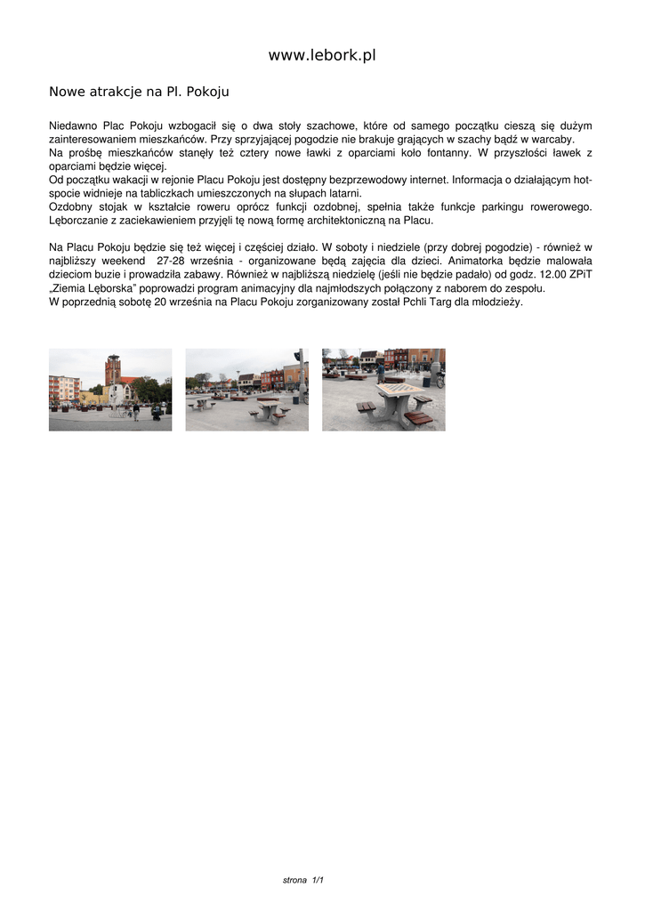 www.lebork.pl Nowe atrakcje na Pl. Pokoju Niedawno Plac Pokoju wzbogacił się o dwa stoły szachowe, które od samego początku cieszą się dużym zainteresowaniem mieszkańców. Przy sprzyjającej pogodzie nie brakuje grających w szachy bądź w warcaby. Na prośbę mieszkańców stanęły też cztery nowe ławki z oparciami koło fontanny. W przyszłości ławek z oparciami będzie więcej. Od początku wakacji w rejonie Placu Pokoju jest dostępny bezprzewodowy internet. Informacja o działającym hotspocie widnieje na tabliczkach umieszczonych na słupach latarni. Ozdobny stojak w kształcie roweru oprócz funkcji ozdobnej, spełnia także funkcje parkingu rowerowego. Lęborczanie z zaciekawieniem przyjęli tę nową formę architektoniczną na Placu. Na Placu Pokoju będzie się też więcej i częściej działo. W soboty i niedziele (przy dobrej pogodzie) - również w najbliższy weekend 27-28 września - organizowane będą zajęcia dla dzieci. Animatorka będzie malowała dzieciom buzie i prowadziła zabawy. Również w najbliższą niedzielę (jeśli nie będzie padało) od godz. 12.00 ZPiT „Ziemia Lęborska” poprowadzi program animacyjny dla najmłodszych połączony z naborem do zespołu. W poprzednią sobotę 20 września na Placu Pokoju zorganizowany został Pchli Targ dla młodzieży. strona 1/1 Powered by TCPDF (www.tcpdf.org)