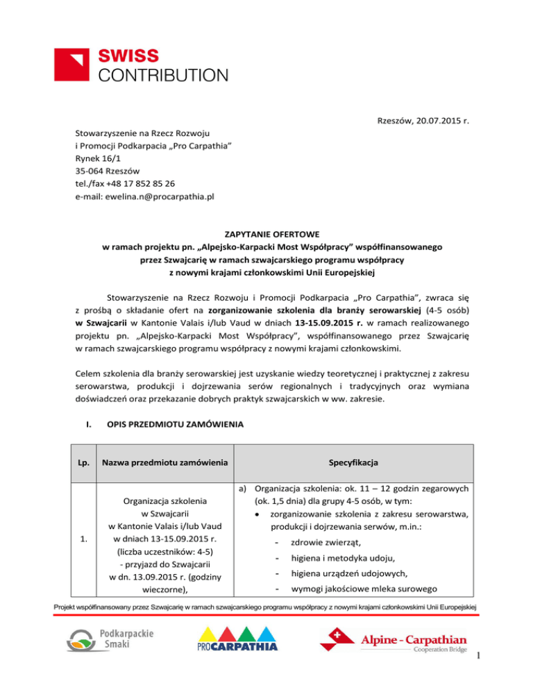 Rzeszów, 20.07.2015 r. Stowarzyszenie na Rzecz Rozwoju i Promocji Podkarpacia „Pro Carpathia” Rynek 16/1 35-064 Rzeszów tel./fax +48 17 852 85 26 e-mail: [email protected] ZAPYTANIE OFERTOWE w ramach projektu pn. „Alpejsko-Karpacki Most Współpracy” współfinansowanego przez Szwajcarię w ramach szwajcarskiego programu współpracy z nowymi krajami członkowskimi Unii Europejskiej Stowarzyszenie na Rzecz Rozwoju i Promocji Podkarpacia „Pro Carpathia”, zwraca się z prośbą o składanie ofert na zorganizowanie szkolenia dla branży serowarskiej (4-5 osób) w Szwajcarii w Kantonie Valais i/lub Vaud w dniach 13-15.09.2015 r. w ramach realizowanego projektu pn. „Alpejsko-Karpacki Most Współpracy”, współfinansowanego przez Szwajcarię w ramach szwajcarskiego programu współpracy z nowymi krajami członkowskimi. Celem szkolenia dla branży serowarskiej jest uzyskanie wiedzy teoretycznej i praktycznej z zakresu serowarstwa, produkcji i dojrzewania serów regionalnych i tradycyjnych oraz wymiana doświadczeo oraz przekazanie dobrych praktyk szwajcarskich w ww. zakresie. I. Lp. 1. OPIS PRZEDMIOTU ZAMÓWIENIA Nazwa przedmiotu zamówienia Organizacja szkolenia w Szwajcarii w Kantonie Valais i/lub Vaud w dniach 13-15.09.2015 r. (liczba uczestników: 4-5) - przyjazd do Szwajcarii w dn. 13.09.2015 r. (godziny wieczorne), Specyfikacja a) Organizacja szkolenia: ok. 11 – 12 godzin zegarowych (ok. 1,5 dnia) dla grupy 4-5 osób, w tym: zorganizowanie szkolenia z zakresu serowarstwa, produkcji i dojrzewania serwów, m.in.: - zdrowie zwierząt, - higiena i metodyka udoju, - higiena urządzeo udojowych, - wymogi jakościowe mleka surowego Projekt współfinansowany przez Szwajcarię w ramach szwajcarskiego programu współpracy z nowymi krajami członkowskimi Unii Europejskiej 1 - wyjazd do Polski 15.09.2015 r. (godziny południowe/ popołudniowe) przeznaczonego do produkcji serowarskiej bez termicznej jego obróbki, - wymogi sanitarne stawiane producentom produktów mleczarskich z mleka surowego, - różnice w termicznej obróbce mleka, - metody oraz wymogi sanitarne analiz jakości mleka, wyrobów gotowych oraz procesów produkcji, - produkcja sera "Fromage d'Alpage", dojrzewającego min. 90 dni, - produkcja "Tommes d'Alpage" dojrzewającego 30 dni, - affinage sera i tommes, - wady serów dojrzewających oraz ich pochodzenie, zapewnienie ekspertów w zakresie serowarstwa, zapewnienie miejsca szkolenia/ serowarni na potrzeby szkoleo praktycznych, zapewnienie materiałów szkoleniowych dla uczestników szkolenia. b) Zakwaterowanie – 2 noclegi dla 4-5 osób (hotel o standardzie min. 2 gwiazdki, pokoje jednoosobowe lub dwuosobowe), c) Wyżywienie(dla 4-5 osób), co najmniej: - 2 x śniadanie, - 2 x obiad dwudaniowy (+ kawa/herbata/zimne napoje), - 2 x kolacja (+ kawa/herbata/zimne napoje). d) Zapewnienie tłumacza polsko-francuskiego i francusko -polskiego; e) Zapewnienie transportu uczestników szkolenia: - z Genewy (lotnisko) zakwaterowania/ szkolenia, - na miejscu uczestników szkolenia, - z miejsca szkolenia/ zakwaterowania do na miejsce Projekt współfinansowany przez Szwajcarię w ramach szwajcarskiego programu współpracy z nowymi krajami członkowskimi Unii Europejskiej 2 f) Genewy (lotnisko); Przygotowanie programu szkolenia (najpóźniej do dn. 26.08.2015 r.). Oferent winien w całości zrealizowad zapytanie ofertowe. Nie dopuszcza się ofert częściowych i wariantowych. II. TRYB ZAMÓWIENIA Postępowanie prowadzone jest w trybie zapytania ofertowego w toku realizacji projektu „Alpejsko-Karpacki Most Współpracy” z zachowaniem zasady konkurencyjności. III. WALUTA W JAKIEJ PROWADZONE BĘDĄ ROZLICZENIA ZWIĄZANE Z REALIZACJĄ NINIEJSZEGO ZAPYTANIA OFERTOWEGO Cena oferty zostanie podana przez Wykonawcę w CHF i w odpowiadającej jej wartości w PLN, przeliczonej według średniego kursu NBP z dnia sporządzenia oferty przez Oferenta. Do porównania ofert zostanie przyjęty średni kurs NBP z dnia sporządzenia oferty przez Oferenta. IV. OPIS SPOSOBU PRZYGOTOWANIA OFERTY Oferent powinien stworzyd ofertę na formularzu ofertowym załączonym do niniejszego zapytania (załącznik). Oferta powinna byd: - opatrzona pieczątką firmową, - posiadad datę sporządzenia, - zawierad adres lub siedzibę oferenta, - podpisana. V. MIEJSCE ORAZ TERMIN SKŁADANIA OFERT 1. Oferta powinna byd przesłana za pośrednictwem: poczty elektronicznej na adres [email protected], poczty tradycyjnej na adres: Stowarzyszenie na Rzecz Rozwoju i Promocji Podkarpacia „Pro Carpathia”, Rynek 16/1, 35-064 Rzeszów lub dostarczona osobiście do siedziby biura Stowarzyszenia „Pro Carpathia” do dnia 4.08.2015 r. 2. Oferty złożone po terminie nie będą rozpatrywane. 3. Oferent może przed upływem terminu składania ofert zmienid lub wycofad swoją ofertę. 4. Zapytanie ofertowe zamieszczono na stronie www.podkarpackiesmaki.pl oraz www.procarpathia.pl Projekt współfinansowany przez Szwajcarię w ramach szwajcarskiego programu współpracy z nowymi krajami członkowskimi Unii Europejskiej 3 VI. INFORMACJE DOTYCZĄCE WYBORU NAJKORZYSTNIEJSZEJ OFERTY 1. Wykonawca usługi zostanie wyłoniony najpóźniej do dnia 5.08.2015 r. w oparciu o najkorzystniejszą cenowo ofertę. 2. Wykonawca usługi zostanie poinformowany drogą mailową. 3. Wynik najkorzystniejszej oferty zostanie ogłoszony na stronie internetowej www.podkarpackiesmaki.pl oraz www.procarpathia.pl. VII. OCENA OFERT Jedynym kryterium oceny ofert jest cena brutto - 100%1 za zorganizowanie szkolenia dla branży serowarskiej (4-5 osób) w Szwajcarii w Kantonie Valais i/lub Vaud w dniach 13-15.09.2015 r. Zamawiający odrzuci ofertę, jeżeli: - jej treśd nie odpowiada treści zapytania ofertowego, - zawiera rażąco niską cenę w stosunku do przedmiotu zamówienia. VIII. DODATKOWE INFORMACJE Dodatkowych informacji udziela Pani Ewelina Nycz pod numerem telefonu +48 17 852 85 26, +48 661 113 291 oraz adresem e-mail: [email protected] W t