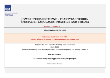 Uniwersytet Rzeszowski Al. Rejtana 16c 35-959 Rzeszów JĘZYKI SPECJALISTYCZNE – PRAKTYKA I TEORIA SPECIALIST LANGUAGES: PRACTICE AND THEORY Rzeszów, 16-17.09.016 Piątek/Friday 16.09.2016 Rejestracja/ Registration 9.00-9.45 Budynek A0 parter, ul. Pigonia 1/ A0 Building (main hall), Pigonia Str.1 Budynek AO, Duża Aula / AO Building, Main Lecture Hall 10.00-11.20 Otwarcie konferencji oraz Wykład plenarny 1 / Conference opening and Plenary Lecture Sambor Grucza O statusie ontycznym języków specjalistycznych Moderator/Chair: Paweł Bąk 1 1 11.20-11.45 Przerwa kawowa / Coffee break 11.45-13.45 Sesje równoległe / Parallel sessions Sesja/ Session 1 126 Sala/Room Sesja/ Session 2 127 Sala/Room Sesja/Session 3 Duża Aula/Main Lecture Hall Moderator/Chair: Teodor Hrehovčík Sesja/ Session 4 208 Ewa Szember-Czerwińska OALD 9th edition - 1948 pages that perfectly fit in your pocket Moderator/Chair: Olena Petrashchuk Moderator/Chair: Agnieszka Czech-Rogoyska 11.45-12.15 Patrycja Kąkol The language of Business English in the context of professional discourse Lucyna Falkiewicz-Wille Interpreting informal business meetings: A case study 12.15-12.45 Olena Radchenko Terminology of marketing: Conceptual Metaphor Emilia Wojtczak Leksyka w nauczaniu języków specjalistycznych (na przykładzie języka niemieckiego) Wanda Rydlewska-Wiktorowicz Jak bez problemu sprostać wymogom komunikacji biznesowej w firmie niemieckiej 12.45-13.15 Svitlana Vovchanska Scientific «holes» and «priorities» in research of LSP Sylwia Gierszal-Sławik Extra-linguistic knowledge as a key factor in quality community interpreting 13.15-13.45 Iryna Mischynska Professional jargon in business discourse Ewa Maria Majewska Hybrydy w słownictwie specjalistycznym niemiecko- i niderlandzkojęzycznych czasopism i literatury fachowej z dziedziny medycyny Katarzyna Wędrychowicz Dyskurs medyczny w nauczaniu języka niemieckiego dla potrzeb zawodowych – czyli jak przygotować studentów pielęgniarstwa do pracy w Niemczech Ewelina Kwiatek Features of scientific and technical texts in the field of land surveying and their implication for translation Bartosz Łuczak Computational approach to phraseology of academic journals of biology - lexical bundles and implications 13.45-14.45 Przerwa obiadowa / Lunch break 2 Sala/Room Katarzyna Łyp Język niemiecki codzienny i zawodowy - kompetencje na dwóch poziomach Budynek AO, Duża Aula / AO Building, Main Lecture Hall 14.45 -15.45 Wykład plenarny 2 / Plenary Lecture 2 Barbara Lewandowska-Tomaszczyk Corpora and collaborative translation tasks for general language and terminology development Moderator/ Chair: Marcin Grygiel 15.45 – 16.15 Przerwa kawowa / Coffee break 16.15-18.15 Sesje równoległe / Parallel sessions Sesja/Session 5 Sala/ Room 126 Moderator/Chair: Ewelina Kwiatek Sesja/Session 6 Sala/ Room 127 Moderator/Chair: Lucyna Falkiewicz-Wille Sesja/Session 7 Hall Duża Aula/Main Lecture Moderator/Chair: Barbara Walkiewicz 16.15-16.45 Teodor Hrehovčík What do the terms sworn translator and/or certified translator imply in different countries? Paweł Bąk Polskie i niemieckie świadectwa pracy. W poszukiwaniu ekwiwalencji 16.45-17.15 Katarzyna Fronczak Towards a description of stance in Internet mediated corporate discourse. An exploratory corpus-assisted study of selected stance adverbials in corporate blogs Ida Skubis Specialised language in Germany, Austria and Switzerland Łukasz Barciński Informative (specialist) and aesthetic (literary) texts – if, how and why they differ Joanna Woźniak Struktura semantyczna polskich i niemieckich terminów wielowyrazowych na przykładzie języka prawa Beata Kopecka Czym jest język specjalistyczny lotnictwa? – Próba definicji dla potrzeb badań językoznawczych w oparciu o grupy użytkowników oraz tworzone przez nich teksty Rafał Augustyn Wyzwania dydaktyki przekładu tekstów naukowych: styl i rejestr Marta Sobieszewska Tłumaczenie tekstów prawa a (nie)znajomość kontekstu językowo-prawnego Michał Organ Przekład elementów kulturowych w tłumaczeniu filmów dokumentalnych Małgorzata Bachan-Kołodziejska Zarządzanie sytuacyjne w nauczaniu języka specjalistycznego Aleksandra Gryc-Trelińska Terminologia prawnicza pochodząca z łaciny-ujęcie kontrastywne polsko-angielskie 17.15-17.45 17.45-18.15 3 Sobota/Saturday 17.09.2016 Sesja/Session 8 Duża Aula/Main Lecture Hall 8.15-8.45 Agnieszka Pietrus-Rajman Założenia koncepcyjne nauczania języków obcych w szkolnictwie wyższym na specjalnościach o znaczeniu priorytetowym dla gospodarki 09.00-10.30 Sesje równoległe / Parallel sessions Sesja/Session 9 Sala/ Room 126 Moderator/Chair: Beata Kopecka Sesja/Session 10 Sala/ Room 127 Moderator/Chair: Rafał Augustyn Sesja/Session 11 Hall Duża Aula/Main Lecture Moderator/Chair: Edyta Więcławska 09.00-9.30 9.30-10.00 10.00-10.30 Olena Petrashchuk Construct based approach to examiner/rater training in aviation language testing Barbara Walkiewicz Złożoność semiotyczna w perspektywie przekładu Dorota Domalewska Chalermpon Kaewjai Empowering students to become competent professionals: Course design for medical English language teaching Beata Szpingier Corpo a soma – o różnych poziomach komunikacji (powszechnym i specjalistycznym) we włoskim języku medycyny Izabela Olszak Multilingual students' reading strategies: An exploratory study to analyze variables influencing reading proficiency Agata Jabłońska Nazwy chorób rzadkich jako przedmiot badań socjologicznych, lingwistycznych i pedagogicznych w aspekcie stosowania nowoczesnych metod komunikacji w opiece zdrowotnej oraz wyzwań dla praktyki translatorskiej i dydaktyki medycznej 4 języka budowlanego Magdalena Łęska The letter reinvented – genre theory applied to the analysis of the letter to shareholders as an Investor Relations tool Izabela Bartkiewicz Legal instruments to ensure linguistic rights and security of the United Nations member states and of th