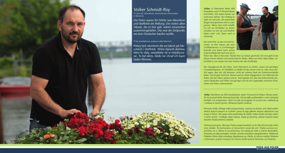 Volker Schmidt-Roy 47 Jahre alt, Unternehmer, ehrenamtlicher Ortsvorsteher in Mescherin Die Polen waren für Dörfer wie Mescherin und Staffelde die Rettung. Die vielen alten Häuser, die es hier gab, wären inzwischen zusammengefallen. Das war der Zeitpunkt, wo kein Deutscher kaufen wollte. ˛ 47 lat, przedsiebiorca, społeczny sołtys Mescherin Polacy byli ratunkiem dla wsi takich jak Mescherin i Staffelde. Wiele starych domów, ˛ które tu stały, zawaliłoby sie˛ w miedzyczasie. To był okres, kiedy nie chciał ich kupic´ . zaden Niemiec. Volker: In Mescherin leben 400 Einwohner, rund 15 Prozent davon sind Polen. Die ersten kamen vor rund neun Jahren. Von Anfang an habe ich versucht, die polnischen Bürger anzusprechen und zu integrieren. Wenn man nicht schafft, sie mit ins Dorfleben zu holen, schotten sie sich ab und bleiben lieber unter sich. Dann wird es schwierig. Der erste Pole, an den ich mich erinnere, ist Herr Kamer, der zwei Großbäckereien in Greifenhagen betreibt und damit auch seinen Lebensmittelpunkt nach wie vor in Polen hat. Aber er hat seine Töchter hier zur Schule geschickt. Die eine geht in die Klasse meines Sohnes und macht bald ihr Abitur. Wenn wir ihren Vater bitten, unterstützt er uns immer mit zwei Kuchen bei den Dorffesten. Der Hauptgrund für die Polen, nach Mescherin zu ziehen, waren die günstigen Grundstückspreise. Im Verhältnis zu Stettin ist das immer noch so. Man muss ehrlich sagen, dass die, die kommen, nicht am unteren Ende der Einkommenskette leben. Die bringen Geld mit, Wissen und vor allem Engagement. Die Mehrzahl der Polen, die hier leben, passen sich an. Auch glaube ich, dass die Unterschiede zwischen Deutschen und Polen viel geringer sind als die Gegensätze zwischen Deutschen und Polen untereinander. ´ Volker: Mescherin ma 300 mieszkanców, około 15 procent to Polacy. Pierwsi osied˛ ˛ ˛ ´ lili sie˛ tu przed około dziewiecioma laty. Od poczatku próbowałem z nimi nawiazac . . ˛ ˛ ´ ich w zycie wsi, oddziela˛ sie˛ kontakt i ich zintegrowac. ´ Jezeli nie uda sie˛ wciagnac ˛ i zostana˛ w swoim gronie. Wówczas bedzie trudniej. ´ Pierwszy Polak, którego sobie przypominam, nazywa sie˛ Kamer, jest włascicielem . dwóch duzych piekarni w Gryfinie i przez to jego główne miejsce aktywnosci ´ jest . ˛ w Polsce. Ale swoje córki posłał tutaj do szkoły. Jedna chodzi do klasy razem wciaz ˛ Kiedy go prosimy, zawsze wspiera nasze z moim synem i niedługo zdaje mature. ´ ˛ dwoma ciastami. wiejskie swieta ˛ dlaczego Polacy przeprowadzali sie˛ do Mescherina były niskie Główna˛ przyczyna, . ˛ tak jest. Trzeba uczciwie poceny działek. W porównaniu ze Szczecinem wciaz . . ˛ nie naleza˛ do osób o niskich dochodach. ´ ze ci, którzy tu sie˛ przenosza, wiedziec, . . ˛ ˛ ´´ Przywoza˛ ze soba˛ pieniadze, wiedze˛ i przede wszystkim zaangazowanie. Wiekszosc . . ˛ dopasowuje sie. ´ ˛ ze róznice miedzy ˛ ˛ Mysle, Polaków, którzy tutaj mieszkaja, Polakami . . . ´ a Niemcami sa˛ duzo mniejsze niz róznice wsród samych Niemców czy Polaków.
