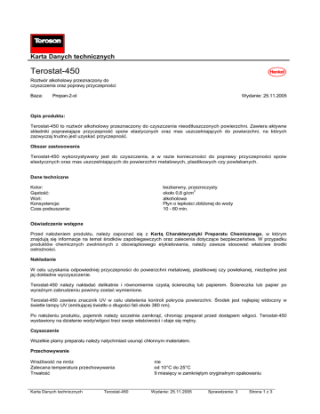 Karta Danych technicznych Terostat-450 Roztwór alkoholowy przeznaczony do czyszczenia oraz poprawy przyczepności Baza: Propan-2-ol Wydanie: 25.11.2005 Opis produktu: Terostat-450 to roztwór alkoholowy przeznaczony do czyszczenia nieodtłuszczonych powierzchni. Zawiera aktywne składniki poprawiające przyczepność spoiw elastycznych oraz mas uszczelniających do powierzchni, na których zazwyczaj trudno jest uzyskać przyczepność. Obszar zastosowania Terostat-450 wykorzystywany jest do czyszczenia, a w razie konieczności do poprawy przyczepności spoiw elastycznych oraz mas uszczelniających do powierzchni metalowych, plastikowych czy powlekanych. Dane techniczne Kolor: Gęstość: Woń: Konsystencja: Czas podsuszania: bezbarwny, przezroczysty 3 około 0,8 g/cm alkoholowa Płyn o lepkości zbliżonej do wody 10 - 60 min. Oświadczenie wstępne Przed nałożeniem produktu, należy zapoznać się z Kartą Charakterystyki Preparatu Chemicznego, w którym znajdują się informacje na temat środków zapobiegawczych oraz zalecenia dotyczące bezpieczeństwa. W przypadku produktów chemicznych zwolnionych z obowiązkowego etykietowania, należy zawsze stosować właściwe środki ostrożności. Nakładanie W celu uzyskania odpowiedniej przyczepności do powierzchni metalowej, plastikowej czy powlekanej, niezbędne jest jej dokładne wyczyszczenie. Terostat-450 należy nakładać delikatnie i równomiernie czystą ściereczką lub papierem. Ściereczka lub papier po wyraźnym zabrudzeniu powinny zostać wymienione. Terostat-450 zawiera znacznik UV w celu ułatwienia kontroli pokrycia powierzchni. Środek jest najlepiej widoczny w świetle lampy UV (emitującej światło o długości fali około 380 nm). Po nałożeniu produktu, pojemnik należy szczelnie zamknąć, chroniąc preparat przed dostępem wilgoci. Terostat-450 wystawiony na działanie wody/wilgoci traci swoje właściwości i staje się mętny. Czyszczenie Wszelkie plamy preparatu należy natychmiast usunąć chłonnym materiałem. Przechowywanie Wrażliwość na mróz Zalecana temperatura przechowywania Trwałość Karta Danych technicznych Terostat-450 nie od 10°C do 25°C 9 miesięcy w zamkniętym oryginalnym opakowaniu Wydanie: 25.11.2005 Sprawdzenie: 3 Strona 1 z 3 Opakowania Aluminiowa butelka Kanister 1 litr 10 litrów Zagrożenia/ zalecenia dotyczące bezpieczeństwa/ przepisy transportowe patrz: Karta Charakterystyki Preparatu Chemicznego Ważne Powyższe dane, w szczególności zalecenia dotyczące nakładania i stosowania oferowanych przez nas produktów, opierają się na naszej wiedzy i doświadczeniu. Z uwagi na różne materiały oraz warunki nakładania produktu, na które nie mamy wpływu, zalecamy przeprowadzenie testów, aby upewnić się, że dany produkt nadaje się do planowanego procesu lub zastosowania. Z wyjątkiem zamierzonych działań, jakiekolwiek zobowiązania na podstawie powyższych zaleceń lub jakichkolwiek konsultacji ustnych, są niniejszym wyraźnie wyłączone. Niniejsza Karta Danych Technicznych zastępuje wszelkie wcześniejsze wydania. Henkel AG & Co. KgaA Location Heidelberg D-69112 Heidelberg Tel.: +49 6221 704-0 Fax: +49 6221 704-698 Karta Danych technicznych Henkel Polska Sp. z o.o. ul. Domaniewska 41 PL-02-672 Warszawa Telefon (022) 56 56 200 Telefax (022) 56 56 222 Terostat-450 Wydanie: 25.11.2005 Sprawdzenie: 3 Strona 2 z 3 Karta Danych technicznych Terostat-450 Wydanie: 25.11.2005 Sprawdzenie: 3 Strona 3 z 3