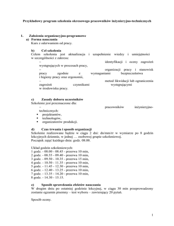 Przykładowy program szkolenia okresowego pracowników inżynieryjno-technicznych 1. Założenia organizacyjno-programowe a) Forma nauczania Kurs z oderwaniem od pracy. b) Cel szkolenia Celem szkolenia jest aktualizacja i uzupełnienie wiedzy i umiejętności w szczególności z zakresu: − identyfikacji i oceny zagrożeń występujących w procesach pracy, − organizacji pracy i stanowisk pracy zgodnie z wymaganiami bezpieczeństwa i higieny pracy oraz ergonomii, − metod likwidacji lub ograniczenia zagrożeń czynnikami występującymi w środowisku pracy. c) Zasady doboru uczestników Szkolenie jest przeznaczone dla: − technicznych: projektantów, technologów, organizatorów produkcji. pracowników inżynieryjno- d) Czas trwania i sposób organizacji Szkolenie realizowane będzie w ciągu 2 dni: dn/mm/rr w wymiarze po 8 godzin lekcyjnych dziennie, w jednej … osobowej grupie szkoleniowej. Początek zajęć każdego dnia: godz. 08.00. Układ godzin szkoleniowych: 1 godz. - 08.00 - 08.45 - przerwa 10 min, 2 godz. - 08.55 - 09.40 - przerwa 10 min, 3 godz. - 09.50 - 10.35 - przerwa 15 min, 4 godz. - 10.50 - 11.35 - przerwa 10 min, 5 godz. - 11.45 - 12.30 - przerwa 10 min, 6 godz. - 12.40 - 13.25 - przerwa 10 min, 7 godz. - 13.35 - 14.20 - przerwa 10 min, 8 godz. - 14.30 - 15.15. e) Sposób sprawdzania efektów nauczania W drugim dniu po ostatniej godzinie lekcyjnej, w ciągu 30 min przeprowadzony zostanie egzamin pisemny – test wyboru – zawierający 20 pytań. Sposób oceny. 1 Za każdą poprawną odpowiedź egzaminowany otrzyma 2 pkt. Suma punktów za wszystkie poprawne odpowiedzi = 40. Skala ocen: bardzo dobry, dobry, dostateczny, niedostateczny. Punktacja dla poszczególnych ocen: Bardzo dobry - 36 i więcej pkt (co najmniej 90%) Dobry - od 32 do 35 pkt (co najmniej 80%) Dostateczny - od 28 do 34 pkt (co najmniej 70%) Niedostateczny - do 27 pkt. 2. Lp. Plan szkolenia i zakres tematyczny Temat szkolenia Liczba godzin* Regulacje prawne z zakresu bezpieczeństwa i higieny pracy: 1. a) aktualne przepisy (z uwzględnieniem zmian), w tym dotyczące: − praw i obowiązków pracodawców i pracowników w zakresie bezpieczeństwa i higieny pracy oraz odpowiedzialności za naruszenie przepisów lub zasad bhp, − odpowiedzialności projektantów, konstruktorów i technologów związanej z wykonywanym zawodem, − wymagań bezpieczeństwa i higieny pracy dla budynków i pomieszczeń zakładów pracy (w tym pomieszczeń higienicznosanitarnych), − wymagań bezpieczeństwa i higieny pracy oraz ergonomii dla maszyn i innych urządzeń technicznych, − systemu oceny zgodności wyrobów z wymaganiami bezpieczeństwa i higieny pracy, − nadzoru i kontroli warunków pracy; 3 b) problemy związane z interpretacją niektórych przepisów. 2 Metody identyfikacji, analizy i oceny zagrożeń czynnikami szkodliwymi dla zdrowia, uciążliwymi i niebezpiecznymi występującymi w procesach pracy oraz oceny ryzyka związanego z tymi zagrożeniami: 2. a) identyfikacja, analiza i ocena zagrożeń czynnikami szkodliwymi dla zdrowia, uciążliwymi i niebezpiecznymi. − oświetlenie – czynnik szkodliwy środowiska pracy: natężenie oświetlenia, równomierność oświetlenia, adaptacja wzroku, czynniki decydujące o natężeniu oświetlenia przy pracy. Oświetlenie światłem naturalnym i elektrycznym – ocena jakości oświetlenia i ryzyka z tym związanego, − hałas: uciążliwe i szkodliwe oddziaływanie hałasu na narząd słuchu i na cały organizm, ocena ryzyka związanego z narażeniem na hałas, − źródła drgań w przemyśle: drgania oddziałujące na organizm człowieka przez kończyny górne oraz o ogólnym oddziaływaniu na organizm człowieka; zaburzenia w organizmie człowieka spowodowane oddziaływaniem drgań, ocena ryzyka związanego z narażeniem na drgania mechaniczne, − oddziaływanie pyłu na organizm człowieka: pyły o działaniu rakotwórczym, przykłady prac, przy których pracujący mogą być narażeni na działanie pyłów rakotwórczych, ocena narażenia na pyły przemysłowe i związanego z tym ryzyka zawodowego, − sposoby wchłaniania czynników chemicznych przez organizm człowieka oraz ich oddziaływania na człowieka. Ocena narażenia zawodowego na czynniki chemiczne i związanego z tym ryzyka zawodowego z uwzględnieniem substancji o oddziaływaniu kancerogennym, − czynniki biologiczne powodujące zagrożenia dla zdrowia ludzi: grupy ryzyka zachorowania na choroby zakaźne, grupy ryzyka w kontaktach człowiek – człowiek, możliwość kontaktu oraz inne kryteria stosowane do oceny stopnia szkodliwości; b) pomiary i badania czynników szkodliwych dla zdrowia; c) ocena ryzyka zawodowego związanego z zagrożeniami występującymi w procesie pracy. 3 3 Kształtowanie warunków pracy zgodnie z wymaganiami bezpieczeństwa pracy i ergonomii, w tym w zakresie metod likwidacji lub ograniczenia oddziaływania na pracowników czynników szkodliwych dla zdrowia, uciążliwych i niebezpiecznych (m.in. przez odpowiednie rozwiązania projektowe, technologiczne i organizacyjne): a) 3. zarządzanie bezpieczeństwem i higieną pracy: − wstęp, − cele zarządzania bezpieczeństwem, − dlaczego warto wdrażać system zarządzania bezpieczeństwem, − jak powinien wyglądać skuteczny system zarządzania bhp, − kiedy system zarządzania bhp jest skuteczny; b) metody kształtowania bezpiecznych i higienicznych warunków pracy: − techniczne metody ograniczania wybranych zagrożeń; − techniczne metody ograniczania zapylenia: rozprzestrzenianie się pyłu w ośrodku gazowym, zastosowanie odciągów miejscowych, separacja pyłów grubych, urządzenia odpylające, przykłady rozwiązań technicznych; − techniczne metody ograniczania drgań mechanicznych (wibracji): przyczyny powstawania drgań mechanicznych, eliminowanie źródeł drgań, tłumienie drgań, wibroizolacja maszyn i urządzeń, aktywne układy wibroizolacji, przykłady rozwiązań technicznych; −