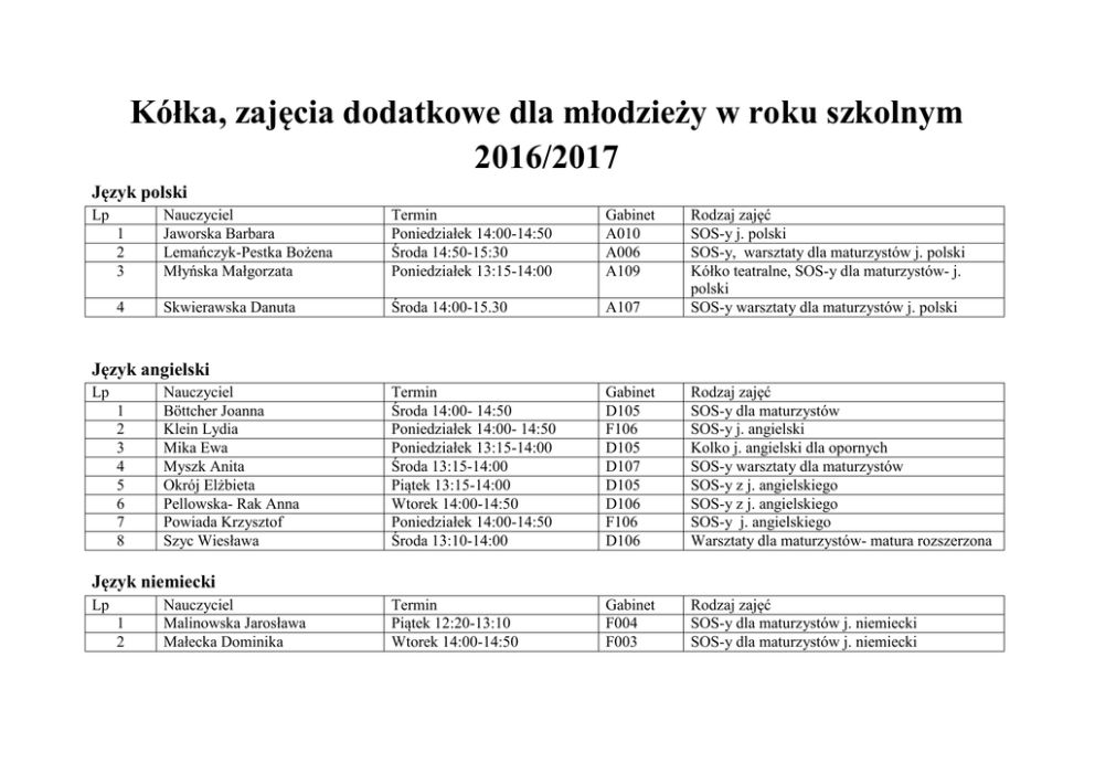 Kółka, zajęcia dodatkowe dla młodzieży w roku szkolnym 2016/2017