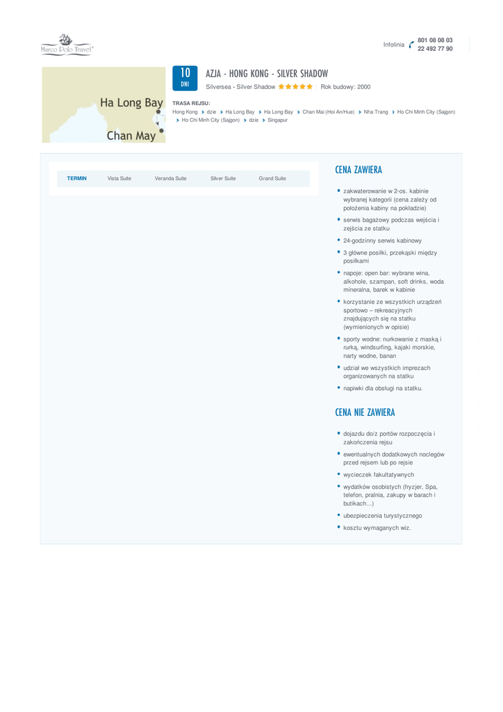 Infolinia 10 AZJA - HONG KONG - SILVER SHADOW DNI Silversea - Silver Shadow 801 08 08 03 22 492 77 90 | Rok budowy: 2000 TRASA REJSU: Hong Kong dzie Ha Long Bay Ho Chi Minh City (Sajgon) TERMIN Vista Suite Veranda Suite Silver Suite dzie Ha Long Bay Chan Mai (Hoi An/Hue) Nha Trang Ho Chi Minh City (Sajgon) Singapur Grand Suite CENA ZAWIERA zakwaterowanie w 2-os. kabinie wybranej kategorii (cena zależy od położenia kabiny na pokładzie) serwis bagażowy podczas wejścia i zejścia ze statku 24-godzinny serwis kabinowy 3 główne posiłki, przekąski między posiłkami napoje: open bar: wybrane wina, alkohole, szampan, soft drinks, woda mineralna, barek w kabinie korzystanie ze wszystkich urządzeń sportowo – rekreacyjnych znajdujących się na statku (wymienionych w opisie) sporty wodne: nurkowanie z maską i rurką, windsurfing, kajaki morskie, narty wodne, banan udział we wszystkich imprezach organizowanych na statku napiwki dla obsługi na statku. CENA NIE ZAWIERA dojazdu do/z portów rozpoczęcia i zakończenia rejsu ewentualnych dodatkowych noclegów przed rejsem lub po rejsie wycieczek fakultatywnych wydatków osobistych (fryzjer, Spa, telefon, pralnia, zakupy w barach i butikach...) ubezpieczenia turystycznego kosztu wymaganych wiz.