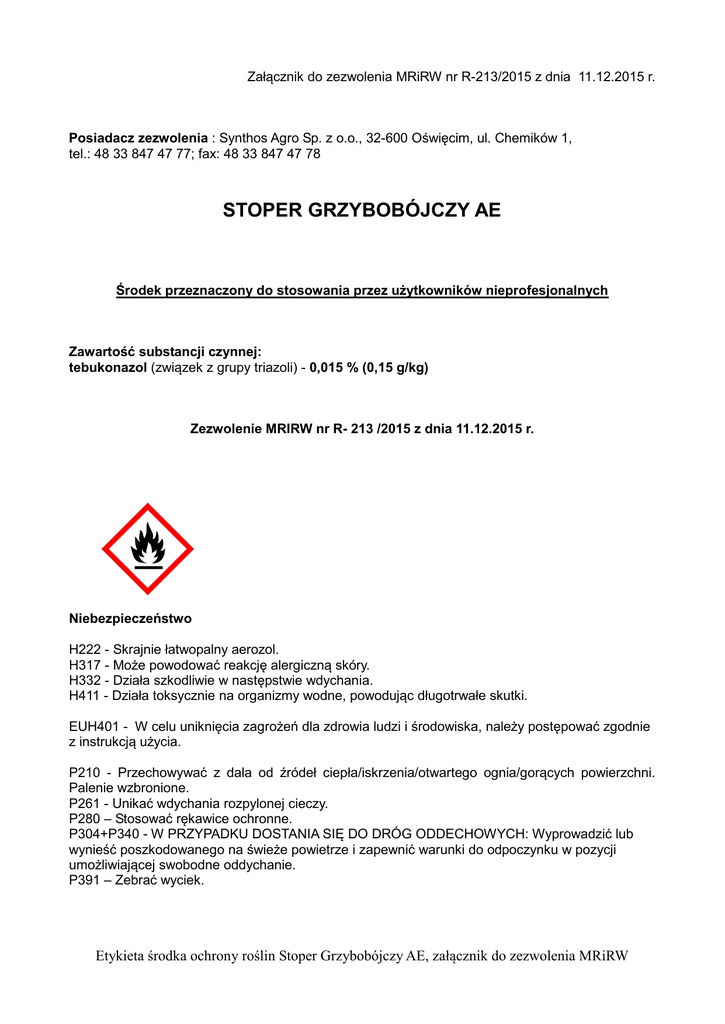 Załącznik do zezwolenia MRiRW nr R-213/2015 z dnia 11.12.2015 r. Posiadacz zezwolenia : Synthos Agro Sp. z o.o., 32-600 Oświęcim, ul. Chemików 1, tel.: 48 33 847 47 77; fax: 48 33 847 47 78 STOPER GRZYBOBÓJCZY AE Środek przeznaczony do stosowania przez użytkowników nieprofesjonalnych Zawartość substancji czynnej: tebukonazol (związek z grupy triazoli) - 0,015 % (0,15 g/kg) Zezwolenie MRIRW nr R- 213 /2015 z dnia 11.12.2015 r. Niebezpieczeństwo H222 - Skrajnie łatwopalny aerozol. H317 - Może powodować reakcję alergiczną skóry. H332 - Działa szkodliwie w następstwie wdychania. H411 - Działa toksycznie na organizmy wodne, powodując długotrwałe skutki. EUH401 - W celu uniknięcia zagrożeń dla zdrowia ludzi i środowiska, należy postępować zgodnie z instrukcją użycia. P210 - Przechowywać z dala od źródeł ciepła/iskrzenia/otwartego ognia/gorących powierzchni. Palenie wzbronione. P261 - Unikać wdychania rozpylonej cieczy. P280 – Stosować rękawice ochronne. P304+P340 - W PRZYPADKU DOSTANIA SIĘ DO DRÓG ODDECHOWYCH: Wyprowadzić lub wynieść poszkodowanego na świeże powietrze i zapewnić warunki do odpoczynku w pozycji umożliwiającej swobodne oddychanie. P391 – Zebrać wyciek. Etykieta środka ochrony roślin Stoper Grzybobójczy AE, załącznik do zezwolenia MRiRW OPIS DZIAŁANIA Stoper Grzybobójczy AE jest środkiem grzybobójczym w formie dyspensera aerozolowego o działaniu układowym do stosowania interwencyjnego w ochronie róż przed mączniakiem prawdziwym róży i czarną plamistością róży w uprawie amatorskiej w ogrodach działkowych i przydomowych. STOSOWANIE ŚRODKA Róża (uprawa w gruncie) mączniak prawdziwy róży, czarna plamistość róży Termin stosowania: Opryskiwać po zauważeniu pierwszych objawów choroby, z odległości 30-40 cm, krótkotrwałymi strumieniami trwającymi maksymalnie 2 sek. Opryskiwać dokładnie roślinę tak, aby liście były wilgotne, ale żeby nie tworzyły się ściekające krople. Maksymalna liczba zabiegów w sezonie wegetacyjnym: 2 Odstęp między zabiegami: co najmniej 14 dni. ŚRODKI OSTROŻNOŚCI I ZALECENIA STOSOWANIA Środek w pojemniku znajduje się pod ciśnieniem – zachować ostrożność. Środek stosować w temperaturze powyżej 12 0C. Środka nie stosować: − podczas silnego wiatru, − w czasie silnego nasłonecznienia. Środek stosować przemiennie ze środkami grzybobójczymi zawierającymi substancje z innych grup chemicznych, o odmiennym mechanizmie działania. WARUNKI BEZPIECZNEGO STOSOWANIA ŚRODKA Przed zastosowaniem środka należy poinformować o tym fakcie wszystkie zainteresowane strony, które mogą być narażone na znoszenie cieczy użytkowej i które zwróciły się o taką informację. Środki ostrożności dla osób stosujących środek: Nie jeść, nie pić ani nie palić podczas używania produktu. Stosować rękawice ochronne (nitrylowe). Dokładnie umyć ręce po użyciu. Nie rozpylać nad otwartym ogniem lub innym źródłem zapłonu. Pojemnik pod ciśnieniem. Nie przekłuwać ani nie spalać, nawet po zużyciu. Środki ostrożności związane z ochroną środowiska naturalnego: Nie zanieczyszczać wód środkiem ochrony roślin lub jego opakowaniem. Unikać zanieczyszczania wód poprzez rowy odwadniające z gospodarstw i dróg. W celu ochrony pszczół i innych owadów zapylających środek powinien być stosowany po wieczornym oblocie pszczół. Nie dopuścić do znoszenia cieczy użytkowej poza obszar stosowania środka. Okres od zastosowania środka do dnia, w którym na obszar, na którym zastosowano środek mogą wejść ludzie oraz zostać wprowadzone zwierzęta (okres prewencji): nie wchodzić do czasu całkowitego wyschnięcia cieczy użytkowej na powierzchni roślin. Etykieta środka ochrony roślin Stoper Grzybobójczy AE, załącznik do zezwolenia MRiRW Okres od ostatniego zastosowania środka do dnia zbioru rośliny uprawnej (okres karencji): nie dotyczy Okres od ostatniego zastosowania środka na rośliny przeznaczone na paszę do dnia w którym zwierzęta mogą być karmione tymi roślinami (okres karencji dla pasz): nie dotyczy Okres od ostatniego zastosowania środka na rośliny do dnia w którym można siać lub sadzić rośliny uprawiane następczo: nie dotyczy WARUNKI PRZECHOWYWANIA I BEZPIECZNEGO USUWANIA ŚRODKA OCHRONY ROŚLIN I OPAKOWANIA Chronić przed dziećmi. Środek ochrony roślin przechowywać: − w miejscach lub obiektach, w których zastosowano odpowiednie rozwiązania zabezpieczające przed skażeniem środowiska oraz dostępem osób trzecich, − w oryginalnych opakowaniach, w sposób uniemożliwiający kontakt z żywnością, napojami lub paszą. Chronić przed światłem słonecznym. Nie wystawiać na działanie temperatury przekraczającej 50 oC Zabrania się wykorzystywania opróżnionych opakowań po środkach ochrony roślin do innych celów. Niewykorzystany środek przekazać do podmiotu uprawnionego do odbierania odpadów niebezpiecznych. Opróżnione opakowania po środku zwrócić do sprzedawcy środków ochrony roślin będących środkami niebezpiecznymi. PIERWSZA POMOC Antidotum: brak, stosować leczenie objawowe. W razie konieczności zasięgnięcia porady lekarza, należy pokazać opakowanie lub etykietę. W PRZYPADKU DOSTANIA SIĘ DO DRÓG ODDECHOWYCH: Wyprowadzić lub wynieść poszkodowanego na świeże powietrze i zapewnić warunki do odpoczynku w pozycji umożliwiającej swobodne oddychanie. Okres ważności data produkcji Zawartość netto Nr partii - 3 lata Etykieta środka ochrony roślin Stoper Grzybobójczy AE, załącznik do zezwolenia MRiRW