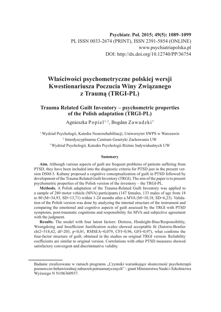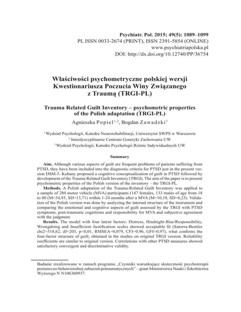 Psychiatr. Pol. 2015; 49(5): 1089–1099 PL ISSN 0033-2674 (PRINT), ISSN 2391-5854 (ONLINE) www.psychiatriapolska.pl DOI: http://dx.doi.org/10.12740/PP/36754 Właściwości psychometryczne polskiej wersji Kwestionariusza Poczucia Winy Związanego z Traumą (TRGI-PL) Trauma Related Guilt Inventory – psychometric properties of the Polish adaptation (TRGI-PL) Agnieszka Popiel 1, 2, Bogdan Zaw ad zk i 3 1 Wydział Psychologii, Katedra Neurorehabilitacji, Uniwersytet SWPS w Warszawie 2 Interdyscyplinarne Centrum Genetyki Zachowania UW 3 Wydział Psychologii, Katedra Psychologii Różnic Indywidualnych UW Summary Aim. Although various aspects of guilt are frequent problems of patients suffering from PTSD, they have been included into the diagnostic criteria for PTSD just in the present version DSM-5. Kubany proposed a cognitive conceptualization of guilt in PTSD followed by development of the Trauma Related Guilt Inventory (TRGI). The aim of the paper is to present psychometric properties of the Polish version of the inventory – the TRGI-PL. Methods. A Polish adaptation of the Trauma-Related Guilt Inventory was applied to a sample of 280 motor vehicle (MVA) participants (147 females, 133 males of age from 18 to 80 (M=34,93, SD=13,71) within 1-24 months after a MVA (M=10,18, SD=6,23). Validation of the Polish version was done by analyzing the internal structure of the instrument and comparing the emotional and cognitive aspects of guilt assessed by the TRGI with PTSD symptoms, post-traumatic cognitions and responsibility for MVA and subjective agreement with the judgment. Results. The model with four latent factors: Distress, Hindsight-Bias/Responsibility, Wrongdoing and Insufficient Justification scales showed acceptable fit (Satorra-Bentler chi2=518,62, df=203, p<0,01, RMSEA=0,079, CFI=0,96, GFI=0,97), what confirms the four-factor structure of guilt, obtained in the studies on original TRGI version. Reliability coefficients are similar to original version. Correlations with other PTSD measures showed satisfactory convergent and discriminative validity. Badanie zrealizowane w ramach programu „Czynniki warunkujące skuteczność psychoterapii poznawczo-behawioralnej zaburzeń potraumatycznych” – grant Ministerstwa Nauki i Szkolnictwa Wyższego N N106360937. 1090 Agnieszka Popiel, Bogdan Zawadzki Conclusions. The Polish adaptation of the Trauma-Related Guilt Inventory is a reliable and valid tool for assessing guilt as a multidimensional phenomenon, comprising emotional and several cognitive characteristics, in trauma survivors. Słowa klucze: PTSD, poczucie winy, TRGI, kwestionariusze Key words: PTSD, guilt, TRGI, questionnaire Wstęp Poczucie winy jest częstym zjawiskiem u osób cierpiących na pourazowe zaburzenie stresowe (PTSD). Jego znaczenie podkreślano dotychczas raczej w praktyce klinicznej, nie stanowiło bowiem kryterium wymaganego do diagnozy zaburzenia. Wraz z wprowadzeniem do DSM-5 w 2013 roku do kryteriów rozpoznawania PTSD pozycji obejmujących „utrwalony i zniekształcony sposób myślenia o przyczynach lub konsekwencjach traumatycznego wydarzenia, który prowadzi do obwiniania siebie lub innych osób” oraz „stałe poczucie winy” [1] można spodziewać się wzrostu zainteresowania zjawiskiem poczucia winy u ofiar traumatycznych przeżyć [1, 2]. Kilkanaście lat temu Kubany przeprowadził szczegółowe badania nad poczuciem winy u osób po traumatycznych przeżyciach. W ich wyniku zaproponował wielowymiarowe ujęcie zjawiska winy ze składowymi emocjonalnymi (dystresem/bólem emocjonalnym) i poznawczymi (zestawem dysfunkcjonalnych przekonań) [3]. Typowe dla poczucia winy dysfunkcjonalne przekonania zostały ujęte w następujące kategorie: (1) możliwość przewidzenia i zapobieżenia temu, co się stało (przekonanie, że wiedzieliśmy, co się wydarzy, zanim to się wydarzyło i mogliśmy użyć tej wiedzy, aby zapobiec negatywnym skutkom – rezultat zniekształcenia poznawczego zwanego „mądrość po szkodzie”), (2) brak usprawiedliwienia dla własnych zachowań, (3) pełna odpowiedzialność za spowodowanie negatywnego, czasem tragicznego w skutkach wydarzenia, np. „To się stało przeze mnie”, (4) pogwałcenie wyznawanych przez siebie zasad i wartości, czego skutkiem jest potępienie własnych czynów, oraz (5) ogólne, odzwierciedlające poczucie winy przekonania, np. „To, co zrobiłam/zrobiłem, jest niewybaczalne” [3]. Ten sposób rozumienia poczucia winy oraz zaproponowane na jego podstawie interwencje terapeutyczne zostały przedstawione w odrębnym artykule na łamach „Psychiatrii Polskiej” [2]. Kwestionariusz Poczucia Winy Związanego z Traumą Celem opracowania Kwestionariusza Poczucia Winy Związanego z Traumą (Trauma Related Guilt Inventory – TRGI) była ocena poznawczych i emocjonalnych aspektów poczucia winy związanego z konkretnym wydarzeniem traumatycznym (działania wojenne, wypadek samochodowy, przemoc fizyczna albo seksualna czy nagła śmierć bliskiej osoby). Narzędzie powstało na kanwie doświadczeń klinicznych, po przeanalizowaniu koncepcji teoretycznych i dostępnych narzędzi oceny poczucia winy oraz po wstępnej eksploracji zjawiska za pomocą ustrukturalizowanych wywiadów [4]. Kwestionariusz został skonstruowany zgodnie z podejściem teoretycznym [5], z zastosowaniem eksploracyjnych analiz czynnikowych [4]. W rezultacie kilku Właściwości psychometryczne polskiej wersji Kwestionariusza Poczucia Winy 1091 badań powstała ostateczna wersja kwestionariusza, na którą składają się 32 pozycje układające się w sześć skal, z których jedna (Skala Poznawczych Aspektów Winy) obejmuje trzy podskale. Każda pozycja oceniana jest na pięciostopniowej skali (od 1 do 5) określonej przez bieguny: od „zdecydowanie prawdziwe/zawsze prawdziwe” do „zupełnie nieprawdziwe/zawsze nieprawdziwe” (punktacja ośmiu pozycji jest odwrócona). Skala Dystresu obejmuje sześć pozycji, Skala Ogólnego Poc