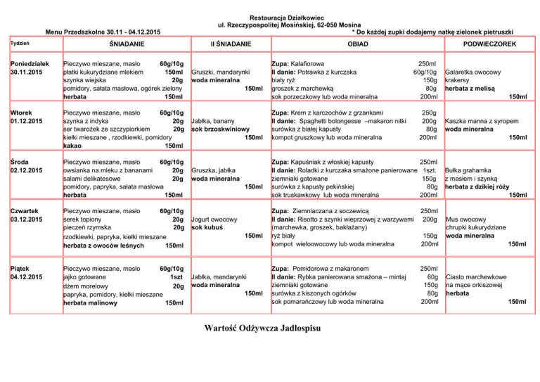 Menu Przedszkolne 30.11 - 04.12.2015 Tydzień Poniedziałek 30.11.2015 ŚNIADANIE Pieczywo mieszane, masło 60g/10g płatki kukurydziane mlekiem 150ml szynka wiejska 20g pomidory, sałata masłowa, ogórek zielony herbata 150ml Wtorek 01.12.2015 Pieczywo mieszane, masło 60g/10g szynka z indyka 20g ser twarożek ze szczypiorkiem 20g kiełki mieszane , rzodkiewki, pomidory kakao 150ml Środa 02.12.2015 Pieczywo mieszane, masło 60g/10g owsianka na mleku z bananami 20g salami delikatesowe 20g pomidory, papryka, sałata masłowa herbata 150ml Czwartek 03.12.2015 Piątek 04.12.2015 Pieczywo mieszane, masło 60g/10g serek topiony 20g pieczeń rzymska 20g rzodkiewki, papryka, kiełki mieszane herbata z owoców leśnych 150ml Pieczywo mieszane, masło 60g/10g jajko gotowane 1szt dżem morelowy 20g papryka, pomidory, kiełki mieszane herbata malinowy 150ml Restauracja Działkowiec ul. Rzeczypospolitej Mosińskiej, 62-050 Mosina * Do każdej zupki dodajemy natkę zielonek pietruszki II ŚNIADANIE Gruszki, mandarynki woda mineralna 150ml Jabłka, banany sok brzoskwiniowy 150ml Gruszka, jabłka woda mineralna 150ml Jogurt owocowy sok kubuś 150ml Jabłka, mandarynki woda mineralna 150ml OBIAD Zupa: Kalafiorowa II danie: Potrawka z kurczaka biały ryż groszek z marchewką sok porzeczkowy lub woda mineralna PODWIECZOREK 250ml 60g/10g 150g 80g 200ml Galaretka owocowy krakersy herbata z melisą 150ml Zupa: Krem z karczochów z grzankami II danie: Spaghetti bolongesse –makaron nitki surówka z białej kapusty kompot gruszkowy lub woda mineralna 250g 200g 80g 200ml Kaszka manna z syropem woda mineralna 150ml Zupa: Kapuśniak z włoskiej kapusty II danie: Roladki z kurczaka smażone panierowane ziemniaki gotowane surówka z kapusty pekińskiej sok truskawkowy lub woda mineralna 250ml 1szt. 150g 80g 200ml Bułka grahamka z masłem i szynką herbata z dzikiej róży 150ml Zupa: Ziemniaczana z soczewicą II danie: Risotto z szynki wieprzowej z warzywami (marchewka, groszek, bakłażany) ryż biały kompot wieloowocowy lub woda mineralna 250ml 200g Zupa: Pomidorowa z makaronem II danie: Rybka panierowana smażona – mintaj ziemniaki gotowane surówka z kiszonych ogórków sok pomarańczowy lub woda mineralna 250ml 60g 150g 80g 200ml Wartość Odżywcza Jadłospisu 150g 200ml Mus owocowy chrupki kukurydziane woda mineralna 150ml Ciasto marchewkowe na mące orkiszowej herbata 150ml Poniedziałek: 30.11.2015 Wartość kaloryczna 5 737,13 kJ - Tłuszcz 28,04% - Białko 12,79% - Węglowodany 59,17% Wtorek: 01.12.2015 Wartość kaloryczna 5 320,84 kJ - Tłuszcz 28,90% - Białko 15,42% - Węglowodany 55,68% Środa: 02.12.2015 Wartość kaloryczna 5 387,47 kJ - Tłuszcz 32,19% - Białko 15,31% - Węglowodany 52,50% Czwartek: 03.12.2015 Wartość kaloryczna 6 170,83 kJ - Tłuszcz 29,12% - Białko 14,46% - Węglowodany 56,42% Piątek: 04.12.2015 Wartość kaloryczna 4 032,64 kJ - Tłuszcz 32,18% - Białko 14,61% - Węglowodany 53,21%