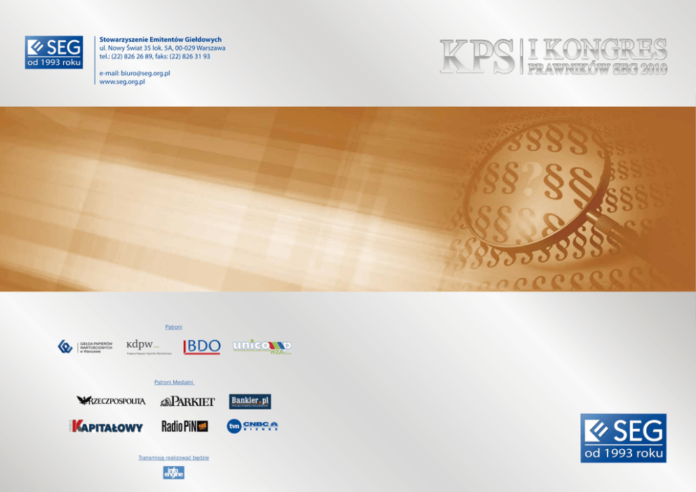 Stowarzyszenie Emitentów Giełdowych ul. Nowy Świat 35 lok. 5A, 00-029 Warszawa tel.: (22) 826 26 89, faks: (22) 826 31 93 e-mail: [email protected] www.seg.org.pl Patroni GIEŁDA PAPIERÓW WARTOŚCIOWYCH w Warszawie Patroni Medialni Transmisję realizować będzie Szanowni Państwo, W imieniu Stowarzyszenia Emitentów Giełdowych pragnę Państwa zaprosić na I Kongres Prawników Spółek Giełdowych SEG 2010, podczas którego przedyskutowane zostaną zagadnienia dotyczące organizacji Walnych Zgromadzeń oraz przeprowadzone zostanie fikcyjne WZ Zwykłej Spółki SA. Kongres odbędzie się w dniach 17-18 lutego br. w Centrum Kongresowo – Szkoleniowym „Magellan” w Bronisławowie. Implementacja Dyrektywy 2007/36/WE (o prawach akcjonariusza) poprzez nowelizację kodeksu spółek handlowych przyniosła istotne zmiany w dziedzinie organizacji WZA. Oznacza to bardzo wiele zmian w zakresie organizacji walnych zgromadzeń dla wszystkich uczestników rynku giełdowego – m.in. notowanych spółek, pośredników, inwestorów. Stowarzyszenie Emitentów Giełdowych podejmuje działania w tej kwestii od początku 2008 r., począwszy od etapu projektowania zmian regulacyjnych w prawie krajowym i konsultowania ich z notowanymi spółkami. Opracowaliśmy wspólnie z innymi instytucjami rynku broszurę z rekomendacjami dotyczącymi wewnętrznych uregulowań i dobrych praktyk działania spółek publicznych, instytucji rynku, firm inwestycyjnych, akcjonariuszy. Stanowi ona próbę odpowiedzi na niektóre wątpliwości związane z nowymi przepisami zmieniającymi zasady przeprowadzania WZA. Zorganizowaliśmy wiele konferencji i seminariów poświęconych WZA, w tym konferencję w formie walnego zgromadzenia fikcyjnej spółki publicznej, przeprowadzonego pod nowymi regulacjami. Uczestnicy zgromadzenia mogli aktywnie uczestniczyć w przebiegu „WZA” – zgłaszać wnioski formalne, modyfikacje uchwał, a także głosować (uwzględniając również podział głosów, czyli tzw. split voting). Możliwość aktywnego uczestnictwa dotyczyła zarówno osób zgromadzonych na sali, jak i „akcjonariuszy” uczestniczących w „walnym” za pośrednictwem Internetu. W związku z tym, że konferencja cieszyła się dużym zainteresowaniem, z przyjemnością organizujemy ją dla Państwa po raz kolejny wzbogacając o inne ważne aspekty. Podczas „WZA” przedyskutowanych zostanie możliwie wiele problemów natury prawnej, organizacyjnej i technicznej. Tematów do dyskusji jest bardzo wiele i nie wszystkie udało się zmieścić w programie – część z nich będziemy mogli zatem przedyskutować w mniej formalnej atmosferze. Do zobaczenia na Kongresie! Beata Stelmach Prezes Zarządu SEG Kongres przeznaczony jest wyłącznie dla Członków SEG. Udział w kongresie jest bezpłatny. Uczestnicy sami pokrywają koszt zakwaterowania. Zgłoszenia należy przesłać elektronicznie, po wypełnieniu formularza zgłoszeniowego dostępnego na stronie internetowej www.seg.org.pl lub po wypełnieniu załączonej karty zgłoszeniowej pod nr faxu: (22) 826 31 93. Liczba miejsc ograniczona. Decyduje kolejność zgłoszeń. I KONGRES PRAWNIKÓW SEG 2010 17-18 lutego 2010 r. 17 LUTEGO 12.00-13.45 Rejestracja uczestników konferencji/ Rejestracja uczestników ZWZ Zwykłej Spółki SA 13.00-13.45 Lunch 13.45-13.55 Otwarcie Kongresu 13.55-15.30 Walne zgromadzenie po nowemu – wstęp: l najważniejsze zmiany regulacyjne Mirosław Kachniewski, Stowarzyszenie Emitentów Giełdowych, Dyrektor Generalny l etap przygotowania walnego zgromadzenia (przygotowanie dokumentacji, ogłoszenie, record date) Bernard Białek, ING Bank Śląski, Radca prawny l proces obsługi walnego zgromadzenia z perspektywy KDPW Krzysztof Ołdak, Dział Operacyjny KDPW, Dyrektor l organizacja WZ a ochrona danych osobowych Andrzej Knap – Unicomp-WZA, Prezes Zarządu 15.30-15.50 Przerwa kawowa/Rejestracja uczestników ZWZ Zwykłej Spółki SA 15.50-18.30 ZWZ – Sesja I Zwykłą Spółkę SA reprezentować będą: - André Helin – BDO Numerica, Prezes Zarządu - Andrzej Knap – Unicomp-WZA, Prezes Zarządu - Leszek Koziorowski - Gessel Kancelaria Prawna, Wspólnik - Zbigniew Mrowiec - Kancelaria Allen&Overy, Partner l l l l l l otwarcie i wybór przewodniczącego lista obecności, prawidłowość zwołania, porządek obrad pierwsze głosowania uczestnictwo w WZ poprzez Internet Split voting rola biegłego rewidenta na WZA 18.45-20.15 Kulig z ogniskiem 20.30-24.00 Kolacja przy muzyce na żywo 18 LUTEGO 9.00-11.00 ZWZ – Sesja II 11.00-11.20 Przerwa kawowa 11.20-12.50 Podsumowanie prawne aspekty przerwy w obradach rola biegłego rewidenta na WZA – cd. l aspekty techniczne e-WZ (bezpieczeństwo, opóźnienia, formy komunikacji, problemy techniczne) l kwestie głosowania drogą korespondencyjną l zakończenie obrad l l l podsumowanie ZWZ Zwykłej Spółki SA Mirosław Kachniewski, Stowarzyszenie Emitentów Giełdowych, Dyrektor Generalny Leszek Koziorowski - Gessel Kancelaria Prawna, Wspólnik, Zbigniew Mrowiec - Kancelaria Allen&Overy, Partner l etap po zakończeniu walnego zgromadzenia (ogłoszenie treści uchwał, protokoły, sprzeciwy i ich konsekwencje) - Bernard Białek, ING Bank Śląski, Radca prawny l dalsze prace nad Rekomendacjami dotyczącymi Standardów WZA, Danuta Pajewska,Wardyńscy i Wspólnicy, Starszy Wspólnik dyskusja l 12.50 Zakończenie Kongresu www.seg.org.pl