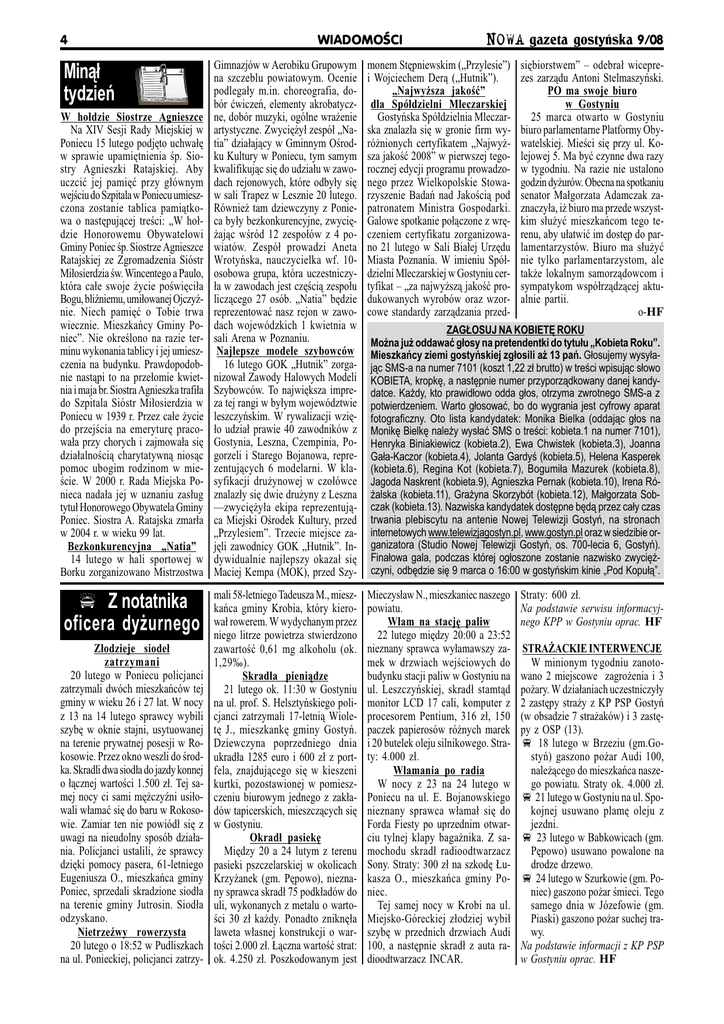 4 Min¹³ tydzieñ WIADOMOCI 4 4 W ho³dzie Siostrze Agnieszce Na XIV Sesji Rady Miejskiej w Poniecu 15 lutego podjêto uchwa³ê w sprawie upamiêtnienia p. Siostry Agnieszki Ratajskiej. Aby uczciæ jej pamiêæ przy g³ównym wejciu do Szpitala w Poniecu umieszczona zostanie tablica pami¹tkowa o nastêpuj¹cej treci: W ho³dzie Honorowemu Obywatelowi Gminy Poniec p. Siostrze Agnieszce Ratajskiej ze Zgromadzenia Sióstr Mi³osierdzia w. Wincentego a Paulo, która ca³e swoje ¿ycie powiêci³a Bogu, bliniemu, umi³owanej Ojczynie. Niech pamiêæ o Tobie trwa wiecznie. Mieszkañcy Gminy Poniec. Nie okrelono na razie terminu wykonania tablicy i jej umieszczenia na budynku. Prawdopodobnie nast¹pi to na prze³omie kwietnia i maja br. Siostra Agnieszka trafi³a do Szpitala Sióstr Mi³osierdzia w Poniecu w 1939 r. Przez ca³e ¿ycie do przejcia na emeryturê pracowa³a przy chorych i zajmowa³a siê dzia³alnoci¹ charytatywn¹ nios¹c pomoc ubogim rodzinom w miecie. W 2000 r. Rada Miejska Ponieca nada³a jej w uznaniu zas³ug tytu³ Honorowego Obywatela Gminy Poniec. Siostra A. Ratajska zmar³a w 2004 r. w wieku 99 lat. Bezkonkurencyjna Natia 14 lutego w hali sportowej w Borku zorganizowano Mistrzostwa p Z notatnika oficera dy¿urnego Z³odzieje siode³ zatrzymani 20 lutego w Poniecu policjanci zatrzymali dwóch mieszkañców tej gminy w wieku 26 i 27 lat. W nocy z 13 na 14 lutego sprawcy wybili szybê w oknie stajni, usytuowanej na terenie prywatnej posesji w Rokosowie. Przez okno weszli do rodka. Skradli dwa siod³a do jazdy konnej o ³¹cznej wartoci 1.500 z³. Tej samej nocy ci sami mê¿czyni usi³owali w³amaæ siê do baru w Rokosowie. Zamiar ten nie powiód³ siê z uwagi na nieudolny sposób dzia³ania. Policjanci ustalili, ¿e sprawcy dziêki pomocy pasera, 61-letniego Eugeniusza O., mieszkañca gminy Poniec, sprzedali skradzione siod³a na terenie gminy Jutrosin. Siod³a odzyskano. Nietrzewy rowerzysta 20 lutego o 18:52 w Pudliszkach na ul. Ponieckiej, policjanci zatrzy- NOWA gazeta gostyñska 9/08 Gimnazjów w Aerobiku Grupowym na szczeblu powiatowym. Ocenie podlega³y m.in. choreografia, dobór æwiczeñ, elementy akrobatyczne, dobór muzyki, ogólne wra¿enie artystyczne. Zwyciê¿y³ zespó³ Natia dzia³aj¹cy w Gminnym Orodku Kultury w Poniecu, tym samym kwalifikuj¹c siê do udzia³u w zawodach rejonowych, które odby³y siê w sali Trapez w Lesznie 20 lutego. Równie¿ tam dziewczyny z Ponieca by³y bezkonkurencyjne, zwyciê¿aj¹c wród 12 zespo³ów z 4 powiatów. Zespó³ prowadzi Aneta Wrotyñska, nauczycielka wf. 10osobowa grupa, która uczestniczy³a w zawodach jest czêci¹ zespo³u licz¹cego 27 osób. Natia bêdzie reprezentowaæ nasz rejon w zawodach wojewódzkich 1 kwietnia w sali Arena w Poznaniu. Najlepsze modele szybowców 16 lutego GOK Hutnik zorganizowa³ Zawody Halowych Modeli Szybowców. To najwiêksza impreza tej rangi w by³ym województwie leszczyñskim. W rywalizacji wziê³o udzia³ prawie 40 zawodników z Gostynia, Leszna, Czempinia, Pogorzeli i Starego Bojanowa, reprezentuj¹cych 6 modelarni. W klasyfikacji dru¿ynowej w czo³ówce znalaz³y siê dwie dru¿yny z Leszna zwyciê¿y³a ekipa reprezentuj¹ca Miejski Orodek Kultury, przed Przylesiem. Trzecie miejsce zajêli zawodnicy GOK Hutnik. Indywidualnie najlepszy okaza³ siê Maciej Kempa (MOK), przed Szy- monem Stêpniewskim (Przylesie) i Wojciechem Der¹ (Hutnik). Najwy¿sza jakoæ dla Spó³dzielni Mleczarskiej Gostyñska Spó³dzielnia Mleczarska znalaz³a siê w gronie firm wyró¿nionych certyfikatem Najwy¿sza jakoæ 2008 w pierwszej tegorocznej edycji programu prowadzonego przez Wielkopolskie Stowarzyszenie Badañ nad Jakoci¹ pod patronatem Ministra Gospodarki. Galowe spotkanie po³¹czone z wrêczeniem certyfikatu zorganizowano 21 lutego w Sali Bia³ej Urzêdu Miasta Poznania. W imieniu Spó³dzielni Mleczarskiej w Gostyniu certyfikat za najwy¿sz¹ jakoæ produkowanych wyrobów oraz wzorcowe standardy zarz¹dzania przed- mali 58-letniego Tadeusza M., mieszkañca gminy Krobia, który kierowa³ rowerem. W wydychanym przez niego litrze powietrza stwierdzono zawartoæ 0,61 mg alkoholu (ok. 1,29). Skrad³a pieni¹dze 21 lutego ok. 11:30 w Gostyniu na ul. prof. S. Helsztyñskiego policjanci zatrzymali 17-letni¹ Wioletê J., mieszkankê gminy Gostyñ. Dziewczyna poprzedniego dnia ukrad³a 1285 euro i 600 z³ z portfela, znajduj¹cego siê w kieszeni kurtki, pozostawionej w pomieszczeniu biurowym jednego z zak³adów tapicerskich, mieszcz¹cych siê w Gostyniu. Okrad³ pasiekê Miêdzy 20 a 24 lutym z terenu pasieki pszczelarskiej w okolicach Krzy¿anek (gm. Pêpowo), nieznany sprawca skrad³ 75 podk³adów do uli, wykonanych z metalu o wartoci 30 z³ ka¿dy. Ponadto zniknê³a laweta w³asnej konstrukcji o wartoci 2.000 z³. £¹czna wartoæ strat: ok. 4.250 z³. Poszkodowanym jest Mieczys³aw N., mieszkaniec naszego powiatu. W³am na stacjê paliw 22 lutego miêdzy 20:00 a 23:52 nieznany sprawca wy³amawszy zamek w drzwiach wejciowych do budynku stacji paliw w Gostyniu na ul. Leszczyñskiej, skrad³ stamt¹d monitor LCD 17 cali, komputer z procesorem Pentium, 316 z³, 150 paczek papierosów ró¿nych marek i 20 butelek oleju silnikowego. Straty: 4.000 z³. W³amania po radia W nocy z 23 na 24 lutego w Poniecu na ul. E. Bojanowskiego nieznany sprawca w³ama³ siê do Forda Fiesty po uprzednim otwarciu tylnej klapy baga¿nika. Z samochodu skrad³ radioodtwarzacz Sony. Straty: 300 z³ na szkodê £ukasza O., mieszkañca gminy Poniec. Tej samej nocy w Krobi na ul. Miejsko-Góreckiej z³odziej wybi³ szybê w przednich drzwiach Audi 100, a nastêpnie skrad³ z auta radioodtwarzacz INCAR. siêbiorstwem odebra³ wiceprezes zarz¹du Antoni Stelmaszyñski. PO ma swoje biuro w Gostyniu 25 marca otwarto w Gostyniu biuro parlamentarne Platformy Obywatelskiej. Mieci siê przy ul. Kolejowej 5. Ma byæ czynne dwa razy w tygodniu. Na razie nie ustalono godzin dy¿urów. Obecna na spotkaniu senator Ma³go
