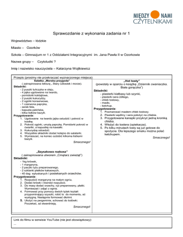 Sprawozdanie z wykonania zadania nr 1 Województwo – łódzkie Miasto – Ozorków Szkoła – Gimnazjum nr 1 z Oddziałami Integracyjnymi im. Jana Pawła II w Ozorkowie Nazwa grupy – Czytoludki ? Imię i nazwisko nauczyciela – Katarzyna Wojtkiewicz Przepis (prosimy nie przekraczać wyznaczonego miejsca): Sałatka „Morska przygoda” ( zainspirowana lekturą „ Stary człowiek i morze). Składniki: - 2 puszki tuńczyka w oleju, - 4 jajka ugotowane na twardo, - pomidorki koktajlowe, - 2 puszki kukurydzy, - 2 ogórki konserwowe, - 1 czerwona papryka, - serek feta, - kapusta pekińska, - kilka listków bazylii. Przygotowanie: 1. Ugotowane na twardo jajka ostudzić i pokroić w kostkę. 2. Pokroić ogórki, umytą paprykę. Pomidorki pokroić w ćwiartki, a kapustkę na kawałki. 3. Kukurydzę odcedzić. 4. Wszystkie składniki dodać kolejno do salaterki. 5. Wymieszać, na koniec ozdobić kilkoma listkami bazylii. Smacznego! „Szyszkowa rozkosz” ( zainspirowana utworem „Cmętarz zwieżąt”) Składniki: - 1kg krówek, - 1 margaryna, - 2 paczki ryżu preparowanego, - 2 szklanki płatków kakaowych, - 40 dag wyłuskanych i posiekanych orzechów. Przygotowanie: 1. Rozpuścić margarynę na małym ogniu. 2. Dodać krówki i również rozpuścić. 3. Do masy dodać orzechy, ryż preparowany, płatki. Wymieszać i zdjąć z ognia. 4. Formować przy pomocy dwóch łyżek kształt przypominający szyszki, robić to do momentu, aż wystygną. Następnie formować dłońmi. 5. Ułożyć na pergaminie, schować do lodówki. Poczekać, aż stwardnieją. Smacznego! Link do filmu w serwisie YouTube (nie jest obowiązkowy): ... … „Hot tosty” (powstały w oparciu o książkę „Dziennik cwaniaczka. Biała gorączka”) Składniki: - plasterki kiełbasy lub szynki, - plasterki sera żółtego, - chleb tostowy, - masło, - ketchup. Przygotowanie: 1. Posmarować masłem chleb tostowy. 2. Plasterki wędliny i sera położyć na chlebie. 3. Przygotowane kanapki przykryć jedną kromką chleba. 4. Włożyć do tostera (opiekacza). 5. Po kilku minutach tosty są już gotowe do spożycia. Dla lepszego smaku można polać ketchupem. Smacznego!