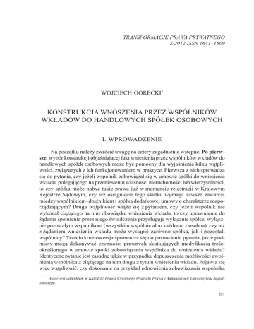 Transformacje Prawa Prywatnego 2/2012 ISSN 1641–1609 Wojciech Górecki* Konstrukcja wnoszenia przez wspólników wkładów do handlowych spółek osobowych I. Wprowadzenie Na początku należy zwrócić uwagę na cztery zagadnienia wstępne. Po pierwsze, wybór konstrukcji objaśniającej fakt wniesienia przez wspólników wkładów do handlowych spółek osobowych może być pomocny dla wyjaśnienia kilku wątpliwości, związanych z ich funkcjonowaniem w praktyce. Pierwsza z nich sprowadza się do pytania, czy jeżeli wspólnik zobowiązał się w umowie spółki do wniesienia wkładu, polegającego na przeniesieniu własności nieruchomości lub wierzytelności, to czy spółka może nabyć takie prawa już w momencie rejestracji w Krajowym Rejestrze Sądowym, czy też osiągnięcie tego skutku wymaga zawsze zawarcia między wspólnikiem–dłużnikiem i spółką dodatkowej umowy o charakterze rozporządzającym? Druga wątpliwość wiąże się z pytaniem, czy jeżeli wspólnik nie wykonał ciążącego na nim obowiązku wniesienia wkładu, to czy uprawnienie do żądania spełnienia przez niego świadczenia przysługuje wyłącznie spółce, wyłącznie pozostałym wspólnikom (wszystkim wspólnie albo każdemu z osobna), czy też z żądaniem wniesienia wkładu może wystąpić zarówno spółka, jak i pozostali wspólnicy? Trzecia kontrowersja sprowadza się do postawienia pytania, jakie podmioty mogą dokonywać czynności prawnych skutkujących modyfikacją treści określonego w umowie spółki zobowiązania wspólnika do wniesienia wkładu? Identyczne pytanie jest zasadne także w przypadku dopuszczenia możliwości zwolnienia wspólnika z ciążącego na nim długu z tytułu wniesienia wkładu. Pojawia się więc wątpliwość, czy dokonanie na przykład odnowienia zobowiązania wspólnika * Autor jest adiunktem w Katedrze Prawa Cywilnego Wydziału Prawa i Administracji Uniwersytetu Jagiellońskiego. 221 Transformacje Prawa Prywatnego 2/2012 do wniesienia wkładu może nastąpić w drodze umowy zawartej tylko między wspólnikiem–dłużnikiem oraz spółką, czy uprawnionymi do zawarcia takiej umowy są wyłącznie wspólnicy, czy też wreszcie aktualne są oba powyższe rozwiązania. Ustosunkowanie się do powyższych zastrzeżeń zależy w dużym stopniu od przyjętej koncepcji wnoszenia przez wspólników wkładów do spółki. Zróżnicowanie poglądów dotyczących tego zagadnienia skutkuje brakiem jednolitej oceny zasygnalizowanych kontrowersji. Po drugie, handlowymi spółkami osobowymi są spółka jawna, spółka partnerska, spółka komandytowa oraz spółka komandytowo–akcyjna. Wspomniana kwalifikacja wynika między innymi z art. 4 § 1 pkt 1 k.s.h. Ma więc w dużej mierze charakter formalny. Truizmem jest twierdzenie, że pomiędzy poszczególnymi typami spółek osobowych zachodzą znaczne odmienności, polegające na zróżnicowanym natężeniu elementów osobowych i kapitałowych. Dokonując pewnego uproszczenia, można więc powiedzieć, że na przykład spółka jawna ma charakter bardziej osobowy niż kapitałowy, podczas gdy w przypadku spółki komandytowo–akcyjnej jest raczej odwrotnie. Powyższa konstatacja skłania do zastanowienia, czy istnieje jeden wspólny model określający zasady wnoszenia przez wspólników wkładów do wszystkich handlowych spółek osobowych, czy też ze względu na istniejące różnice między nimi nie da się stworzyć w tym zakresie jednej i uniwersalnej koncepcji? W przypadku spółek jawnych, partnerskich i komandytowych należy przyjąć konieczność istnienia wspólnej konstrukcji wnoszenia przez wspólników wkładów. Wniosek ten wynika z tego, że do każdej z tych spółek znajduje zastosowanie (wprost albo odpowiednio) art. 48 § 2 i § 3 k.s.h., który ma podstawowe znaczenie dla określenia tego, w jaki sposób spółka nabywa prawa wnoszone przez wspólników tytułem wkładów. Nie bez znaczenia jest również to, że sytuacja każdej z tych spółek w okresie między zawarciem umowy spółki a jej rejestracją przedstawia się tak samo. W przypadku spółki komandytowo–akcyjnej, ze względu na zamieszczone odesłanie zarówno do przepisów o spółce jawnej (zob. art. 126 § 1 pkt 1 k.s.h.), jak i do przepisów o spółce akcyjnej (zob. art. 126 § 1 pkt 2 k.s.h.), sprawa staje się bardziej skomplikowana. W piśmiennictwie przeważnie twierdzi się, że mimo w znacznej mierze kapitałowego charakteru spółki komandytowo–akcyjnej jej sytuacja przed rejestracją jest identyczna jak pozostałych spółek osobowych. Podzielając ten pogląd, należy przyjąć, że może on przemawiać za istnieniem wspólnej konstrukcji wnoszenia wkładów do wszystkich handlowych spółek osobowych. Po trzecie, warto zwrócić uwagę na podobieństwa zachodzące między art. 251 k.s.h., art. 109 k.s.h., art. 134 k.s.h. a art. 171 k.h. oraz art. 335 k.h. Pierwsze podobieństwo polega na tym, że obecnie każda handlowa spółka osobowa, analogicznie do, jak poprzednio, każdej spółki kapitałowej, uzyskuje zdolność praw ną w momencie rejestracji. Drugie podobieństwo dotyczy zbliżonej regulacji sytua A.J. Witosz: Odpowiedzialność wspólników spółek osobowych. Przypadki szczególne, Warszawa 2008, s. 77–79. 222 Wojciech Górecki: Konstrukcja wnoszenia przez wspólników wkładów do handlowych spółek osobowych cji osób działających w imieniu tych spółek przed ich rejestracją. Istnienie powyższych podobieństw uzasadnia skorzystanie, w odniesieniu do problematyki wnoszenia wkładów do handlowych spółek osobowych, z dorobku doktryny i orzecznictwa powstałego podczas obowiązywania kodeksu handlowego, a dotyczącego problematyki wnoszenia wkładów do spółek kapitałowych. Po czwarte, należy przyjąć, nawiązując do dotychczasowego stanowiska piśmiennictwa oraz judykatury, że problematyka wnoszenia przez wspólników wkładów do handlowych spółek osobowych może opierać się na ko