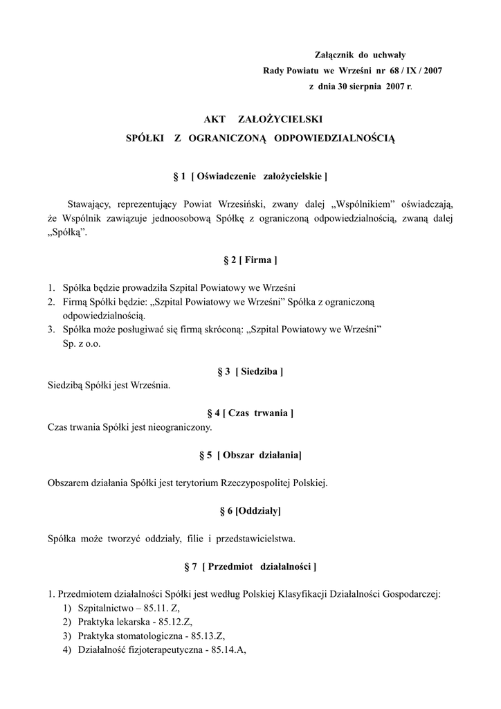 Załącznik do uchwały Rady Powiatu we Wrześni nr 68 / IX / 2007 z dnia 30 sierpnia 2007 r. AKT SPÓŁKI ZAŁOŻYCIELSKI Z OGRANICZONĄ ODPOWIEDZIALNOŚCIĄ § 1 [ Oświadczenie założycielskie ] Stawający, reprezentujący Powiat Wrzesiński, zwany dalej „Wspólnikiem” oświadczają, że Wspólnik zawiązuje jednoosobową Spółkę z ograniczoną odpowiedzialnością, zwaną dalej „Spółką”. § 2 [ Firma ] 1. Spółka będzie prowadziła Szpital Powiatowy we Wrześni 2. Firmą Spółki będzie: „Szpital Powiatowy we Wrześni” Spółka z ograniczoną odpowiedzialnością. 3. Spółka może posługiwać się firmą skróconą: „Szpital Powiatowy we Wrześni” Sp. z o.o. § 3 [ Siedziba ] Siedzibą Spółki jest Września. § 4 [ Czas trwania ] Czas trwania Spółki jest nieograniczony. § 5 [ Obszar działania] Obszarem działania Spółki jest terytorium Rzeczypospolitej Polskiej. § 6 [Oddziały] Spółka może tworzyć oddziały, filie i przedstawicielstwa. § 7 [ Przedmiot działalności ] 1. Przedmiotem działalności Spółki jest według Polskiej Klasyfikacji Działalności Gospodarczej: 1) Szpitalnictwo – 85.11. Z, 2) Praktyka lekarska - 85.12.Z, 3) Praktyka stomatologiczna - 85.13.Z, 4) Działalność fizjoterapeutyczna - 85.14.A, 5) 6) 7) 8) 9) Działalność ambulansów wypadkowych - 85.14.B, Działalność pielęgniarek i położnych - 85.14.C, Działalność psychologiczna i psychoterapeutyczna - 85.14.D, Działalność paramedyczna – 85.14.E, Działalność związana z ochroną zdrowia ludzkiego pozostała, gdzie indziej niesklasyfikowana - 85.14.F, 10) Całodobowa opieka wychowawcza dla dzieci i młodzieży - 85.31.A, 11) Pomoc społeczna pozostała, z zakwaterowaniem - 85.31.B, 12) Żłobki - 85.32.A, 13) Poradnie psychologiczno-pedagogiczne - 85.32.B, 14) Pomoc społeczna pozostała, bez zakwaterowania – 85.32.C, 15) Działalność związana z poprawą kondycji fizycznej – 93.04.Z, 16) Miejsca krótkotrwałego zakwaterowania pozostałe, gdzie indziej niesklasyfikowane – 55.23.Z, 17) Sprzedaż detaliczna wyrobów farmaceutycznych -52.31.Z, 18) Sprzedaż detaliczna wyrobów medycznych i ortopedycznych – 52.32.Z, 19) Sprzedaż detaliczna kosmetyków i artykułów toaletowych – 52.33.Z, 20) Kształcenie ustawiczne dorosłych i pozostałe formy kształcenia, gdzie indziej niesklasyfikowane - 80.42.B, 21) Działalność wspomagająca transport lądowy, pozostała - 63.21.Z. 2. W wypadku, gdy przepisy szczególne wymagają dla uruchomienia lub prowadzenia poszczególnych rodzajów działalności uzyskania koncesji lub innego zezwolenia, działalność ta zostanie podjęta po ich uzyskaniu. 3. Niepodjęcie lub zawieszenie tych rodzajów działalności, z wymienionych w ust.1., które wymagają koncesji lub innego zezwolenia, na skutek nieuzyskania, utraty lub zawieszenia tej koncesji lub zezwolenia, nie oznacza niemożliwości osiągnięcia celu Spółki, o którym mowa w art. 271 pkt 1. Kodeksu spółek handlowych. § 8 [ Kapitał zakładowy ] 1. Kapitał zakładowy Spółki wynosi 50.000,00 zł (słownie: pięćdziesiąt tysięcy złotych) i dzieli się na 10 (słownie: dziesięć) udziałów po 5.000,00 zł (słownie: pięć tysięcy złotych) każdy. 2. Udziały są równe i niepodzielne. 3. Wspólnik może posiadać więcej niż jeden udział. 4. Wspólnik pokrywa swoje udziały w Spółce wkładami pieniężnymi albo też aportem. 5. Wspólnik obejmuje udziały w następujący sposób: Powiat Wrzesiński obejmuje 10 (słownie: dziesięć ) udziałów po 5.000,00 zł ( słownie: pięć tysięcy złotych) każdy, o łącznej wartości 50.000,00 zł ( słownie: pięćdziesiąt tysięcy złotych ) i pokrywa je w całości gotówką. § 9 [ Zmiany kapitału ] 1. Kapitał zakładowy Spółki może zostać podwyższony do kwoty nie przewyższającej 50.000.000,00 zł (słownie: pięćdziesiąt milionów złotych ), jednorazowo lub sukcesywnie, w formie pieniężnej lub niepieniężnej (w tym także dopuszcza się zmianę wartości udziałów), uchwałą Zgromadzenia Wspólników w okresie do dnia 31.12.2022 r. Takie podwyższenie kapitału zakładowego nie stanowi zmiany umowy Spółki. 2. Kapitał zakładowy Spółki może być obniżony na zasadach przewidzianych w Kodeksie spółek handlowych. 3. Warunki i tryb podwyższenia oraz obniżenia kapitału zakładowego określa uchwała Zgromadzenia Wspólników. § 10 [ Dopłaty ] Zgromadzenie Wspólników może zobowiązać Wspólnika do wniesienia dopłat w wysokości, do dwukrotnej wartości posiadanych udziałów, na warunkach ustalonych uchwałą Zgromadzenia Wspólników, pod warunkiem, iż uchwalenie i wniesienie dopłat będzie zgodne z przepisami prawa obowiązującymi Wspólnika. § 11 [ Zbycie i obciążenie udziałów ] Zbycie lub zastawienie udziału lub udziałów na rzecz osoby trzeciej wymaga wcześniej zgody Rady Powiatu we Wrześni oraz zgody Spółki wyrażonej uchwałą Zgromadzenia Wspólników. § 12 [ Umorzenie udziałów ] Udział może być umorzony, uchwałą Zgromadzenia Wspólników, z zachowaniem przepisów o obniżeniu kapitału zakładowego lub z czystego zysku. W przypadku umorzenia udziału Wspólnikowi przysługuje ekwiwalent w wysokości wartości bilansowej udziału, jaki wynika ze sprawozdania finansowego na koniec poprzedniego roku obrotowego. § 13 [ Wynik finansowy ] 1. O podziale zysku za rok obrotowy lub pokryciu strat decyduje każdorazowo uchwałą Zgromadzenie Wspólników. 2. Zysk wynikający z rocznego bilansu może zostać wyłączony w części lub całości od podziału, z przeznaczeniem na fundusze celowe. Uchwałę w tym przedmiocie podejmuje Zgromadzenie Wspólników. § 14 [ Władze Spółki ] Władzami Spółki są: 1) Zgromadzenie Wspólników, 2) Zarząd, 3) Rada Nadzorcza. § 15 [ Zgromadzenie Wspólników ] 1. 2. 3. 4. Funkcję Zgromadzenia Wspólników pełni Zarząd Powiatu we Wrześni. Zgromadzenia Wspólników odbywają się w siedzibie 