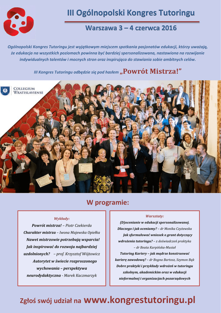 III Ogólnopolski Kongres Tutoringu Warszawa 3 – 4 czerwca 2016 Ogólnopolski Kongres Tutoringu jest wyjątkowym miejscem spotkania pasjonatów edukacji, którzy uważają, że edukacja na wszystkich poziomach powinna być bardziej spersonalizowana, nastawiona na rozwijanie indywidualnych talentów i mocnych stron oraz inspirująca do stawiania sobie ambitnych celów. III Kongres Tutoringu odbędzie się pod hasłem W programie: Warsztaty: Wykłady: Powrót mistrza! – Piotr Czekierda Charakter mistrza – Iwona Majewska Opiełka Nawet mistrzowie potrzebują wsparcia! (D)ocenianie w edukacji spersonalizowanej. Dlaczego i jak oceniamy? – dr Monika Czyżewska Jak sformułować wniosek o grant dotyczący wdrożenia tutoringu? – z doświadczeń praktyka Jak inspirować do rozwoju najbardziej – dr Beata Karpińska-Musiał uzdolnionych? – prof. Krzysztof Wójtowicz Tutoring Kariery – jak mądrze konstruować Autorytet w świecie rozproszonego wychowania – perspektywa neurodydaktyczna - Marek Kaczmarzyk Zgłoś swój udział na karierę zawodową? – dr Bogna Bartosz, Szymon Bąk Dobre praktyki i przykłady wdrożeń w tutoringu szkolnym, akademickim oraz w edukacji nieformalnej i organizacjach pozarządowych www.kongrestutoringu.pl