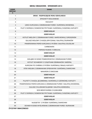 MENU OBIADOWE - WRZESIEŃ 2014 DZIEŃ# MIESIĄC A DANIE 1 BRAK - ROZPOCZĘCIE ROKU SZKOLNEGO 2 SPAGHETTI BOLOGNESE 3 RACUCHY 4 UDKO KURCZAKA Z ZIEMNIAKAMI PUREE I SURÓWKĄ WIOSENNĄ 5 FILET Z DORSZA Z DOMOWYMI FRYTKAMI I SURÓWKĄ Z KISZONEJ KAPUSTY 6 DZIEŃ WOLNY 7 DZIEŃ WOLNY 8 KOTLET MIELONY Z ZIEMNIAKAMI PUREE I MARCHEWKĄ Z GROSZKIEM 9 GULASZ WOŁOWY Z KASZĄ GRYCZANĄ I SAŁATKĄ Z BURAKÓW 10 PANIEROWANA PIERŚ KURCZAKA Z RYŻEM I SAŁATKĄ COLESLAW 11 CARBONARA 12 PIEROGI RUSKIE Z CEBULKĄ 13 DZIEŃ WOLNY 14 DZIEŃ WOLNY 15 GOŁĄBKI W SOSIE POMIDOROWYM Z ZIEMNIAKAMI PUREE 16 KOTLET SCHABOWY Z CZĄSTKAMI ZIEMNIAKÓW I MIZERIĄ 17 KURCZAK PO CHIŃSKU Z RYŻEM I SURÓWKĄ Z BIAŁEJ KAPUSTY 18 STEK WIEJSKI Z ZIEMNIAKAMI OPIEKANYMI I SURÓWKĄ Z MARCHWII 19 MAKARON Z OWOCAMI 20 DZIEŃ WOLNY 21 DZIEŃ WOLNY 22 PULPETY Z KASZĄ JĘCZMIENNĄ I SURÓWKĄ Z CZERWONEJ KAPUSTY 23 PANIEROWANA PIERŚ KURCZAKA Z ZIEMNIAKAMI PUREE I SAŁATKĄ WIOSENNĄ 24 GULASZ Z KLUSKAMI ŚLĄSKIMI I SAŁATKĄ SZWEDZKĄ 25 SOS MEKSYKAŃSKI Z KUSKUSEM 26 FILET Z DORSZA Z DOMOWYMI FRYTKAMI I SURÓWKĄ Z KISZONEJ KAPUSTY 27 DZIEŃ WOLNY 28 DZIEŃ WOLNY 29 NUGGETSY Z RYŻEM I SURÓWKĄ Z MARCHWII 30 SCHAB W SOSIE MYŚLIWSKIM Z ZIEMNIAKAMI PUREE I BURAKAMI ŻYCZYMY SMACZNEGO