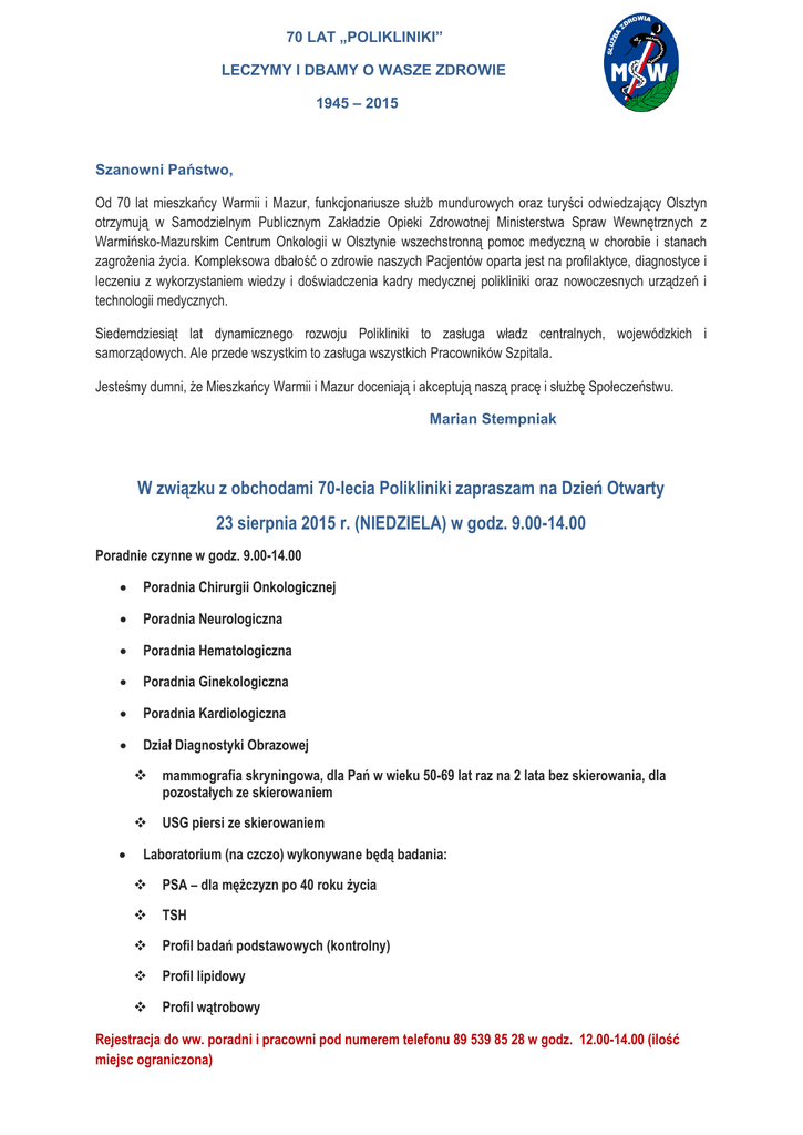 70 LAT „POLIKLINIKI” LECZYMY I DBAMY O WASZE ZDROWIE 1945 – 2015 Szanowni Państwo, Od 70 lat mieszkańcy Warmii i Mazur, funkcjonariusze służb mundurowych oraz turyści odwiedzający Olsztyn otrzymują w Samodzielnym Publicznym Zakładzie Opieki Zdrowotnej Ministerstwa Spraw Wewnętrznych z Warmińsko-Mazurskim Centrum Onkologii w Olsztynie wszechstronną pomoc medyczną w chorobie i stanach zagrożenia życia. Kompleksowa dbałość o zdrowie naszych Pacjentów oparta jest na profilaktyce, diagnostyce i leczeniu z wykorzystaniem wiedzy i doświadczenia kadry medycznej polikliniki oraz nowoczesnych urządzeń i technologii medycznych. Siedemdziesiąt lat dynamicznego rozwoju Polikliniki to zasługa władz centralnych, wojewódzkich i samorządowych. Ale przede wszystkim to zasługa wszystkich Pracowników Szpitala. Jesteśmy dumni, że Mieszkańcy Warmii i Mazur doceniają i akceptują naszą pracę i służbę Społeczeństwu. Marian Stempniak W związku z obchodami 70-lecia Polikliniki zapraszam na Dzień Otwarty 23 sierpnia 2015 r. (NIEDZIELA) w godz. 9.00-14.00 Poradnie czynne w godz. 9.00-14.00 Poradnia Chirurgii Onkologicznej Poradnia Neurologiczna Poradnia Hematologiczna Poradnia Ginekologiczna Poradnia Kardiologiczna Dział Diagnostyki Obrazowej mammografia skryningowa, dla Pań w wieku 50-69 lat raz na 2 lata bez skierowania, dla pozostałych ze skierowaniem USG piersi ze skierowaniem Laboratorium (na czczo) wykonywane będą badania: PSA – dla mężczyzn po 40 roku życia TSH Profil badań podstawowych (kontrolny) Profil lipidowy Profil wątrobowy Rejestracja do ww. poradni i pracowni pod numerem telefonu 89 539 85 28 w godz. 12.00-14.00 (ilość miejsc ograniczona) DODATKOWE ATRAKCJE: W godz. 9.00-14.00 na terenie szpitala (parking przy budynku E, F, G) będą umiejscowione stoiska partnerów, którzy będą promować zdrowy i aktywny tryb życia. Wojewódzka Stacja Sanitarno-Epidemiologiczna w Olsztynie – stanowisko informacyjne na temat zdrowego stylu życia, pomiary dwutlenku węgla w wydychanym powietrzu) Łęgajny/Casablanca (stoisko ze zdrową żywnością) Body Perfekt: - godz. 11.00 maraton spinningowy, 12.00 warsztaty szkoły pleców, od 13.00 zumba Warmiolandia – dmuchańce dla dzieci Stoisko z bielizną profilaktyczną – barter Stoisko NFZ z informacjami na temat praw pacjenta Rejestracja potencjalnych dawców komórek macierzystych Karetka do zwiedzania, kurs pierwszej pomocy Zwiedzanie zakładu radioterapii.